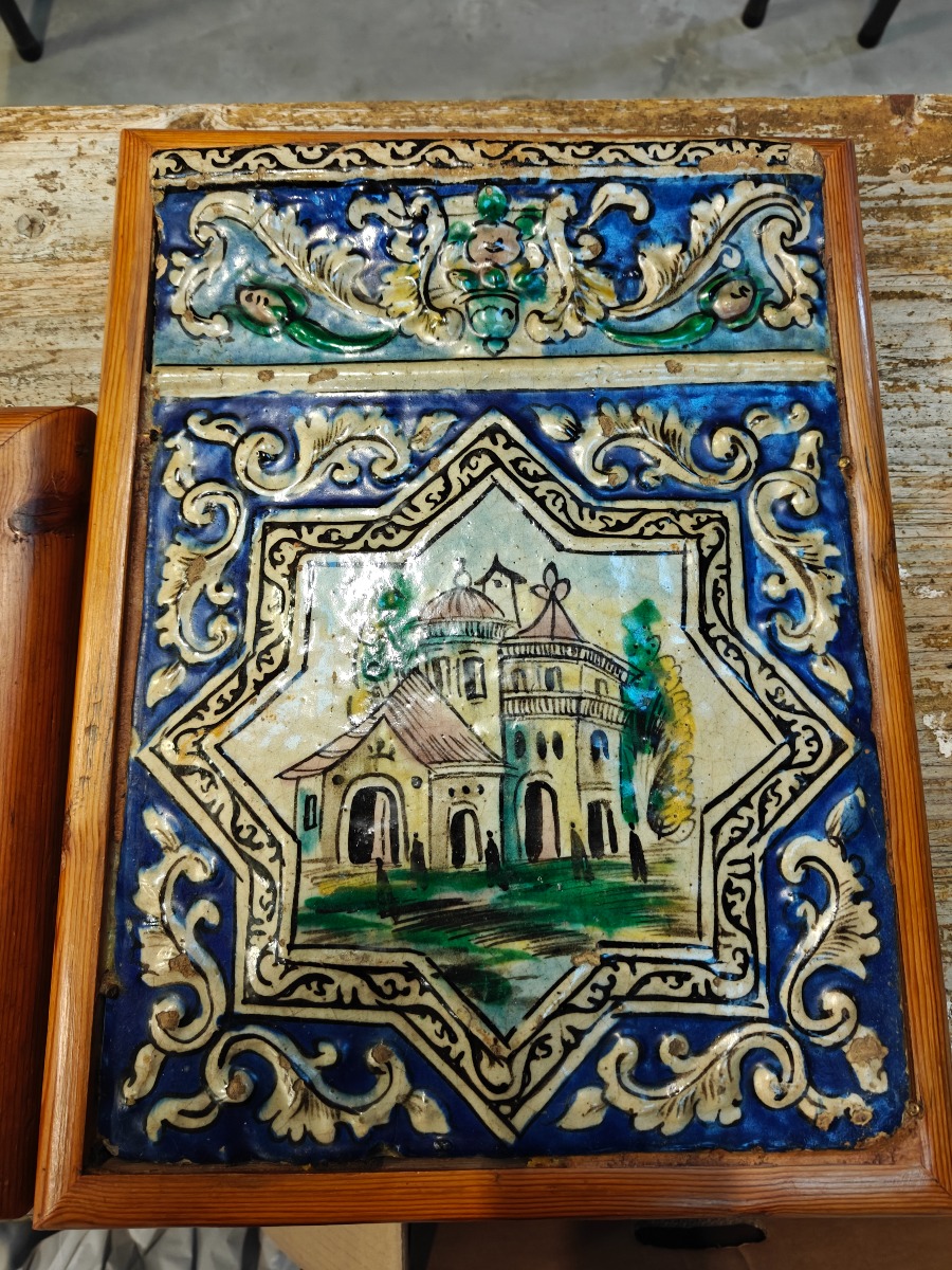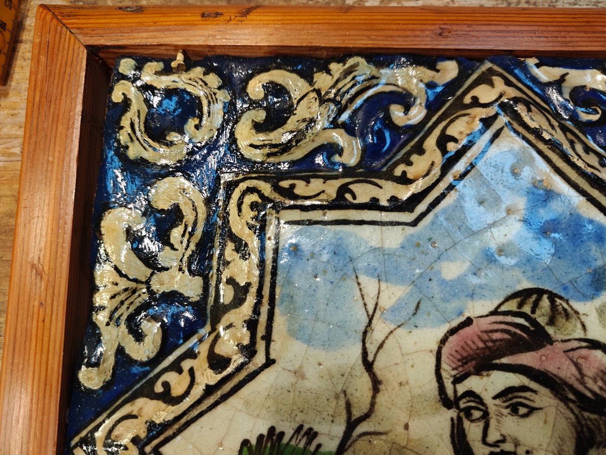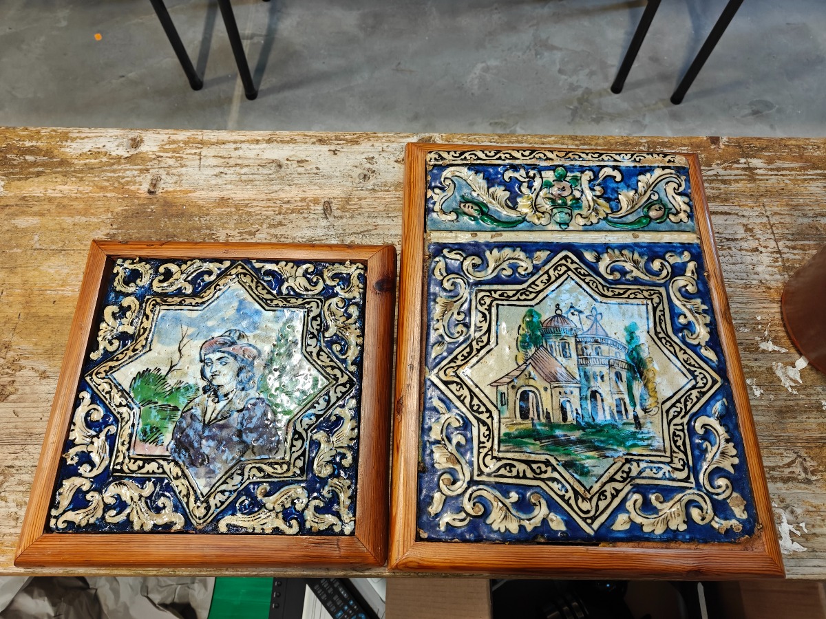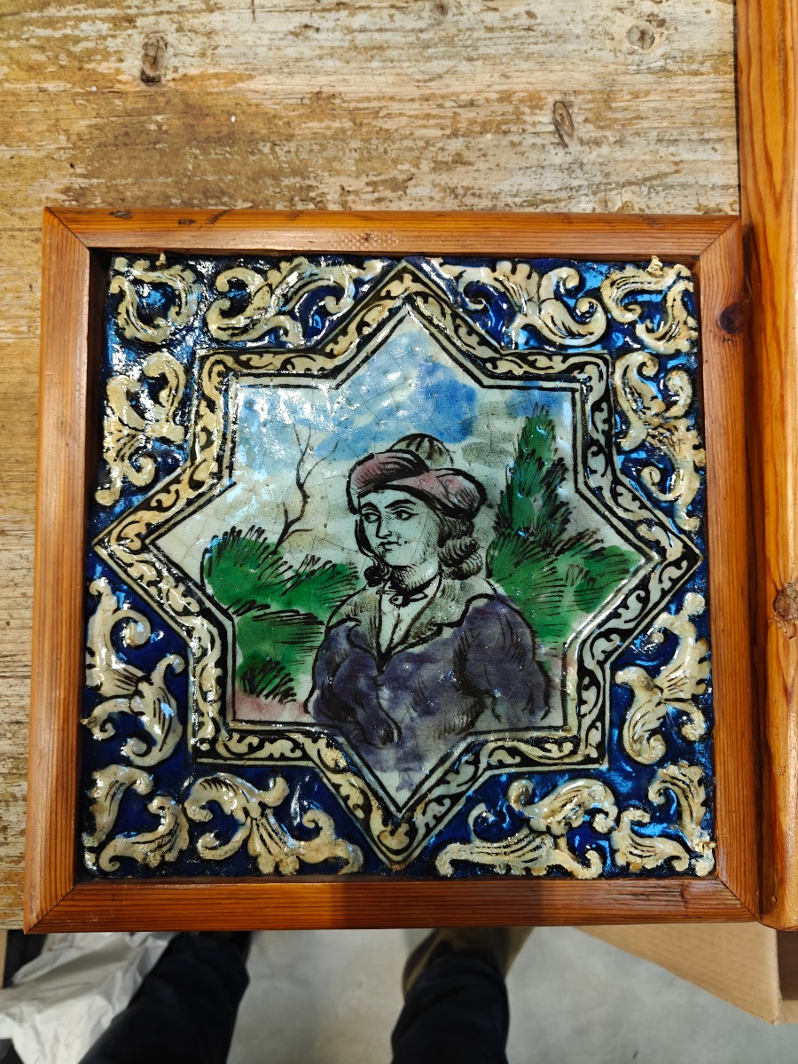 Persiske fliser med dekoration. 30 x 30 cm. og 40 x 30 cm. Lille med større rep. i øverste venstre hjørne.
