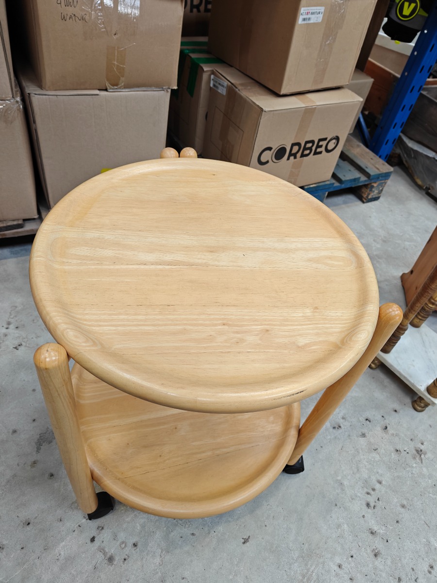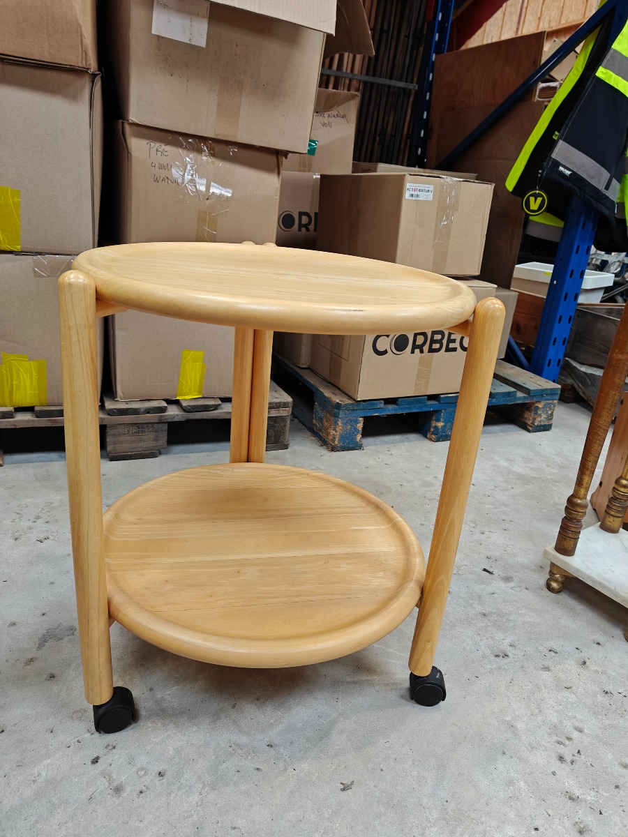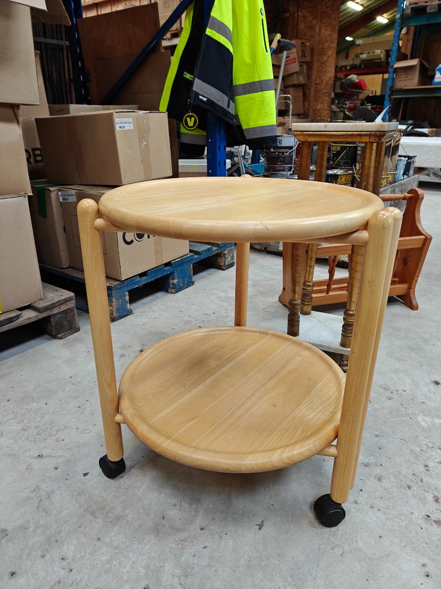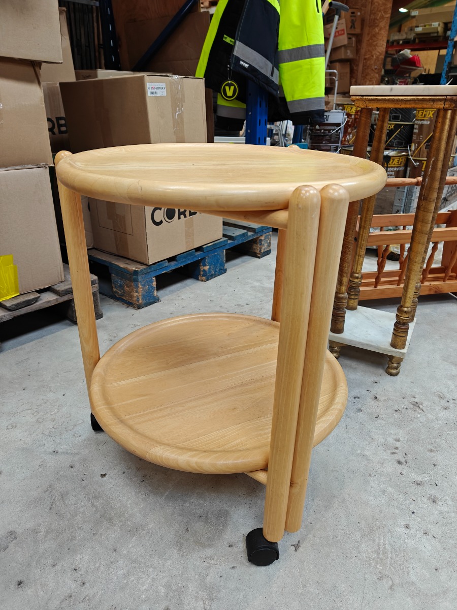 Rundt bakkebord af bøg. Bakker er fastmonterede. H. 58, Ø. 53 cm.
