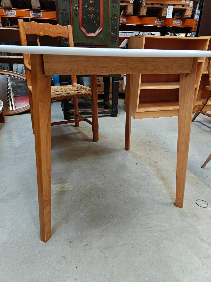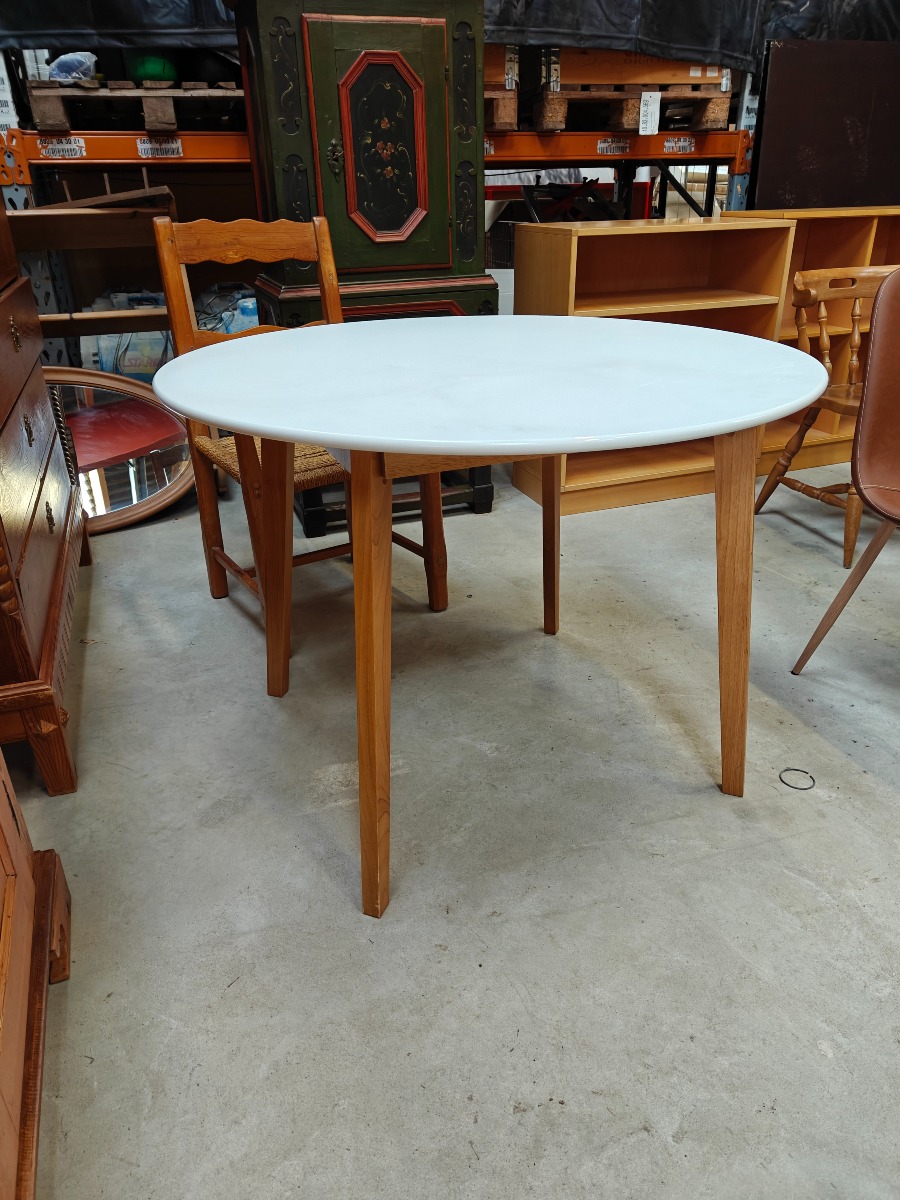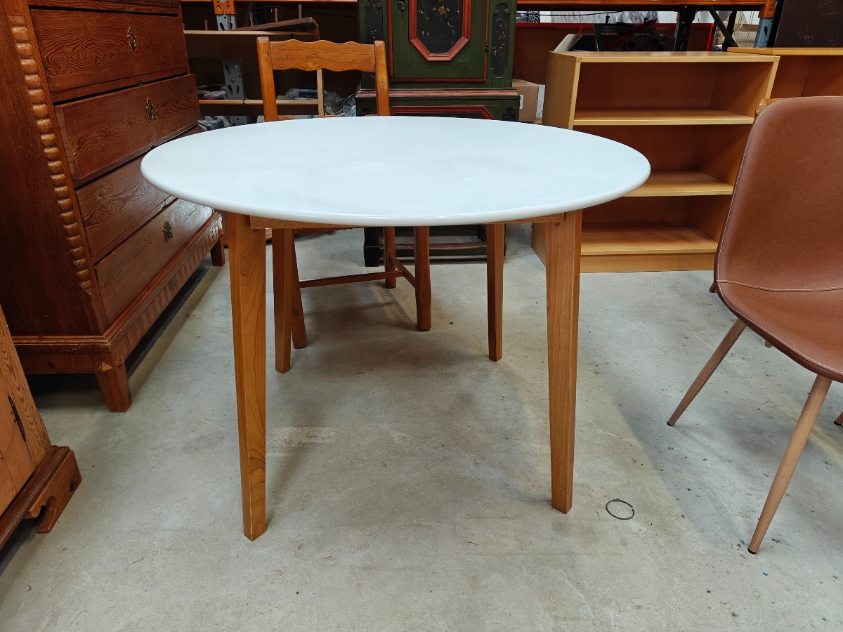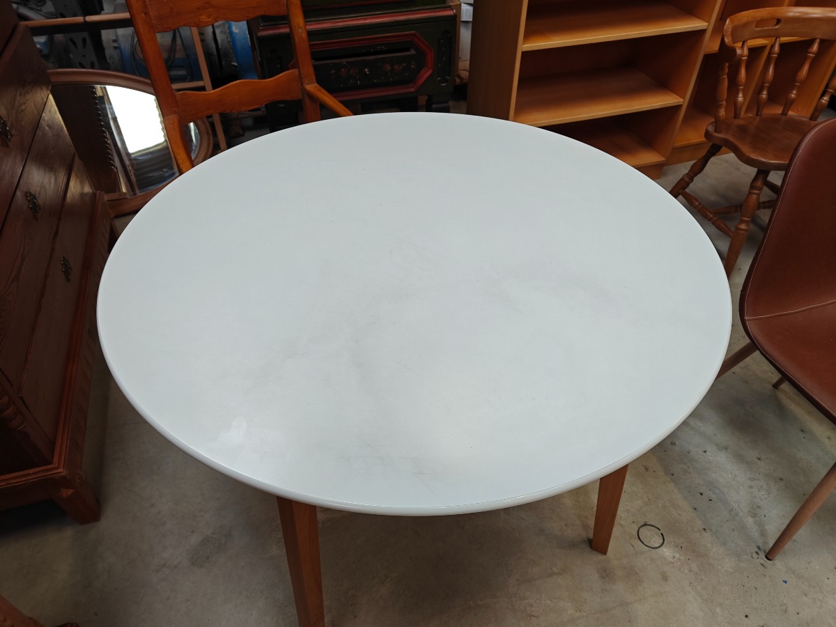 Rundt bord med lamineret bordplade på stel af bøg. H. 75, Ø. 104 cm.