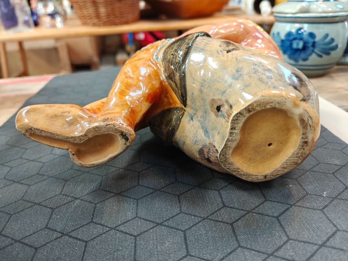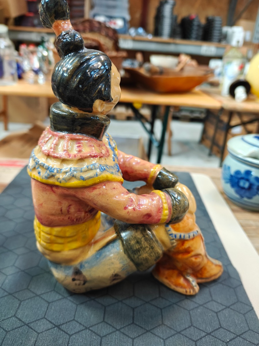Siddende grønlandsk kvinde af underglasurbemalet lertøj. H. 22 cm.