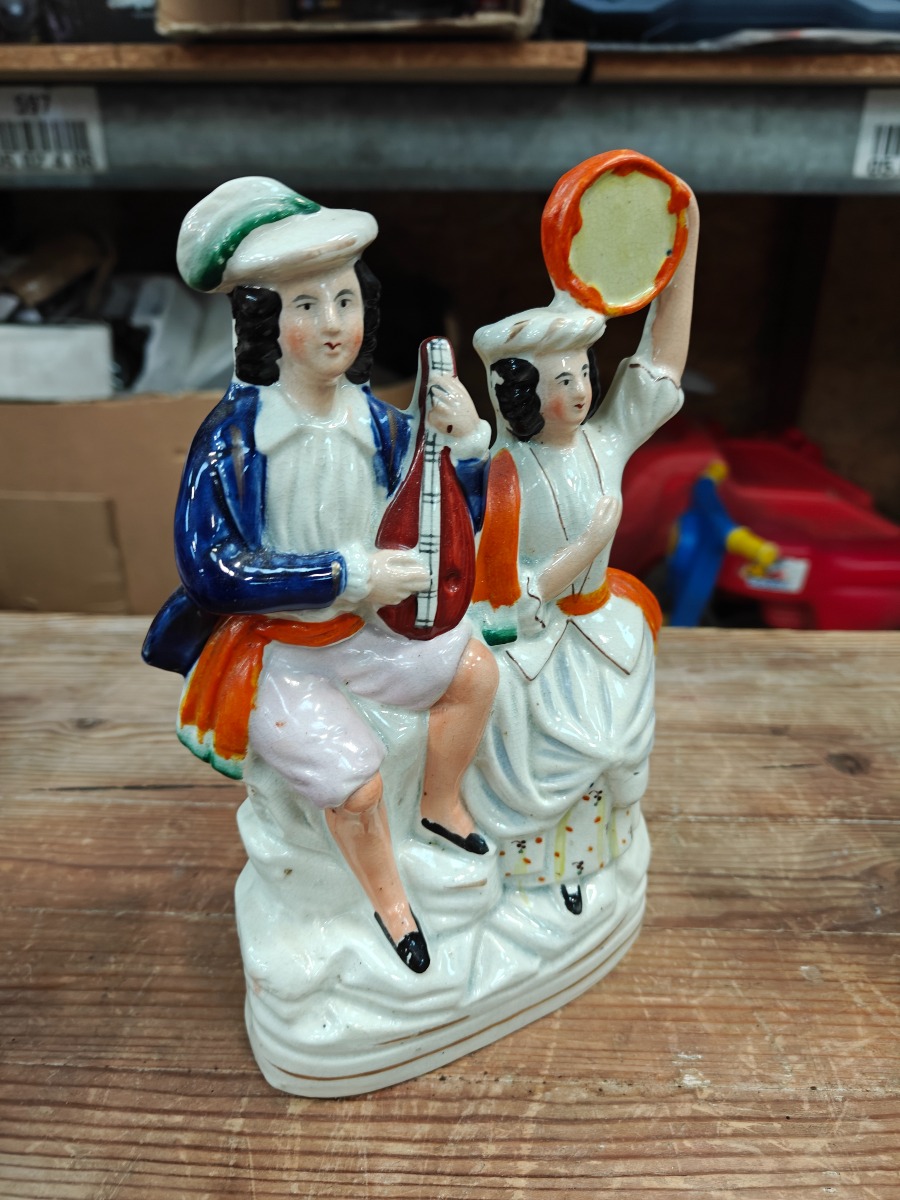 Staffordshire figurgruppe med musiserende par. Fajance. H. 22 cm.