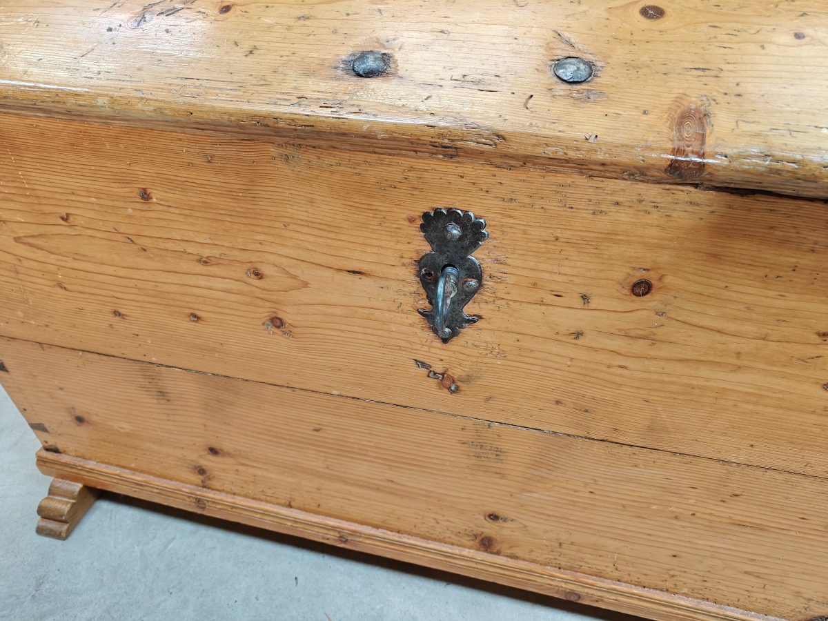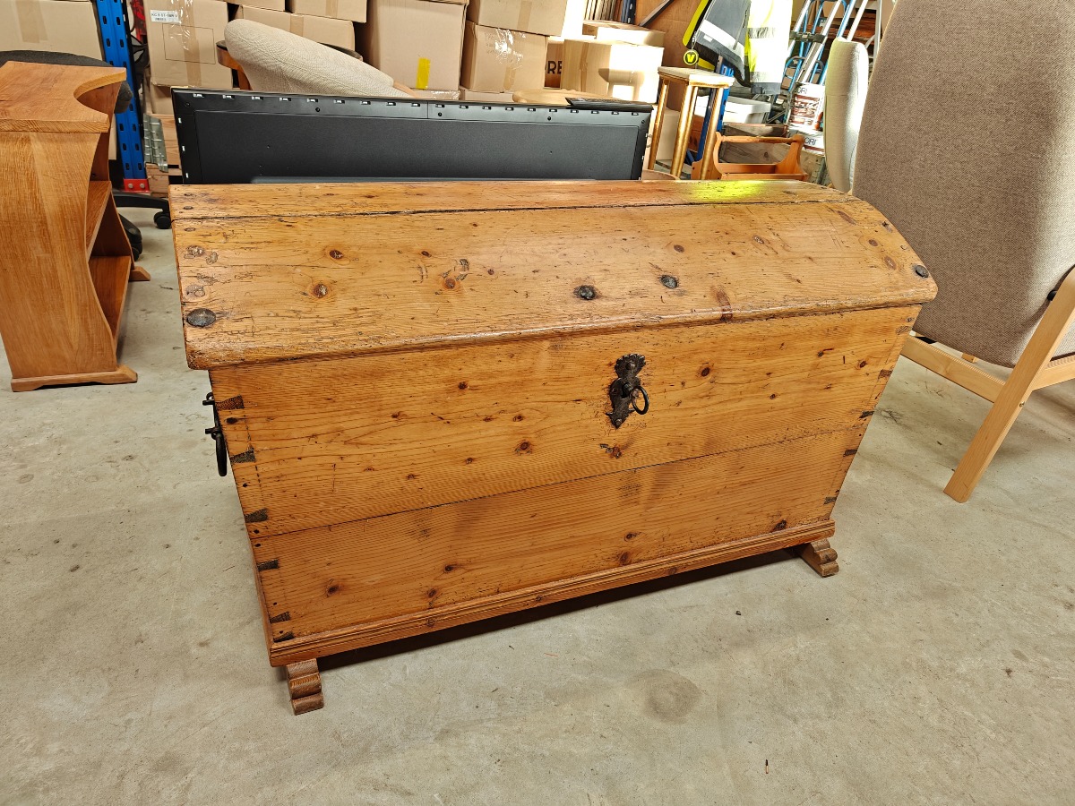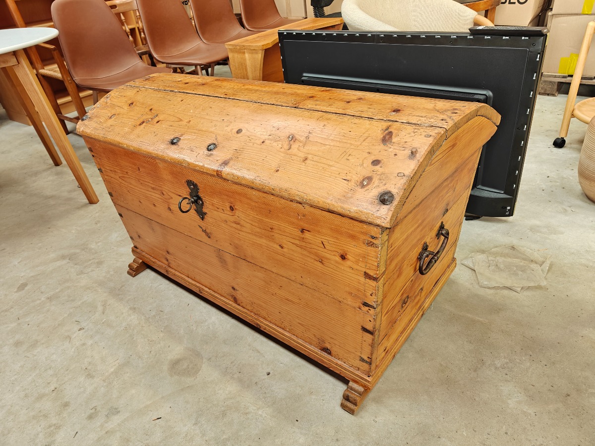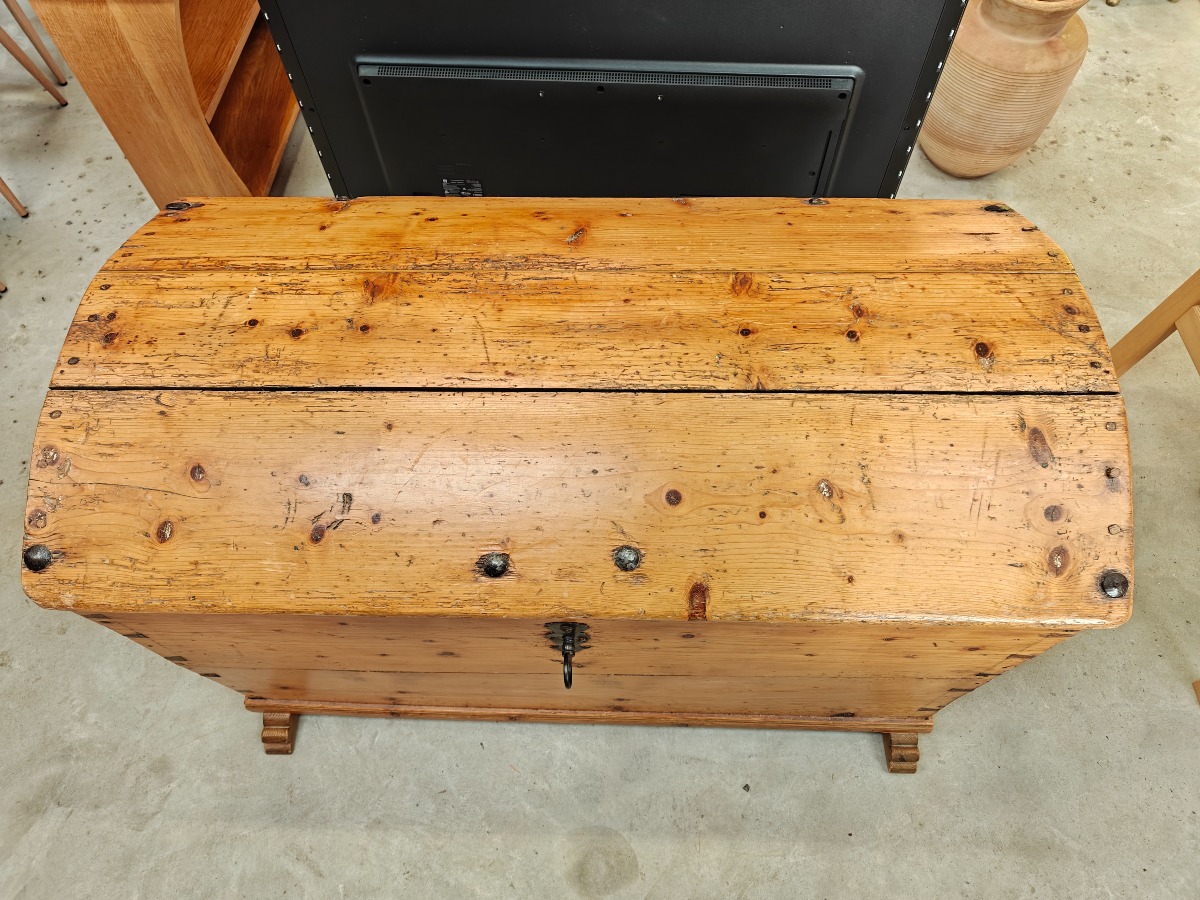 Standkiste af fyr med buet låg. Håndsmedede beslag m.m. Original lås. Dateret 1787 indvendig. H. 65, B. 113, D. 60 cm.