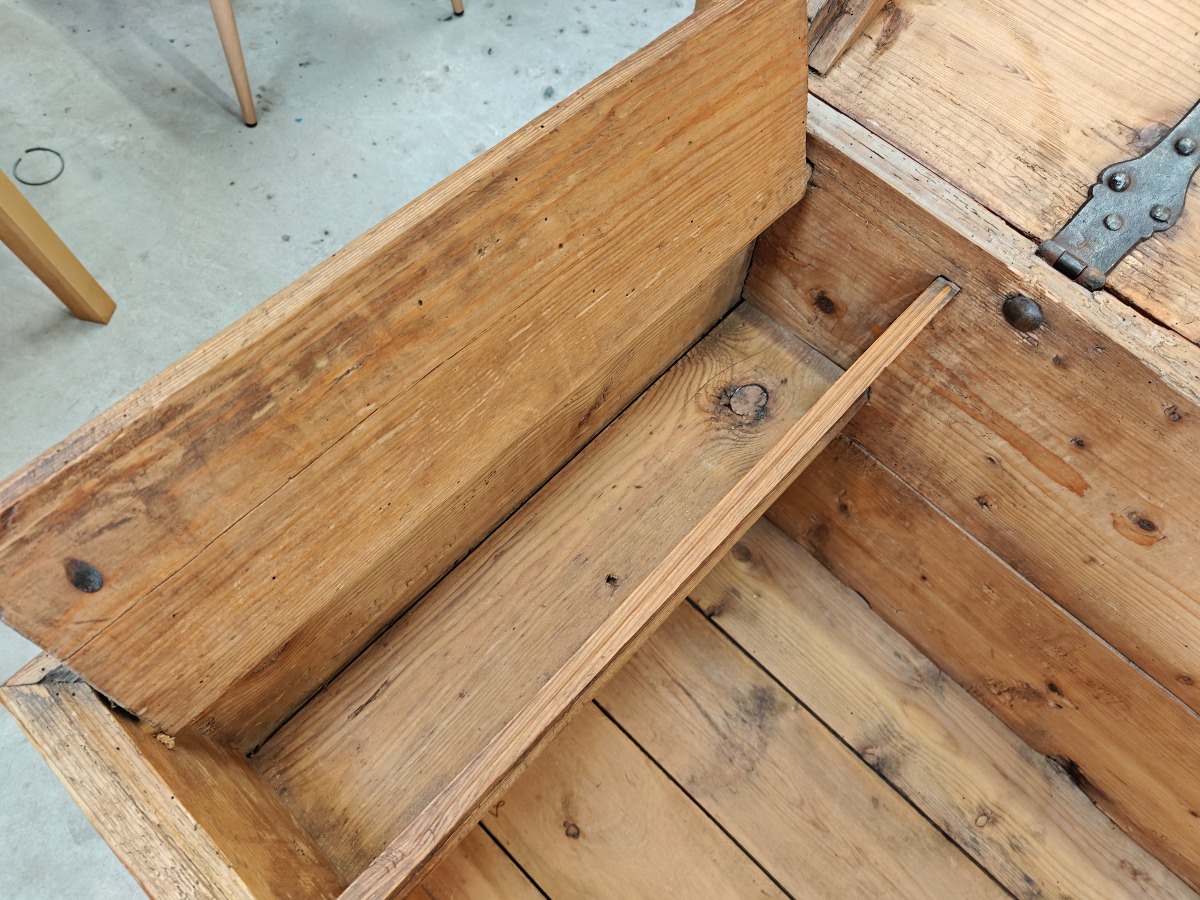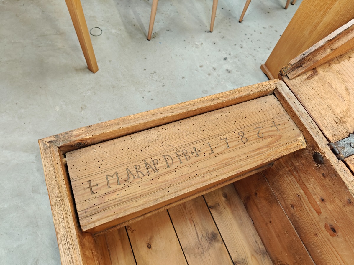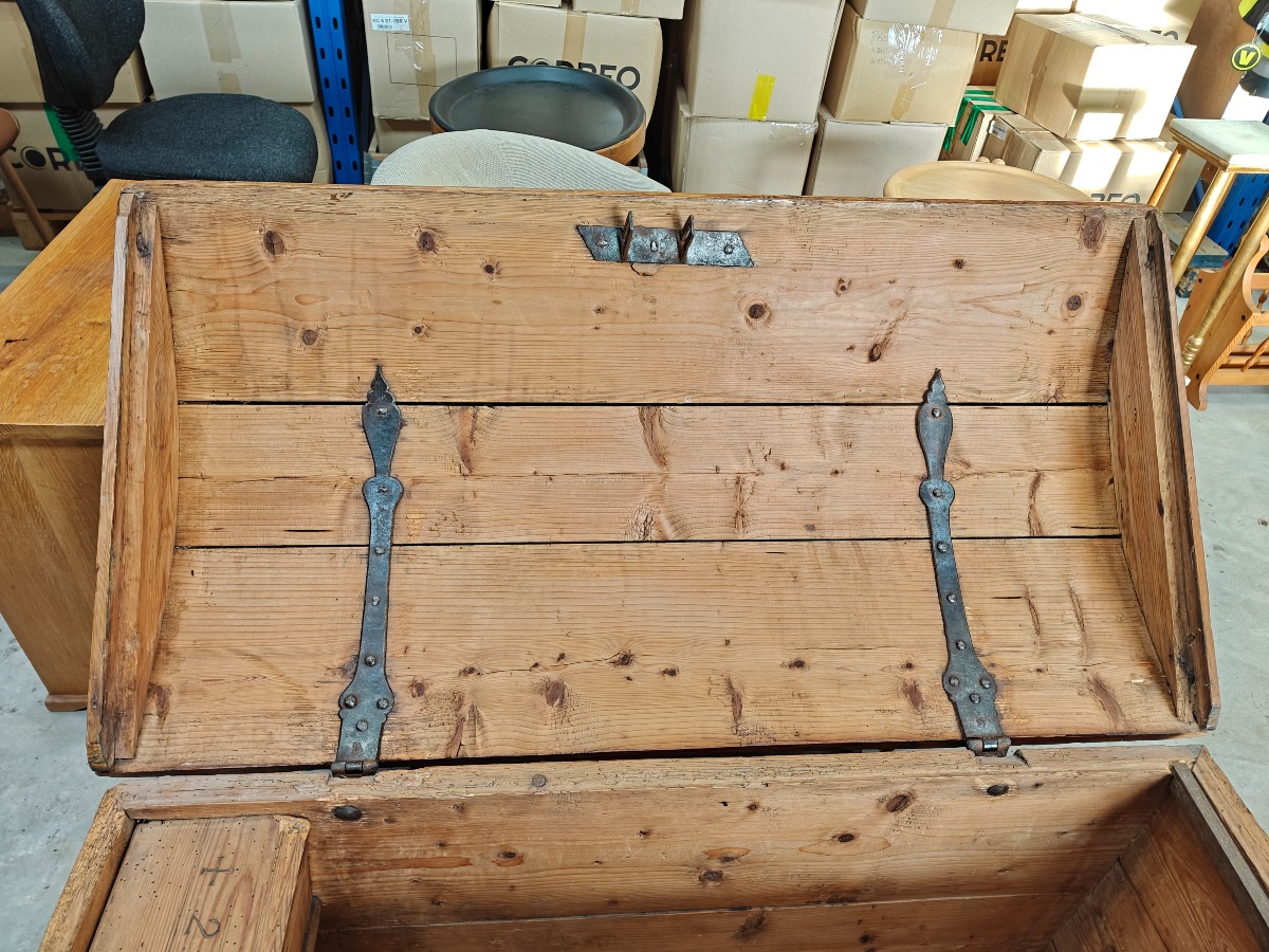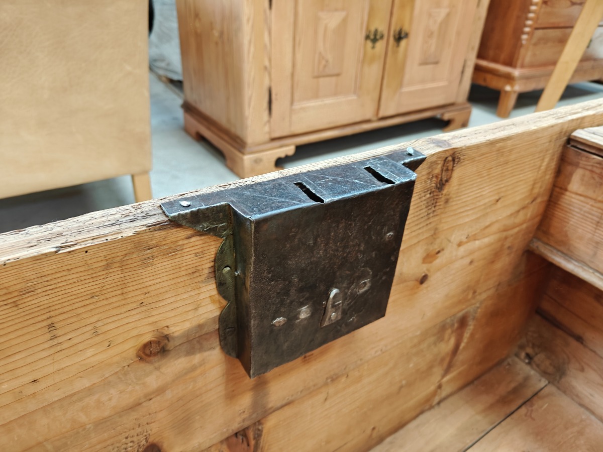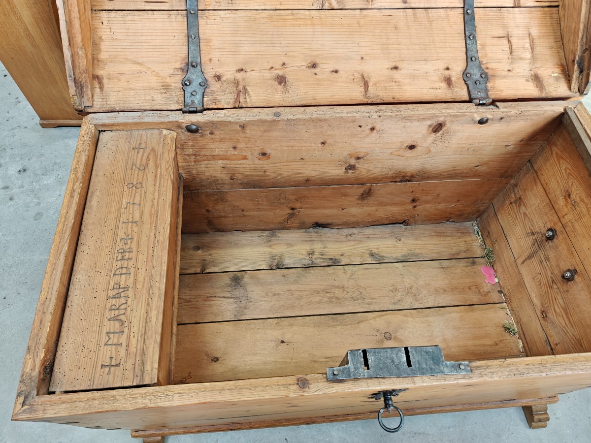 Standkiste af fyr med buet låg. Håndsmedede beslag m.m. Original lås. Dateret 1787 indvendig. H. 65, B. 113, D. 60 cm.