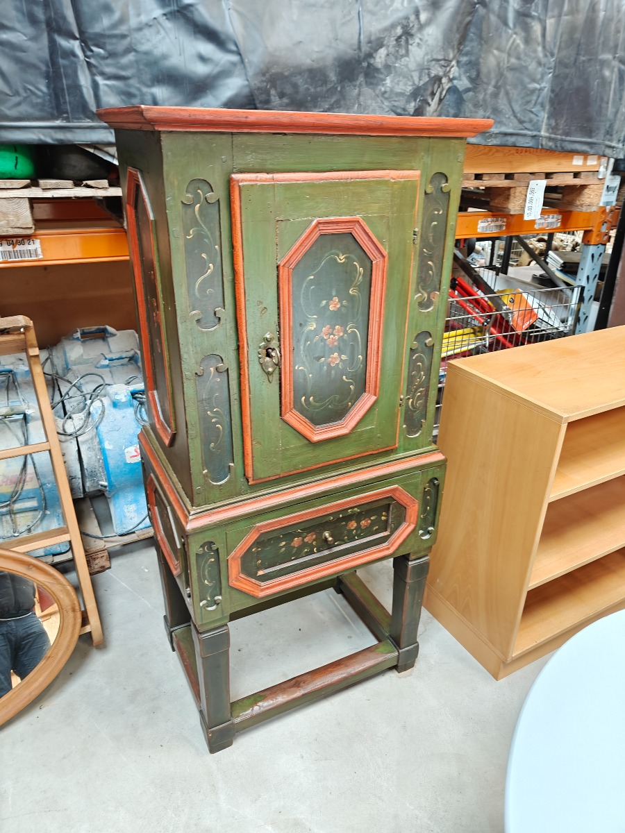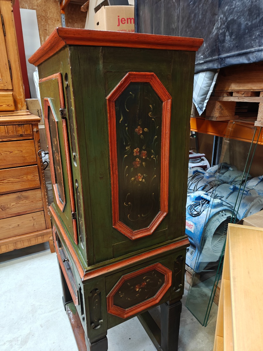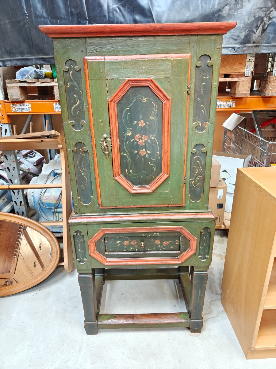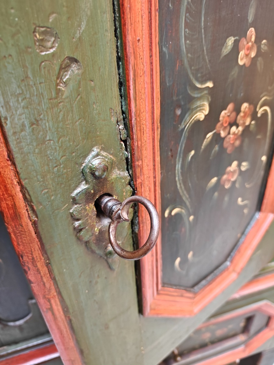 Stolpeskab. Almuemalet med florale dekorationer. Håndsmedede hængsler og lås. H. 151, B. 68, D. 46 cm.