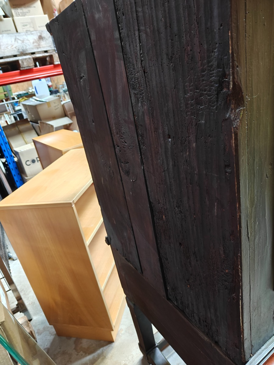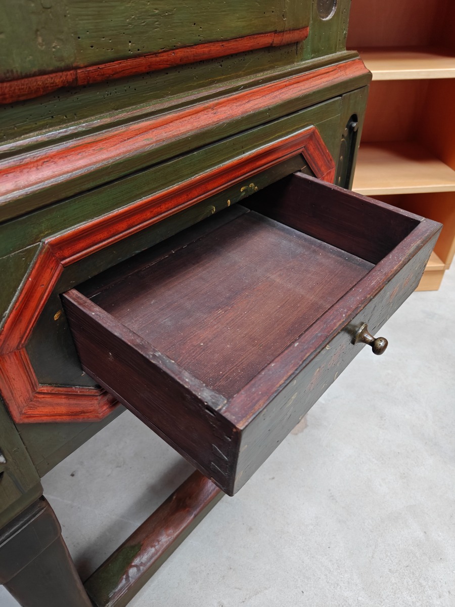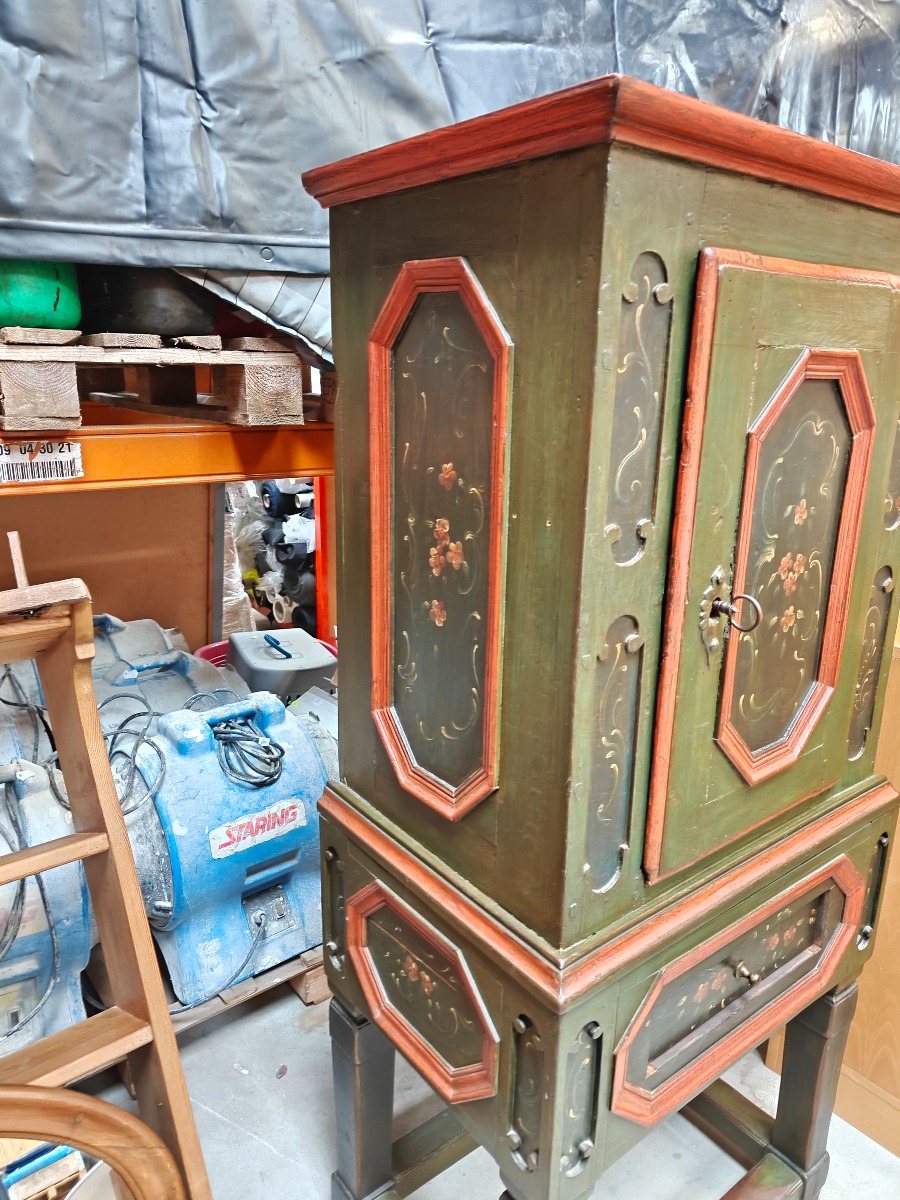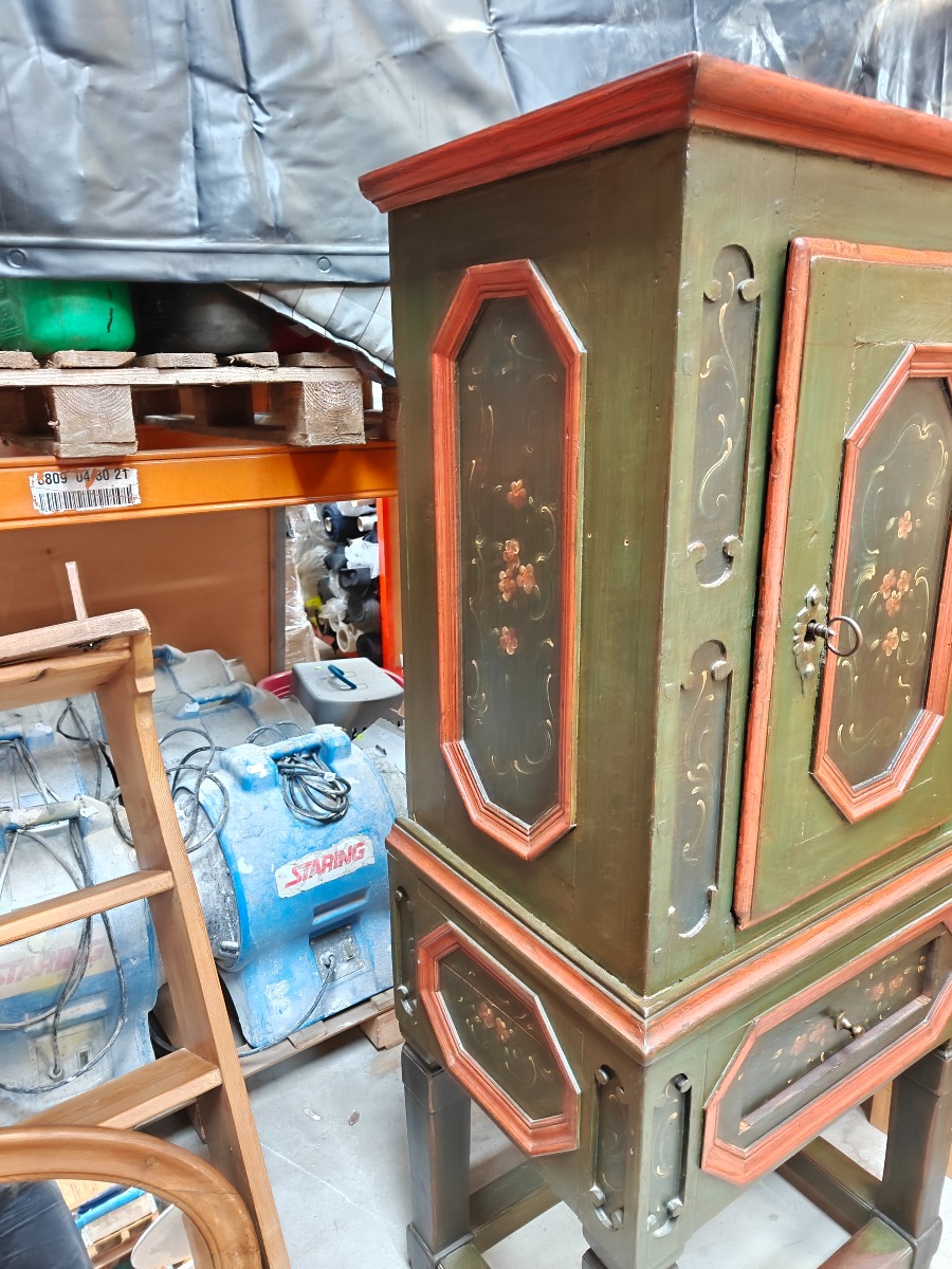 Stolpeskab. Almuemalet med florale dekorationer. Håndsmedede hængsler og lås. H. 151, B. 68, D. 46 cm.