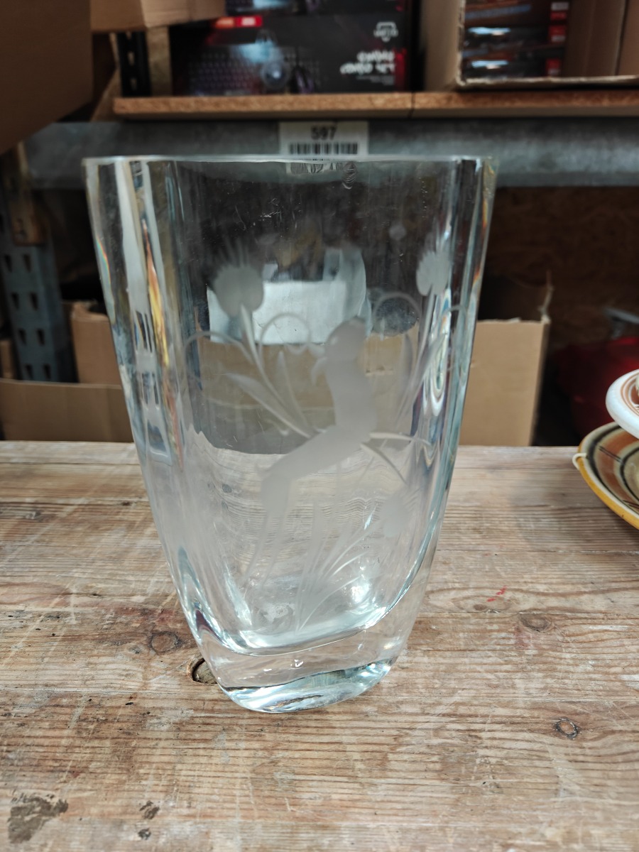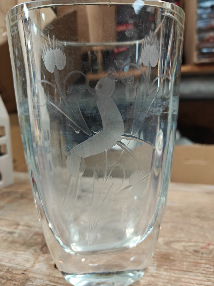 Svensk vase med hjortemotiv. Kraftigt glas. Mindre skår ved øverste kant.