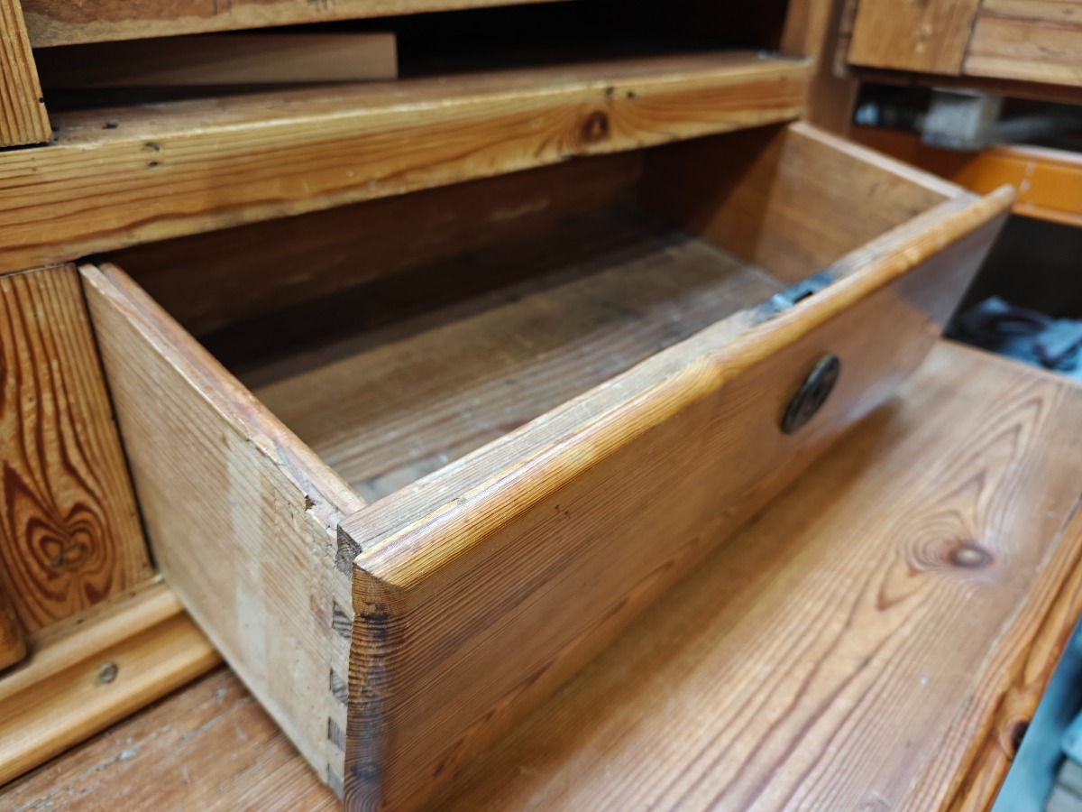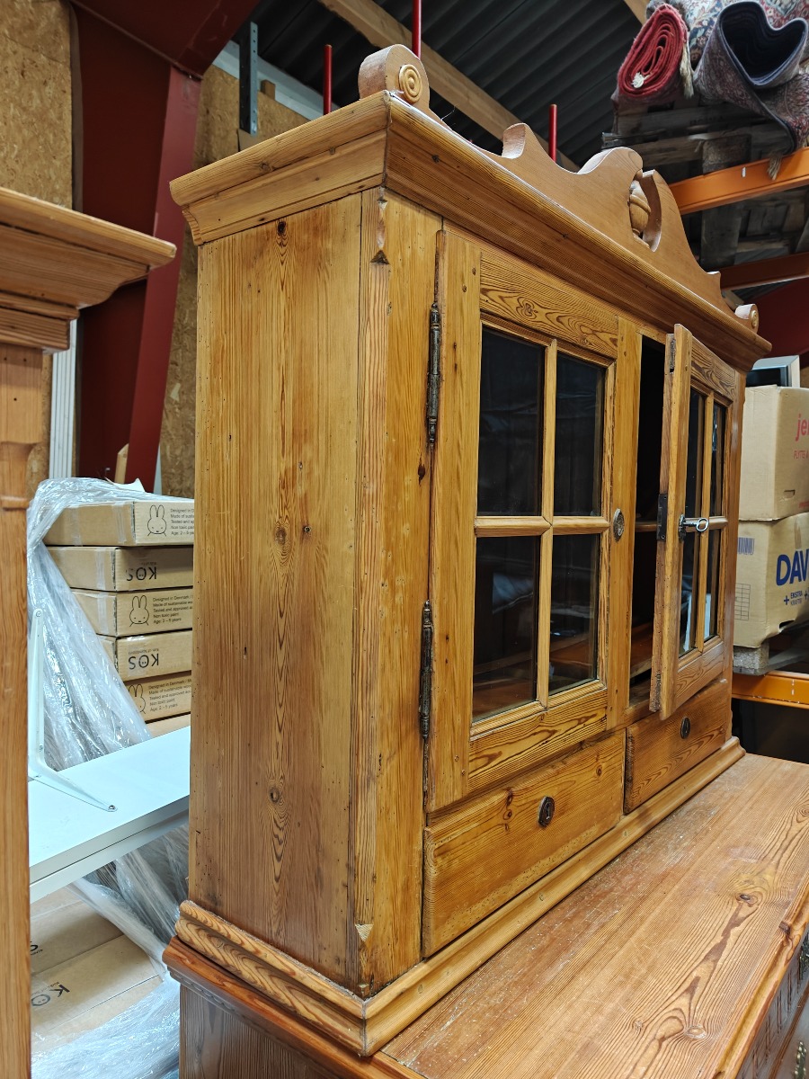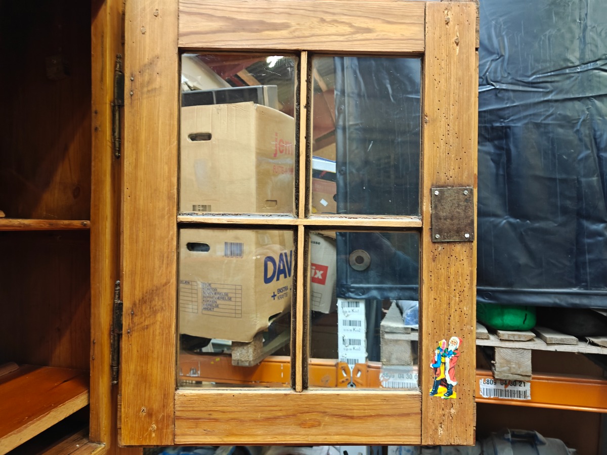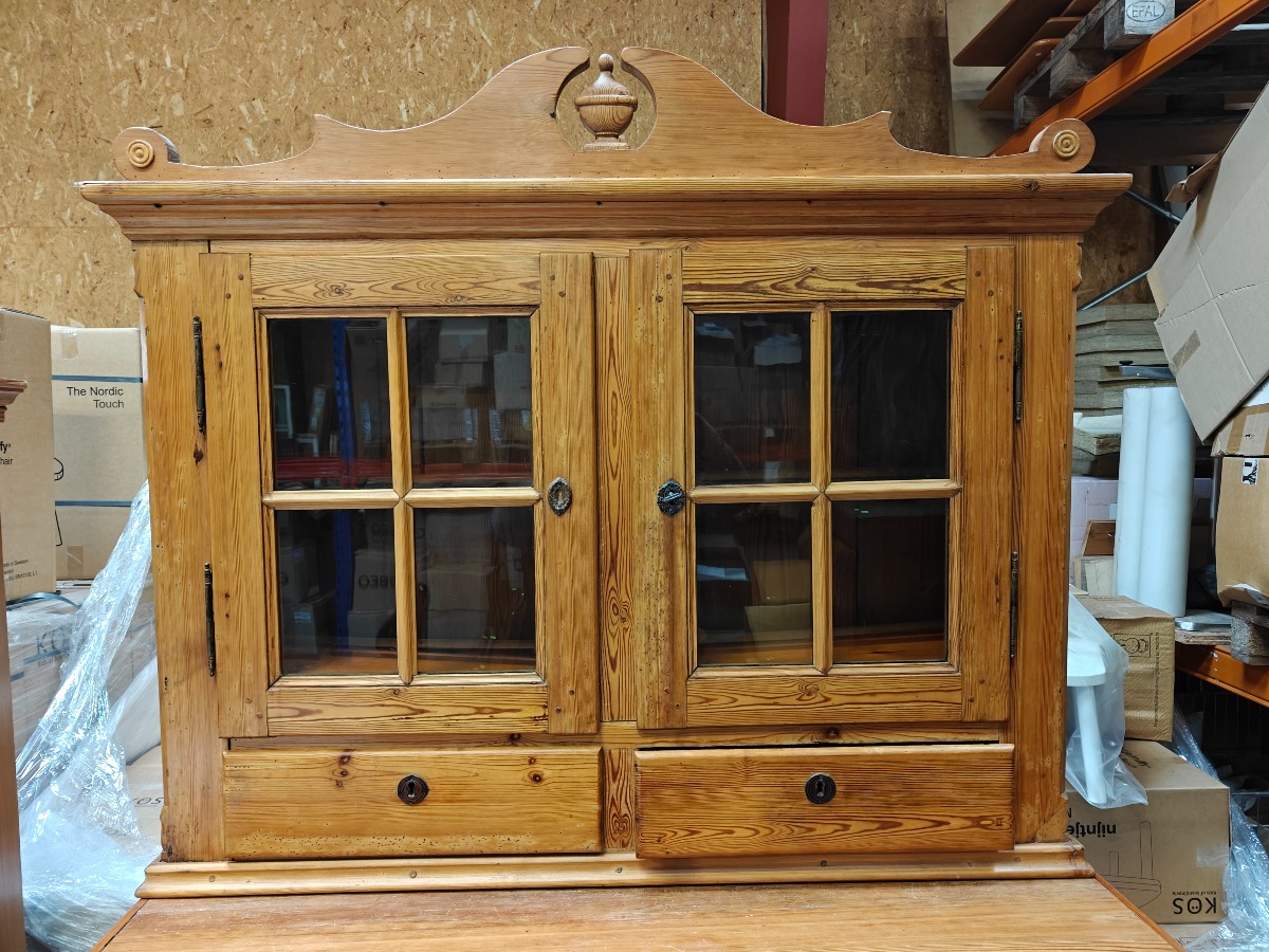 Væghængt vitrine af fyr. 2 låger med originalt glas. H. 102, B. 120, D. 31 cm.