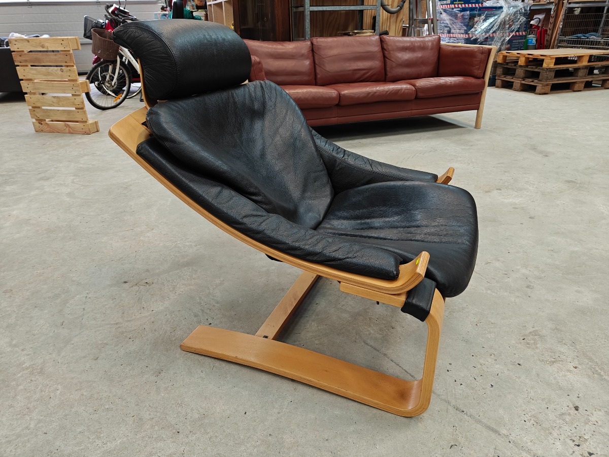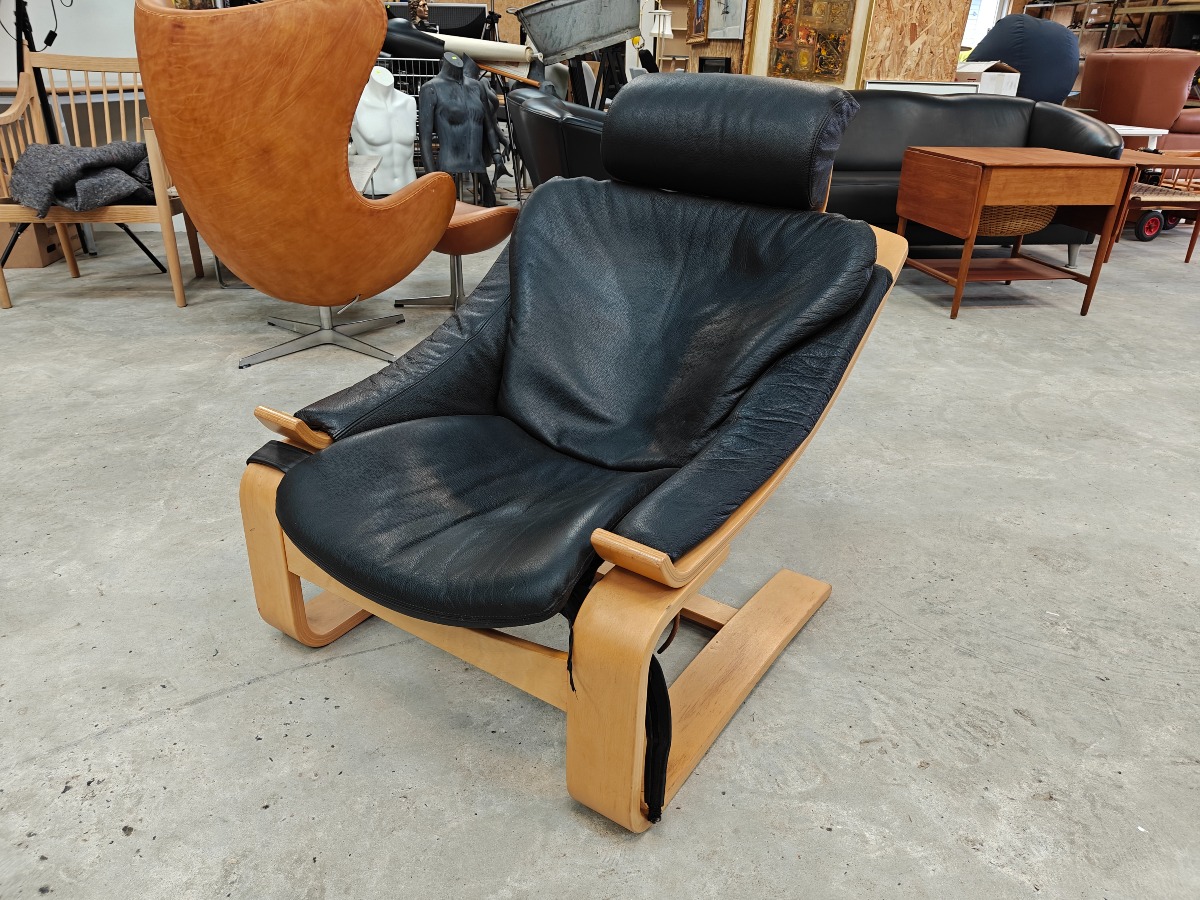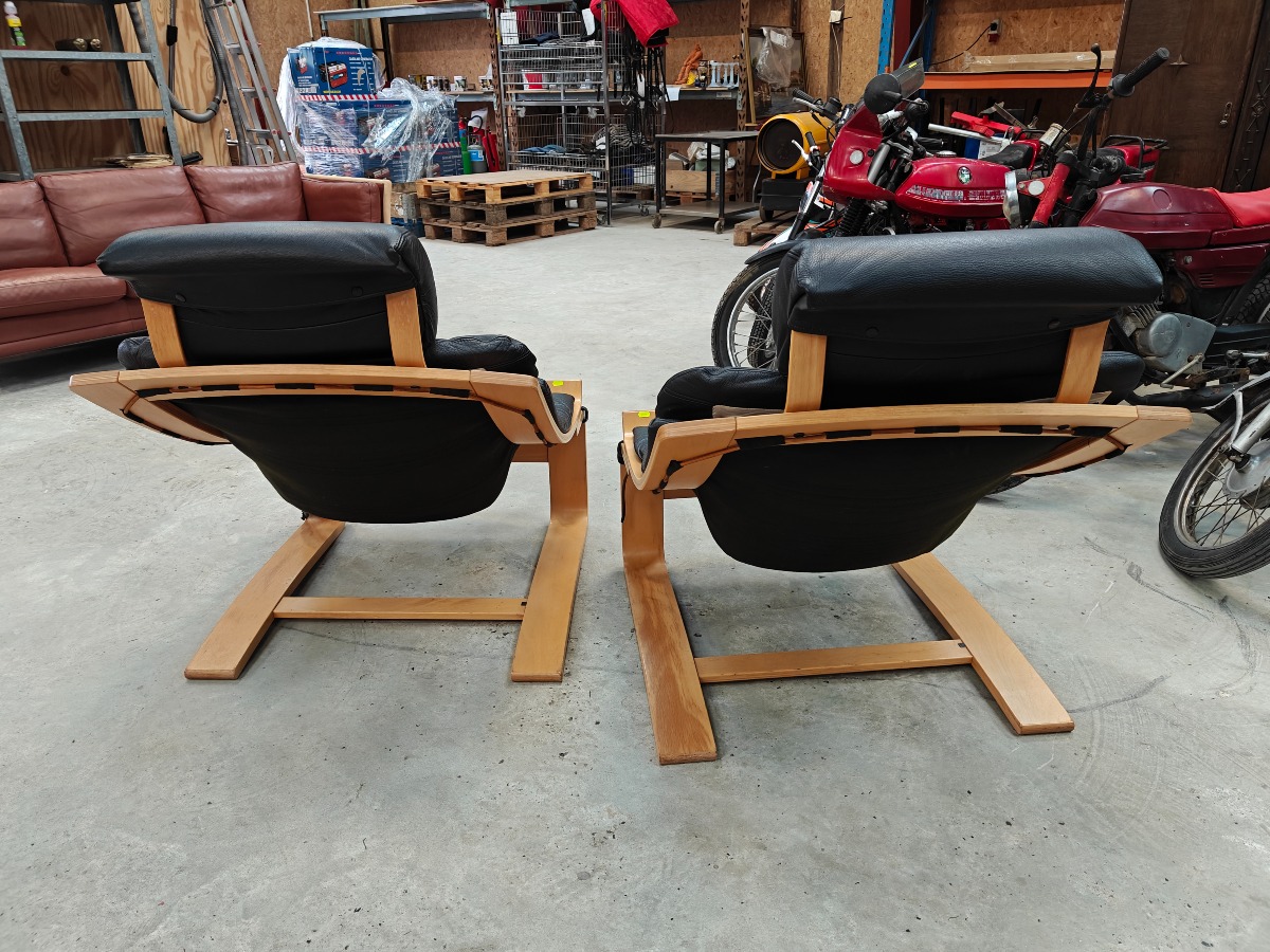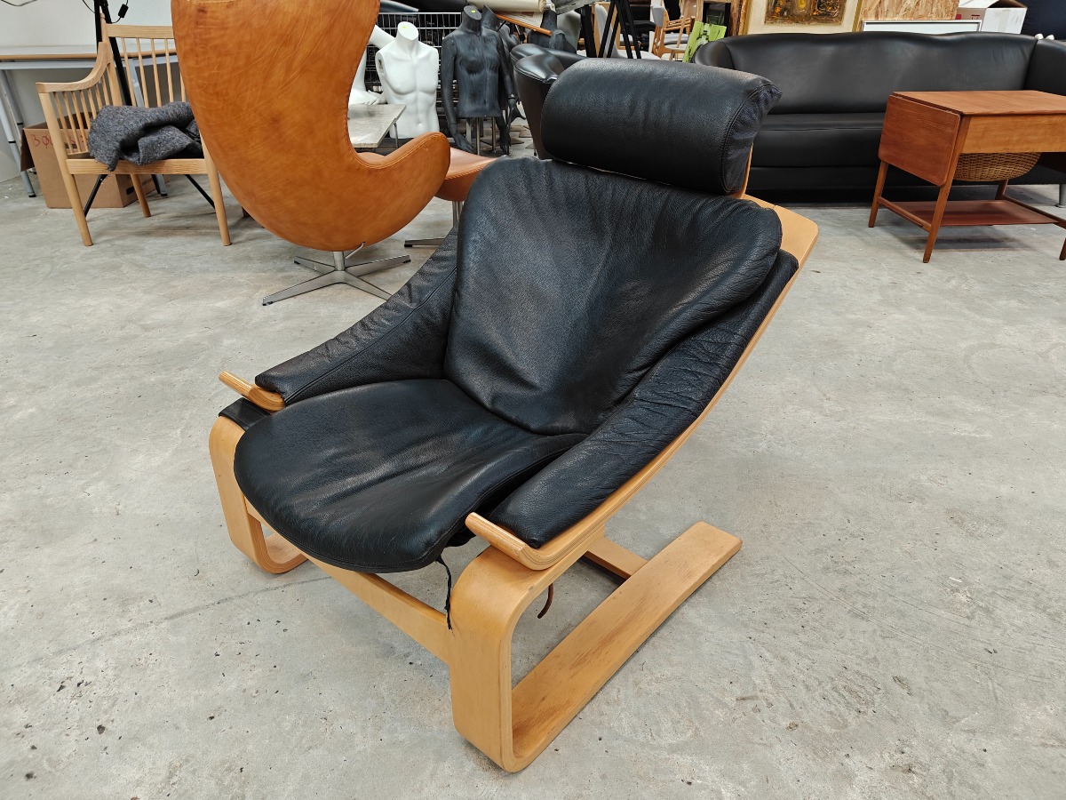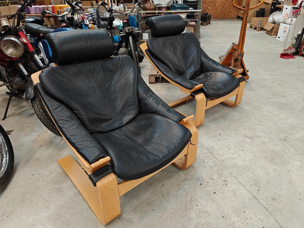 Åke Fribytter 2 hvilestole, Kroken. Formspændt bøg. Delvis monteret med sort læder. Alm. brugsslid. Mindre defekter.