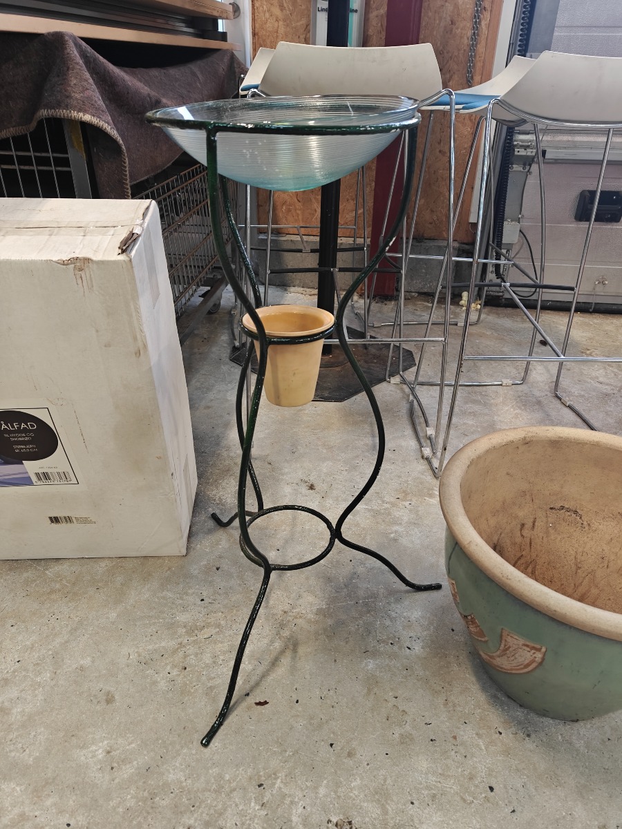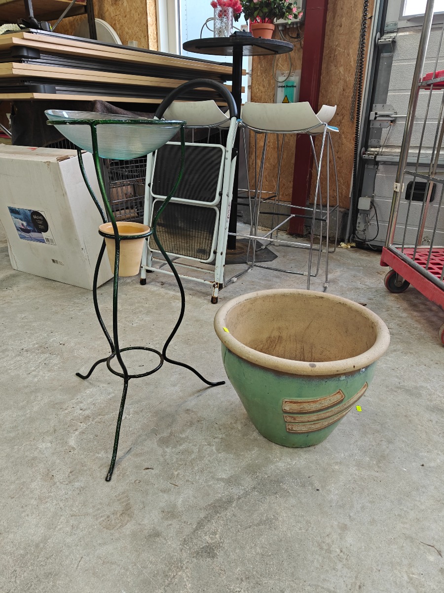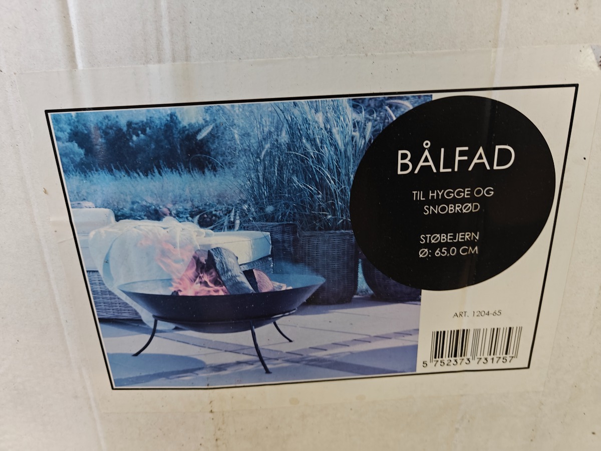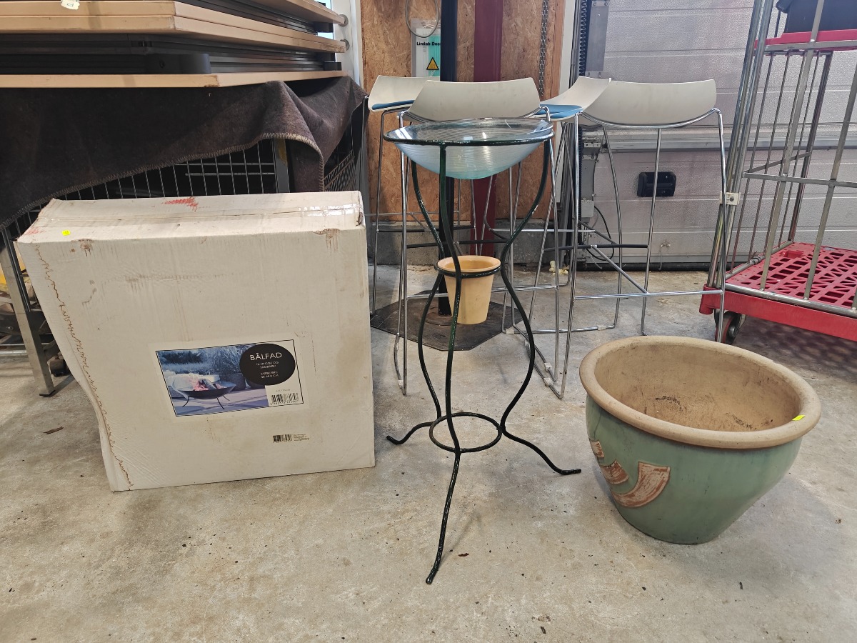 Ting til haven. Bålfad af støbejern, på trefod. Ø. 65 cm. Bålfadet ligger i uåbnet pakke. Opsats af smedejer samt krukke med grønglasur.