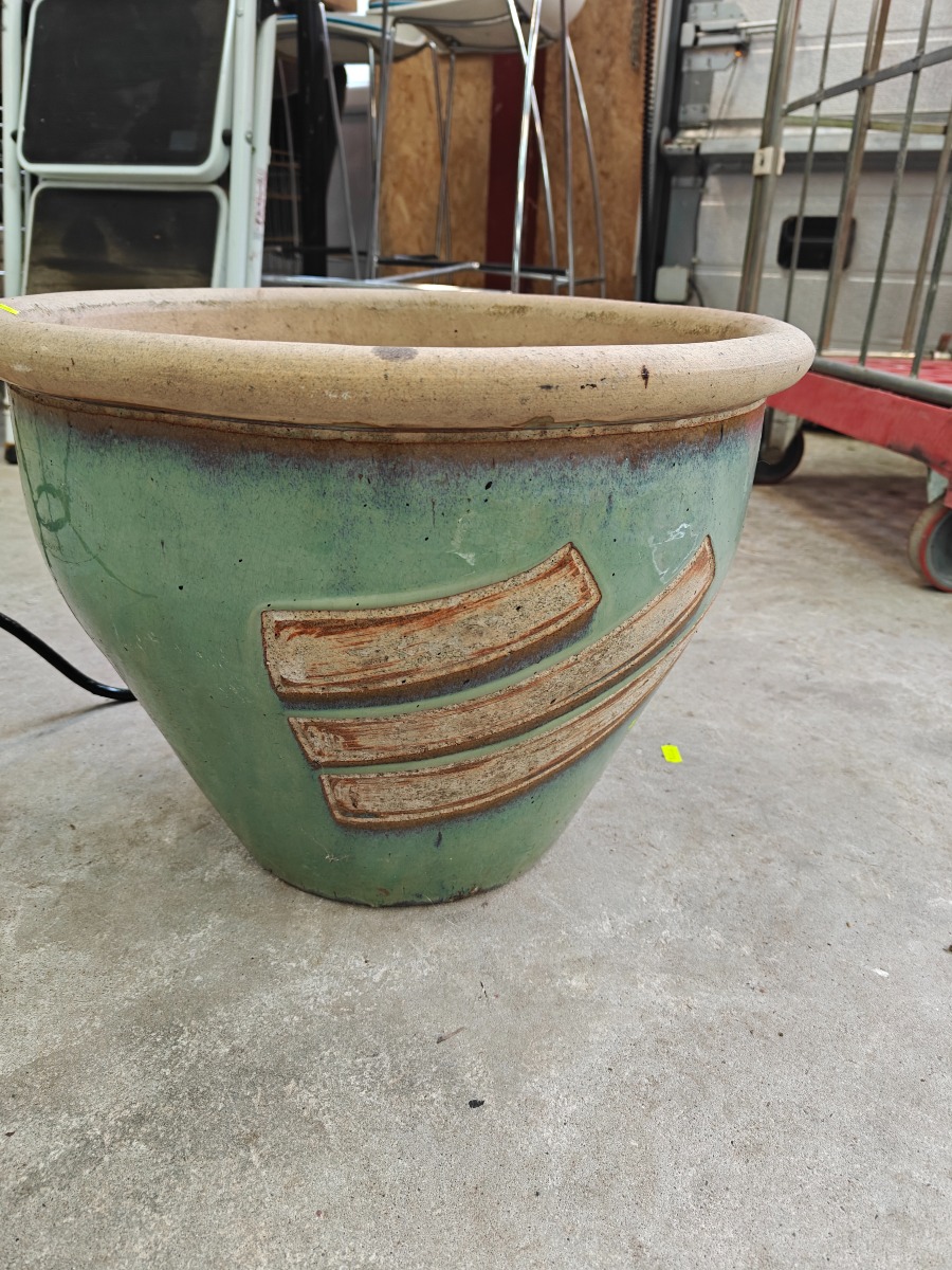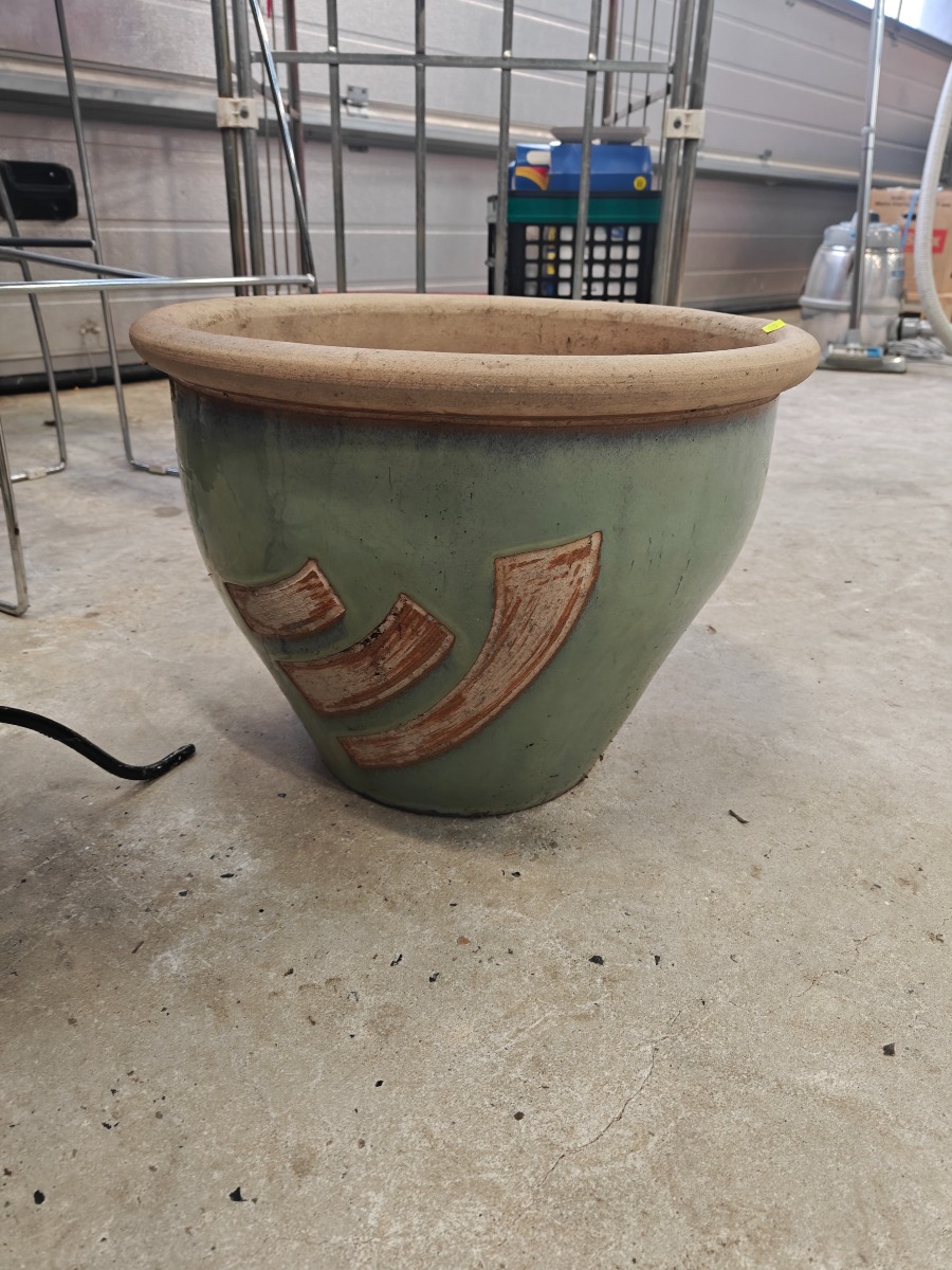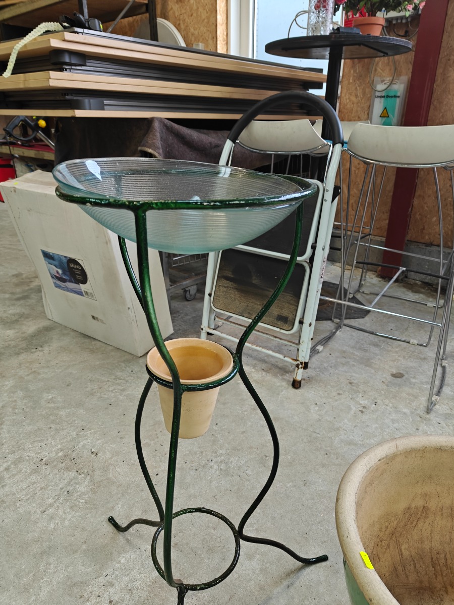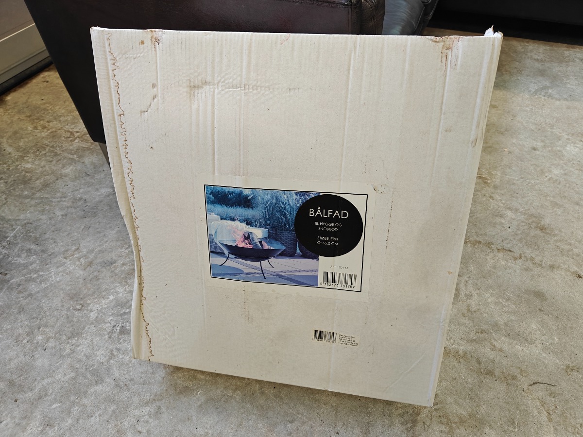 Ting til haven. Bålfad af støbejern, på trefod. Ø. 65 cm. Bålfadet ligger i uåbnet pakke. Opsats af smedejer samt krukke med grønglasur.
