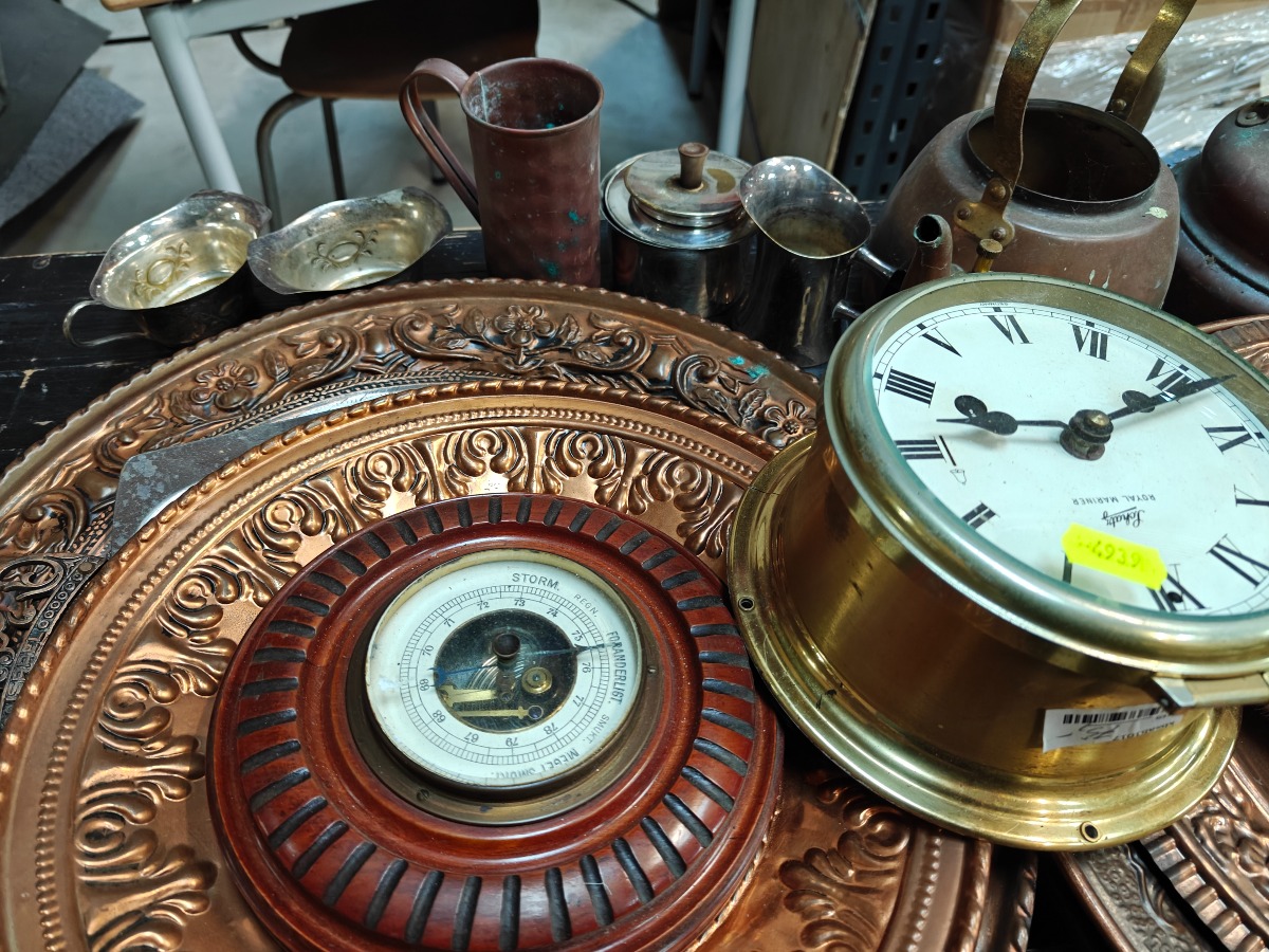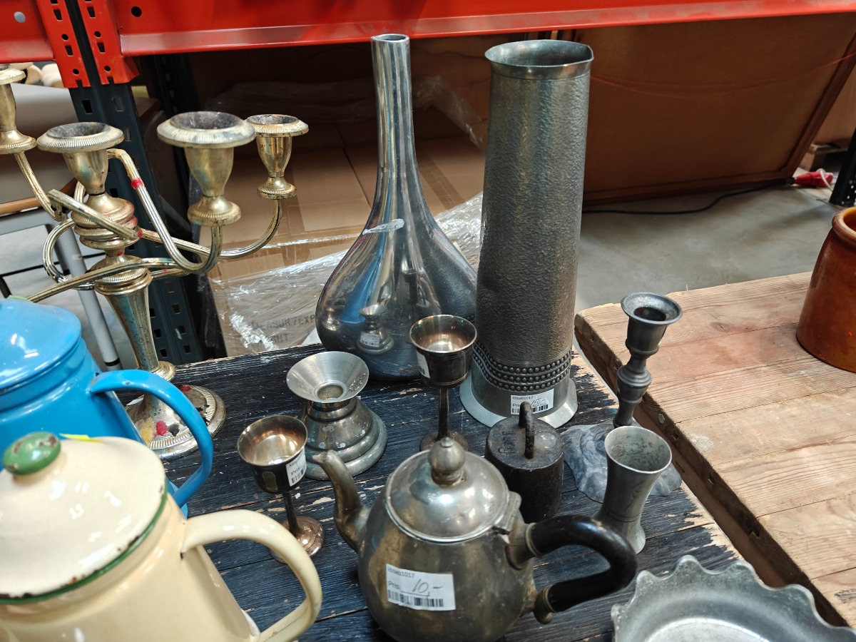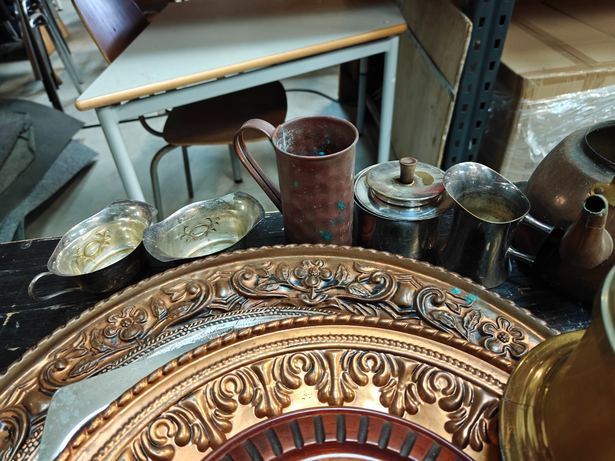 Forskellige metalgenstande. kobber vægplatter, emaljekander, stager, vaser og beholdere.