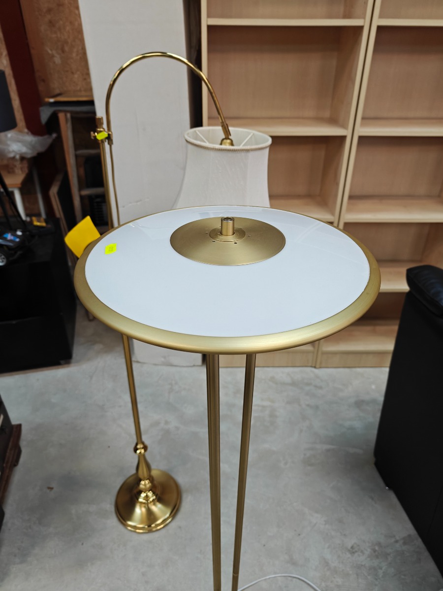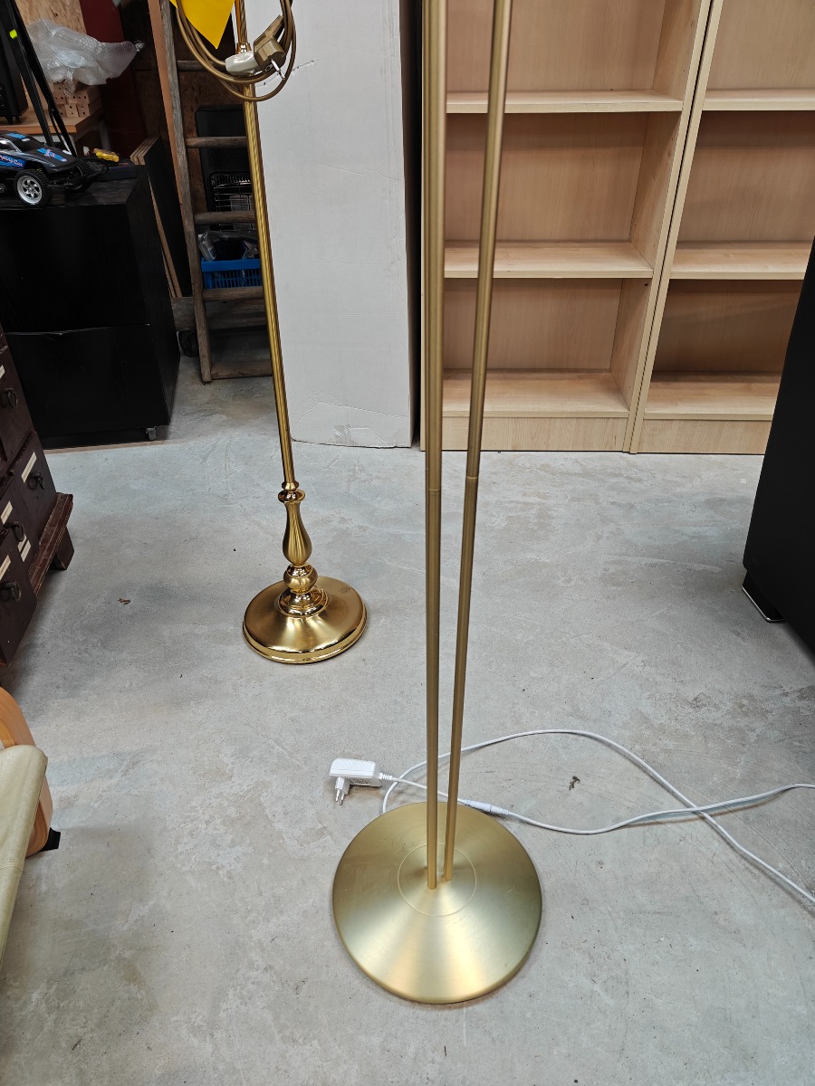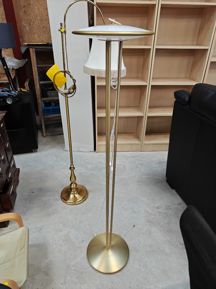 Standerlampe af børstet messing. 3 delt stamme med lukket skærm af hvid opak akryl. H. ca. 160 cm.