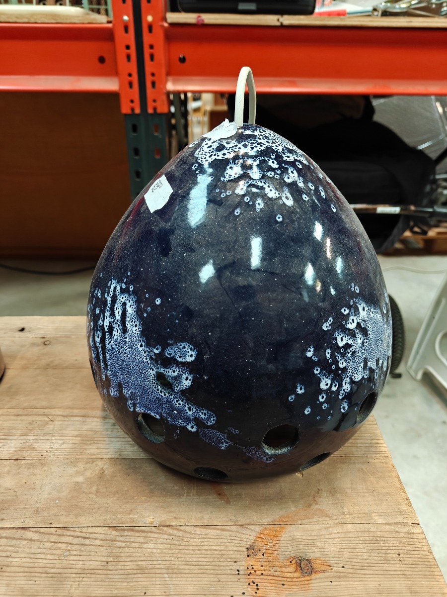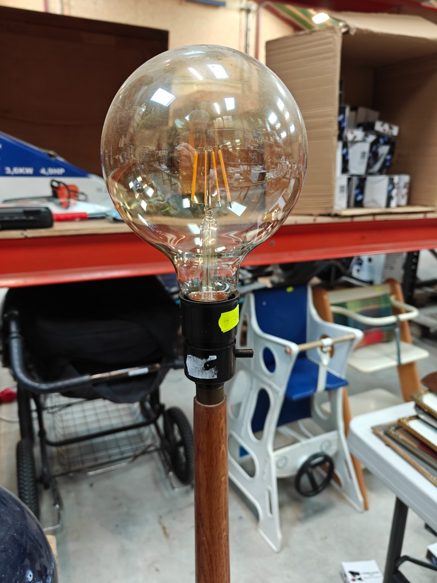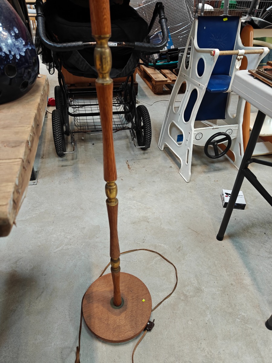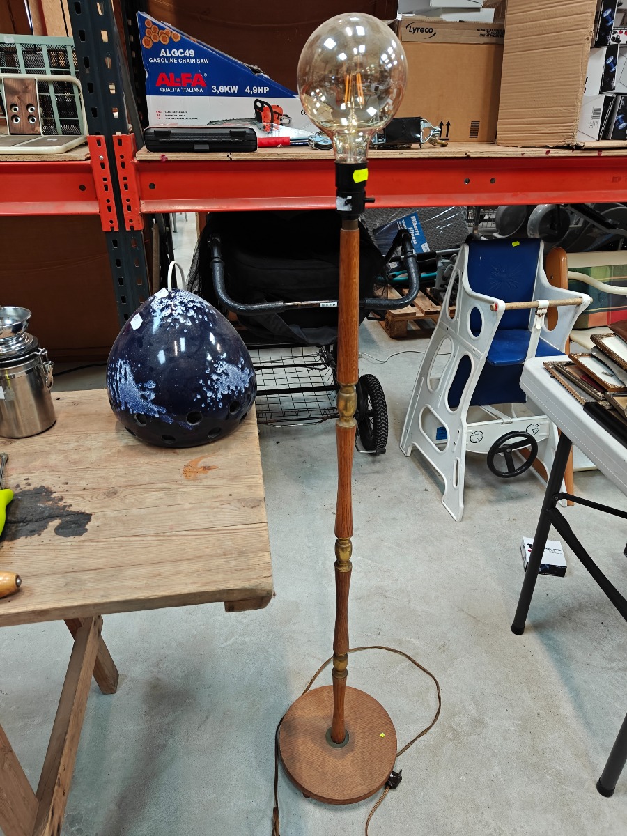 Standerlampe og loftpendel. Standerlampe af eg og messing. Pendel af blåglaseret keramik.