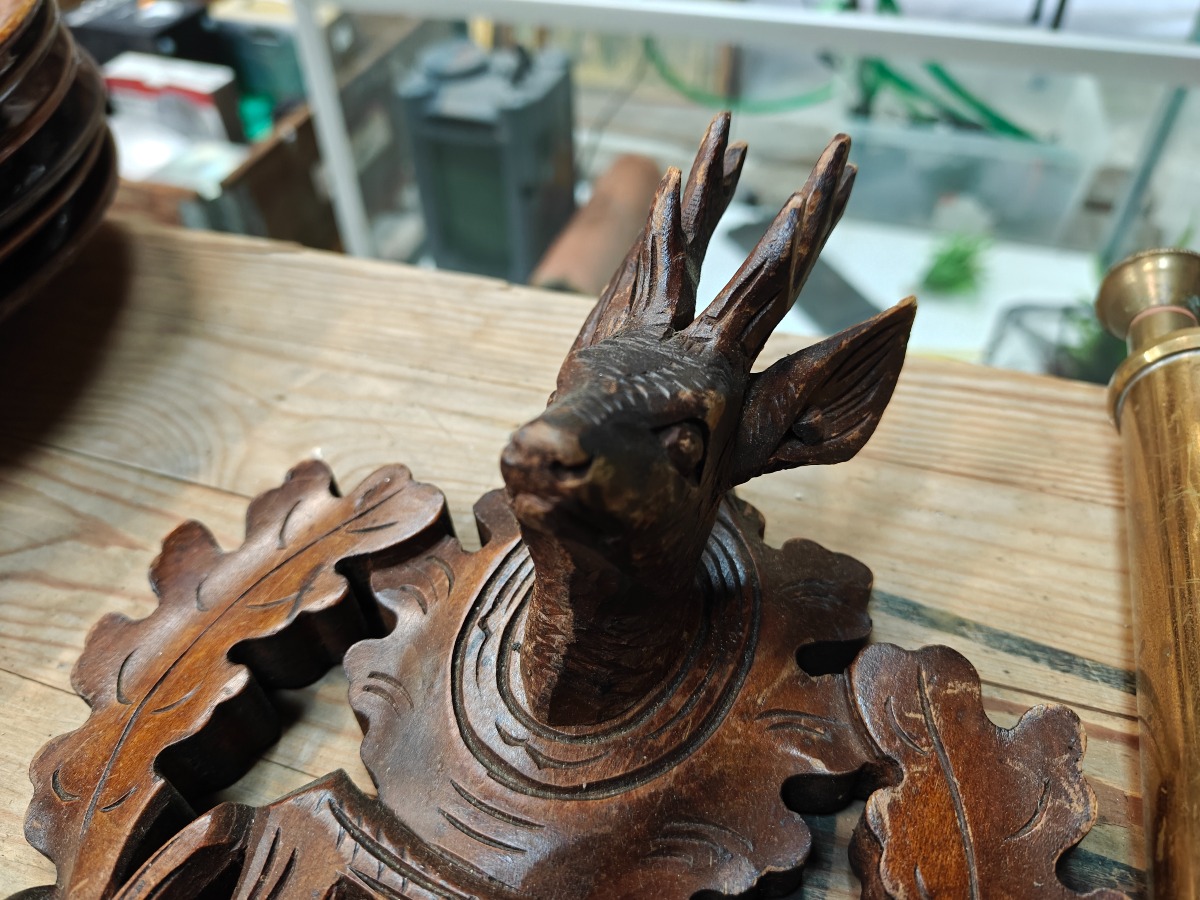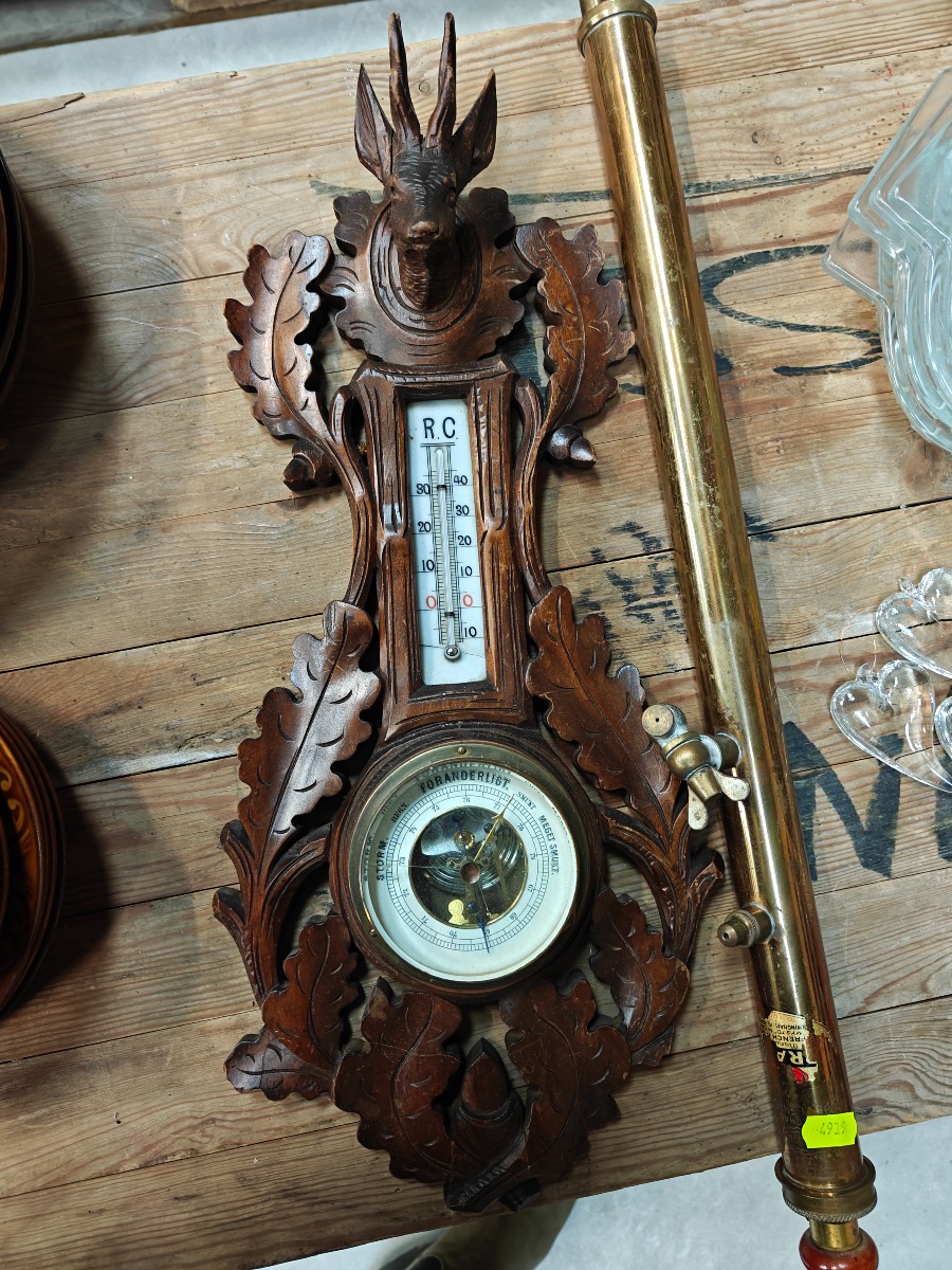 Vejrstation i Schwartzwald-stil af rigt udskåret og mørkbejdset bøg samt engelsk giftsprøjte af messing.