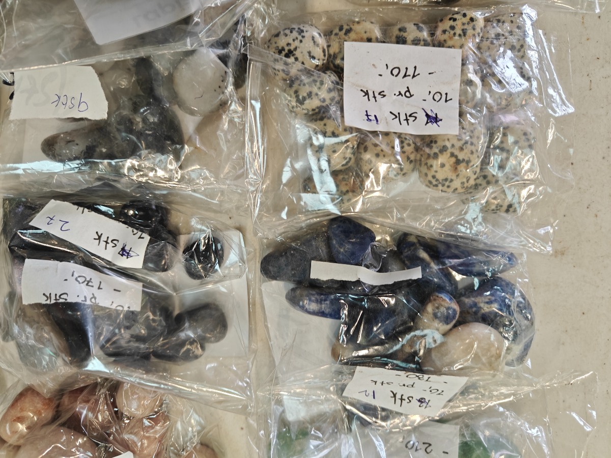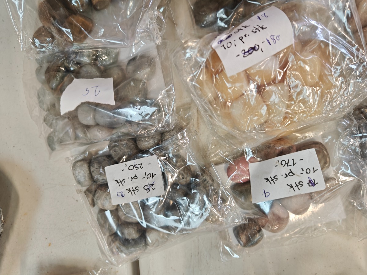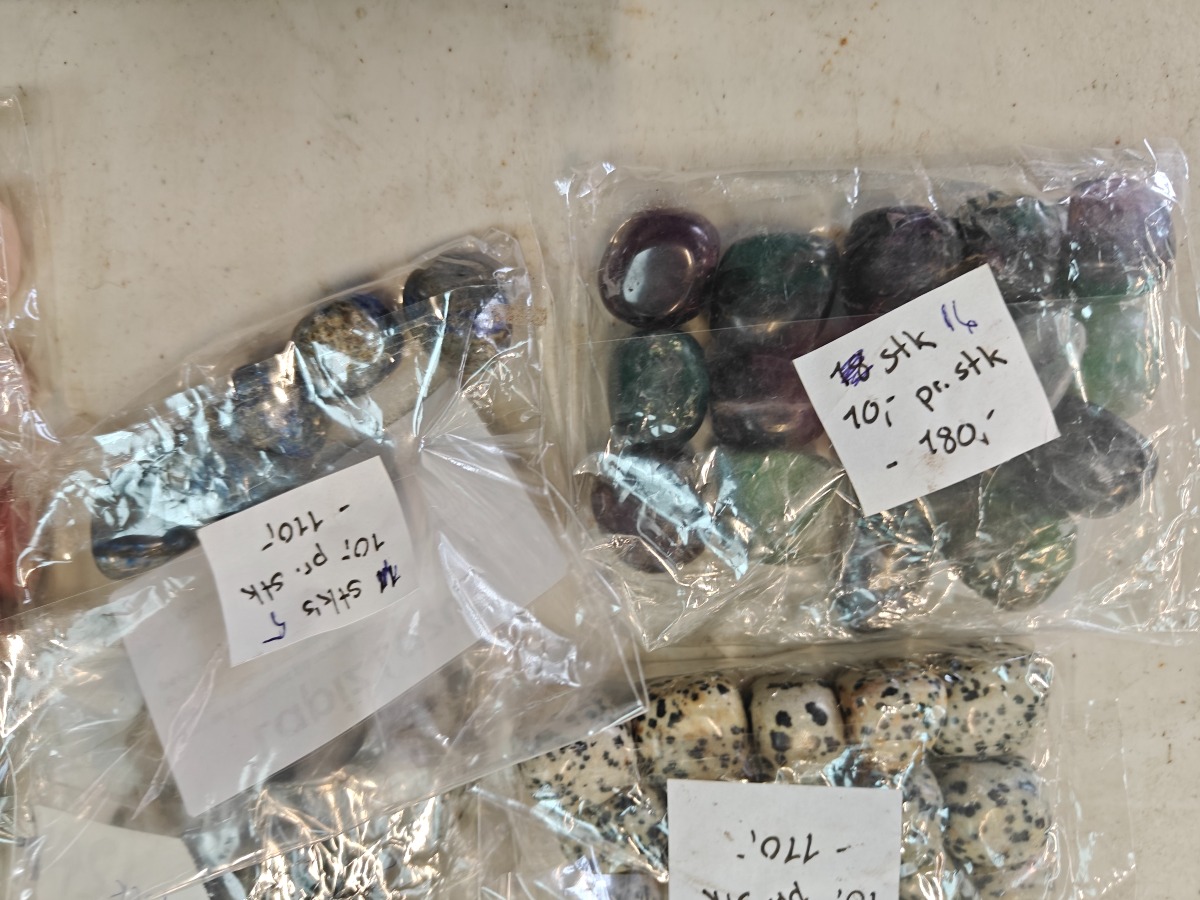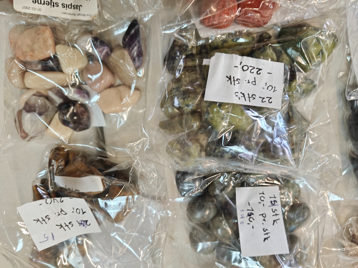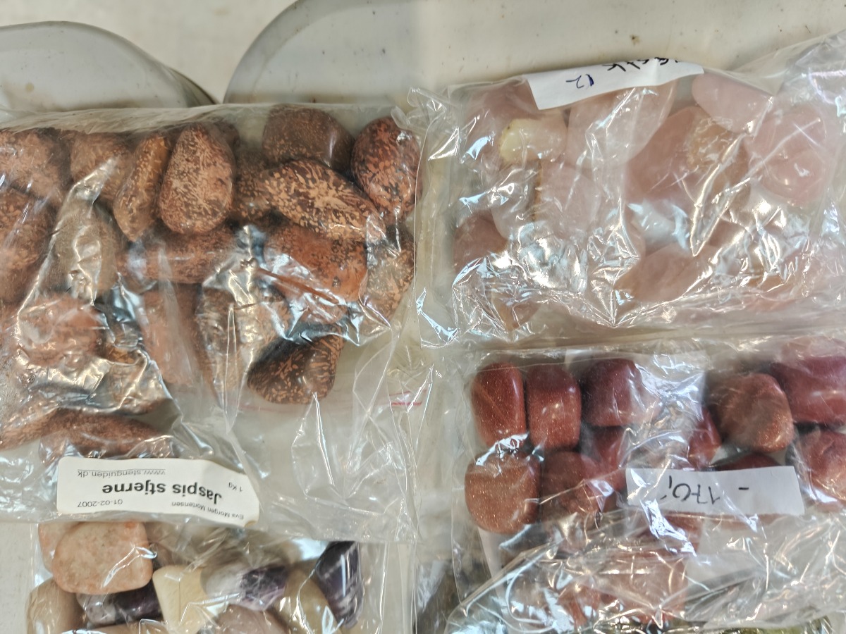 Samling af forskellige polerede sten til healing. Opdelt i poser efter type.