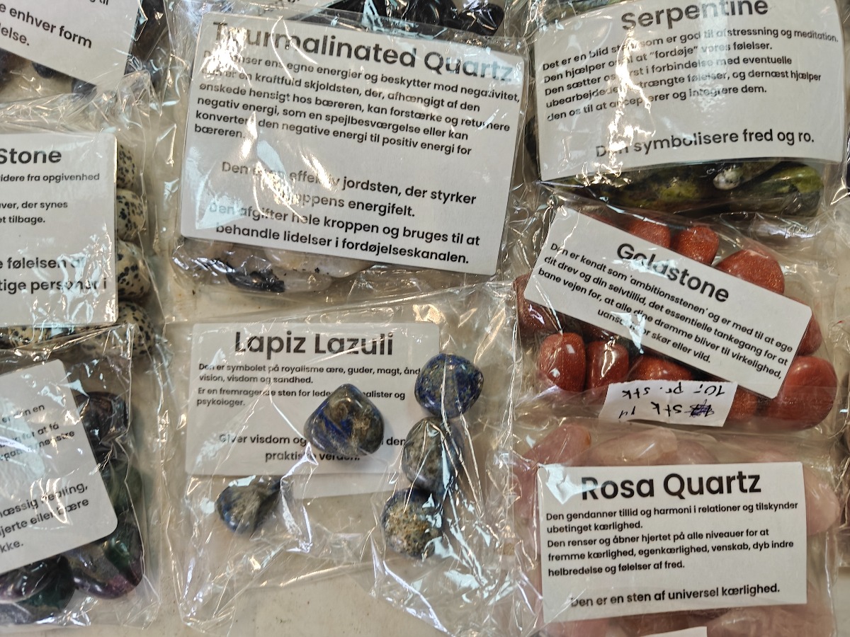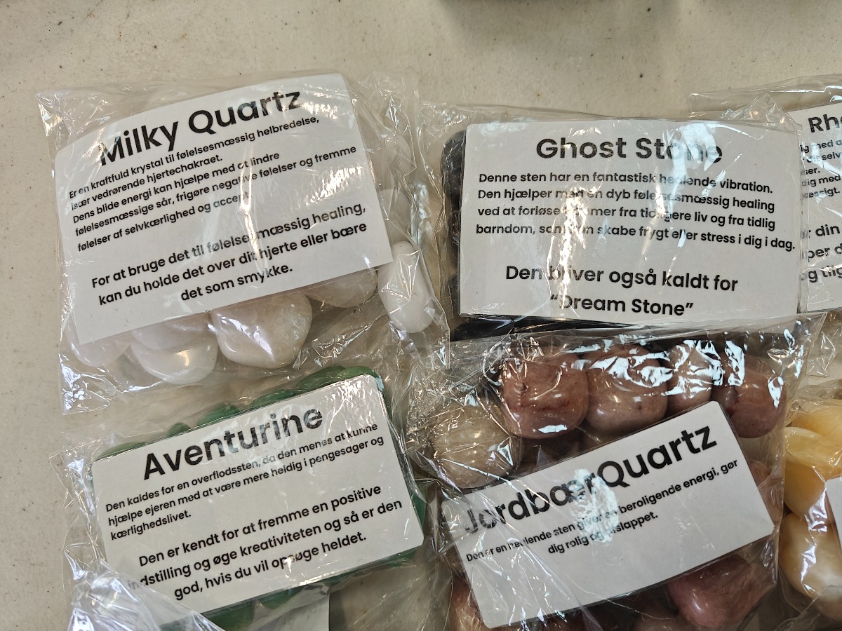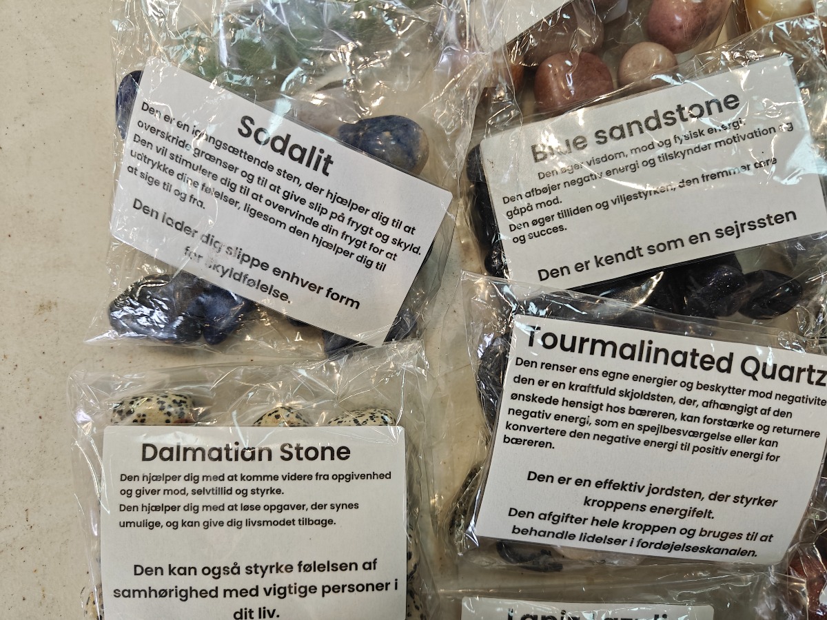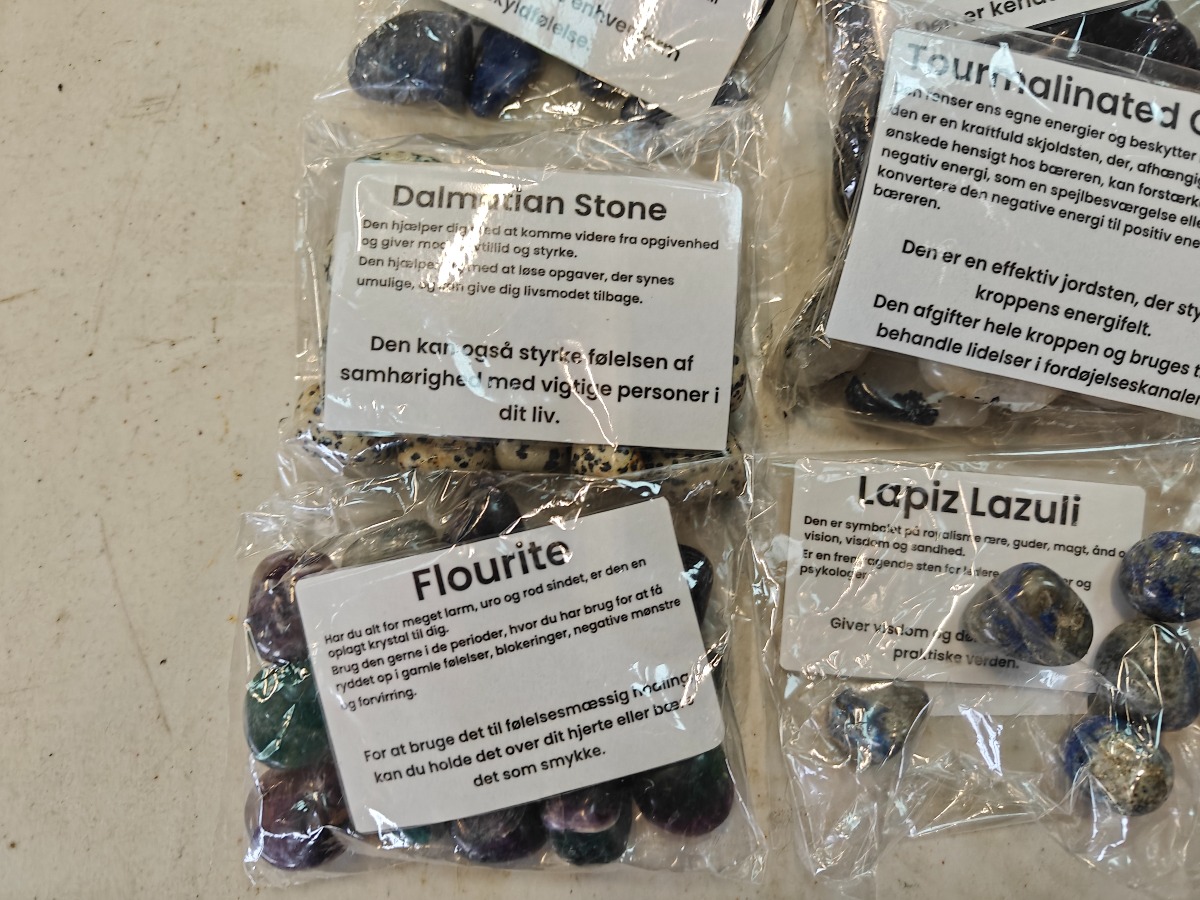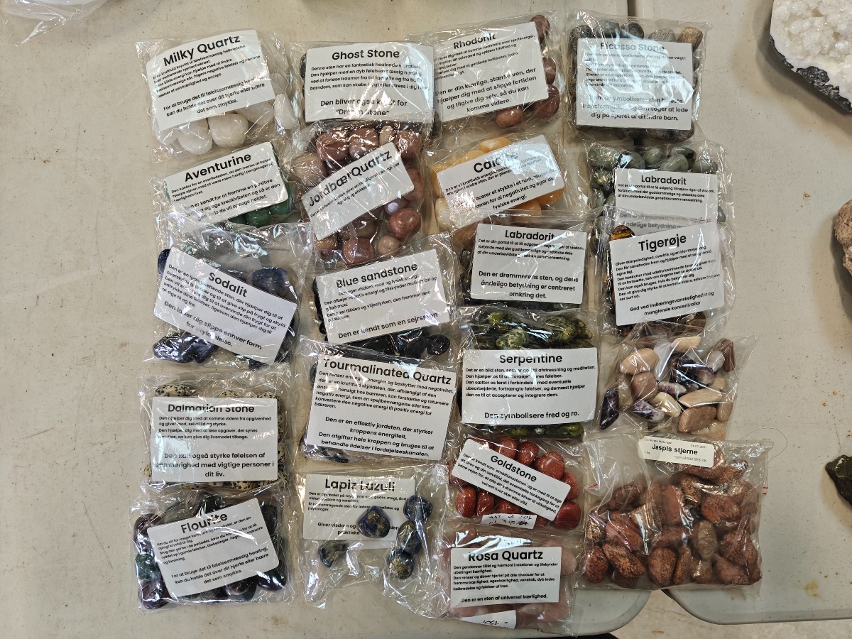 Samling af forskellige polerede sten til healing. Opdelt i poser efter type.