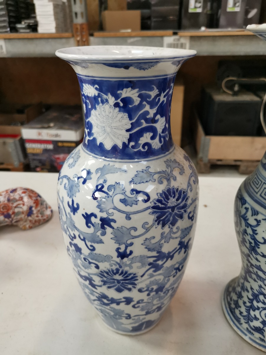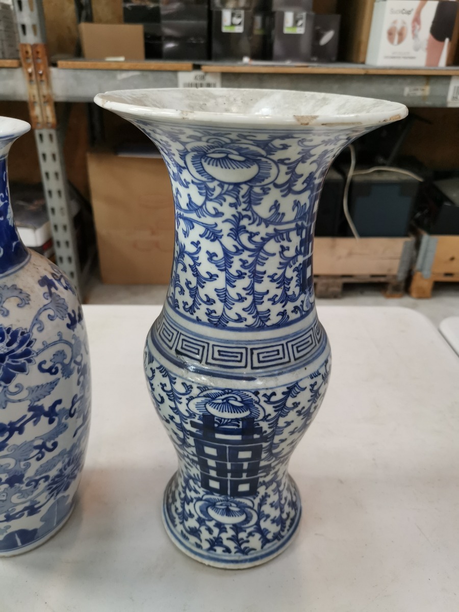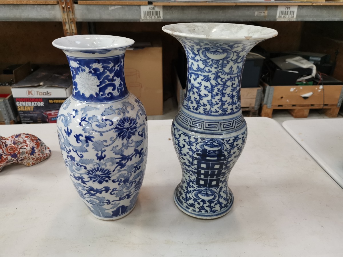 2 kinesiske vaser med blåmalet motiv. H. for største 37 cm.
