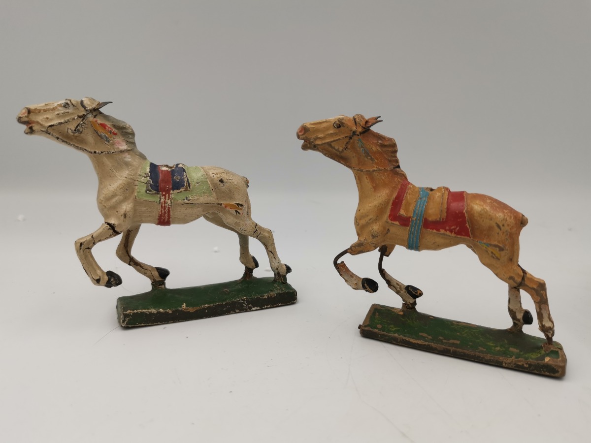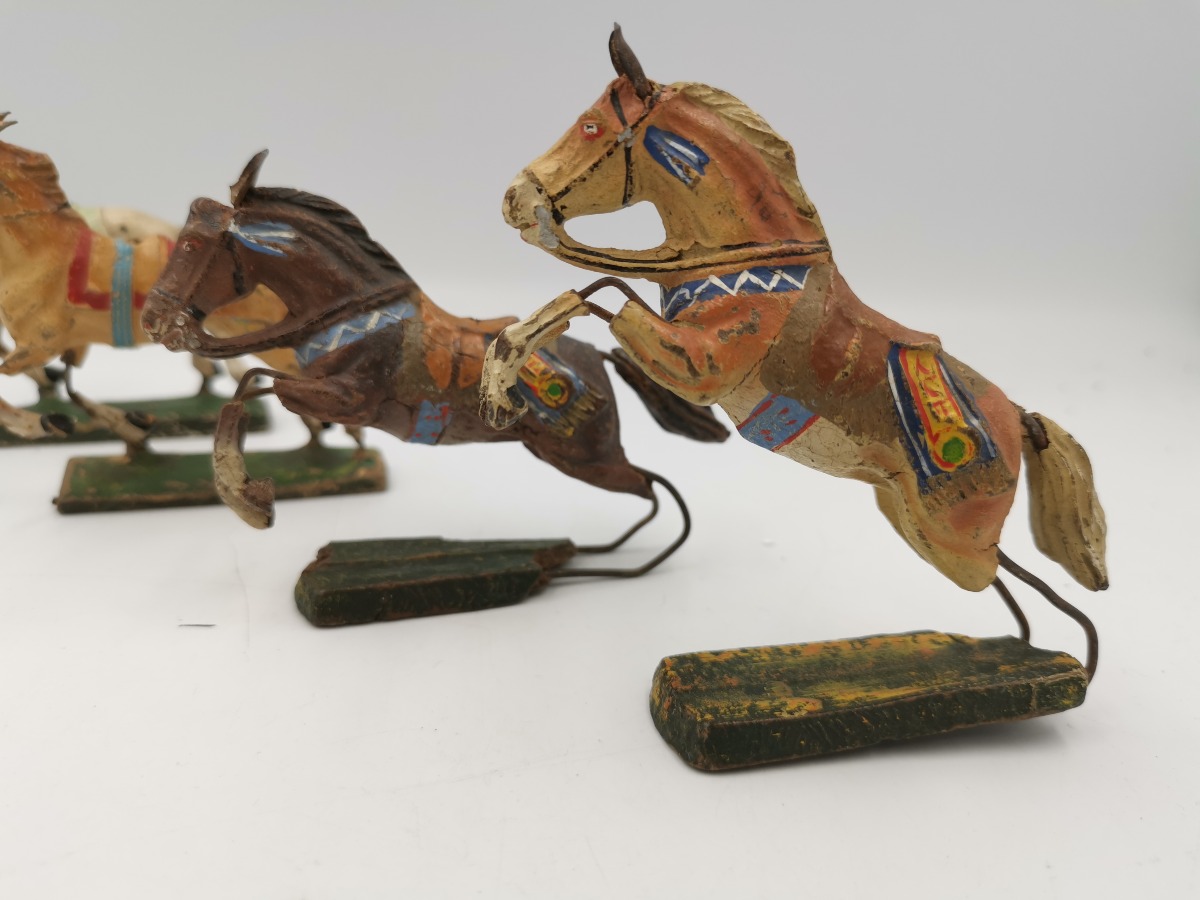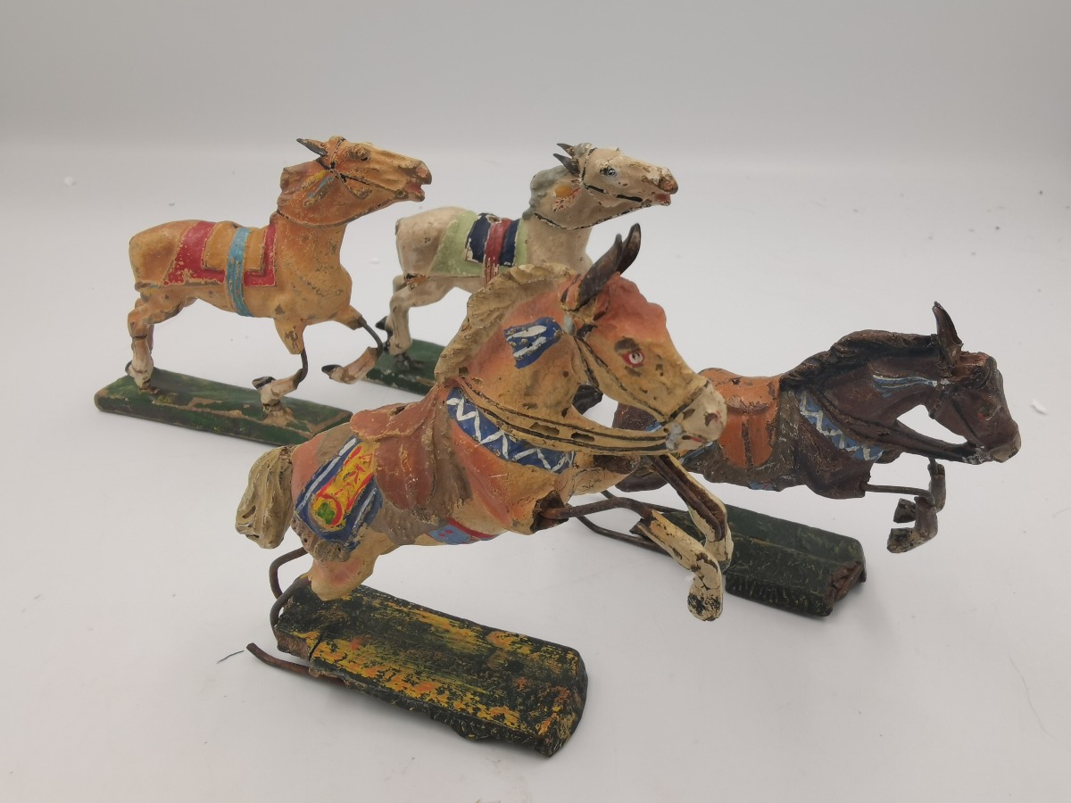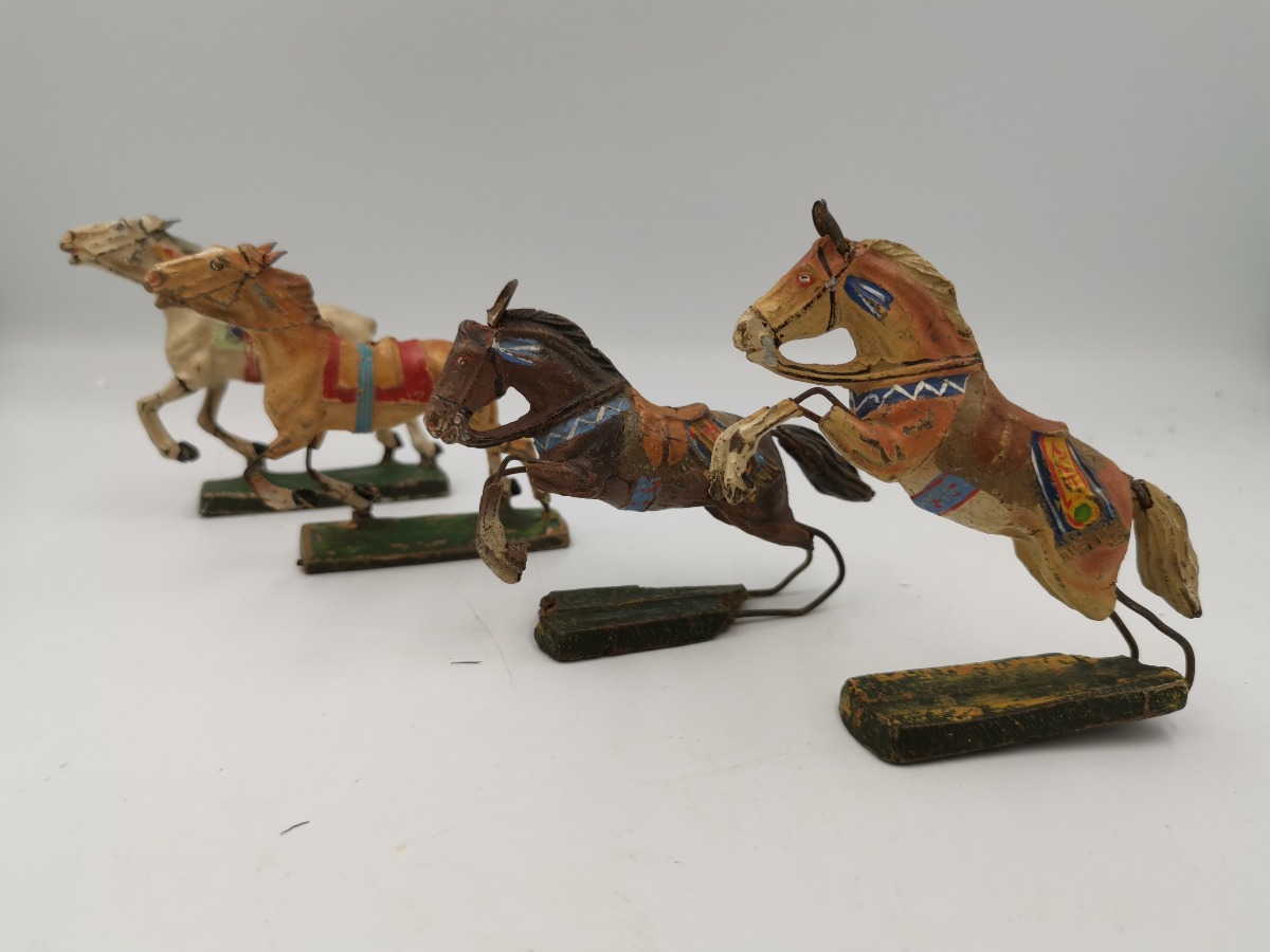 Elastolin og Lineol heste. To af hver. Fremstår med aldersrelateret slid og mangler.