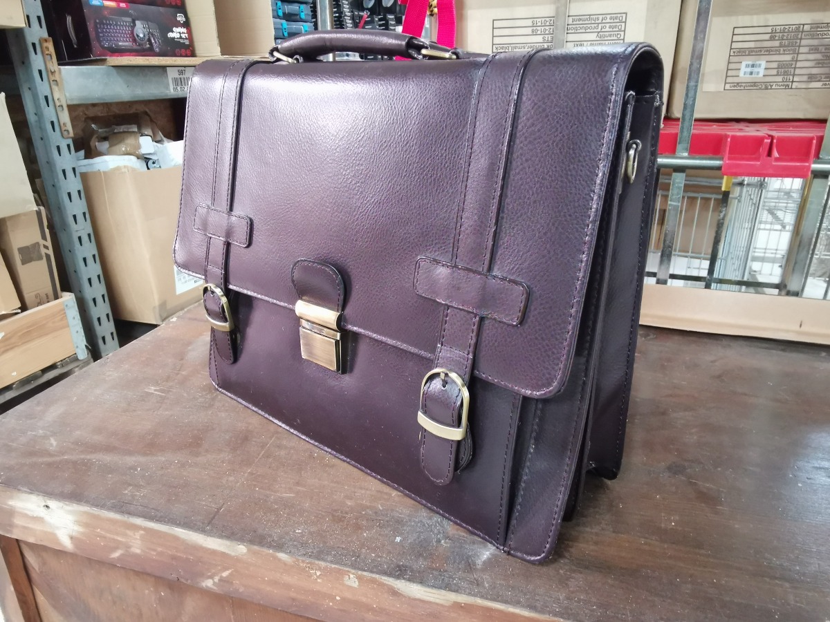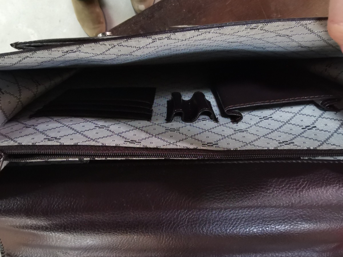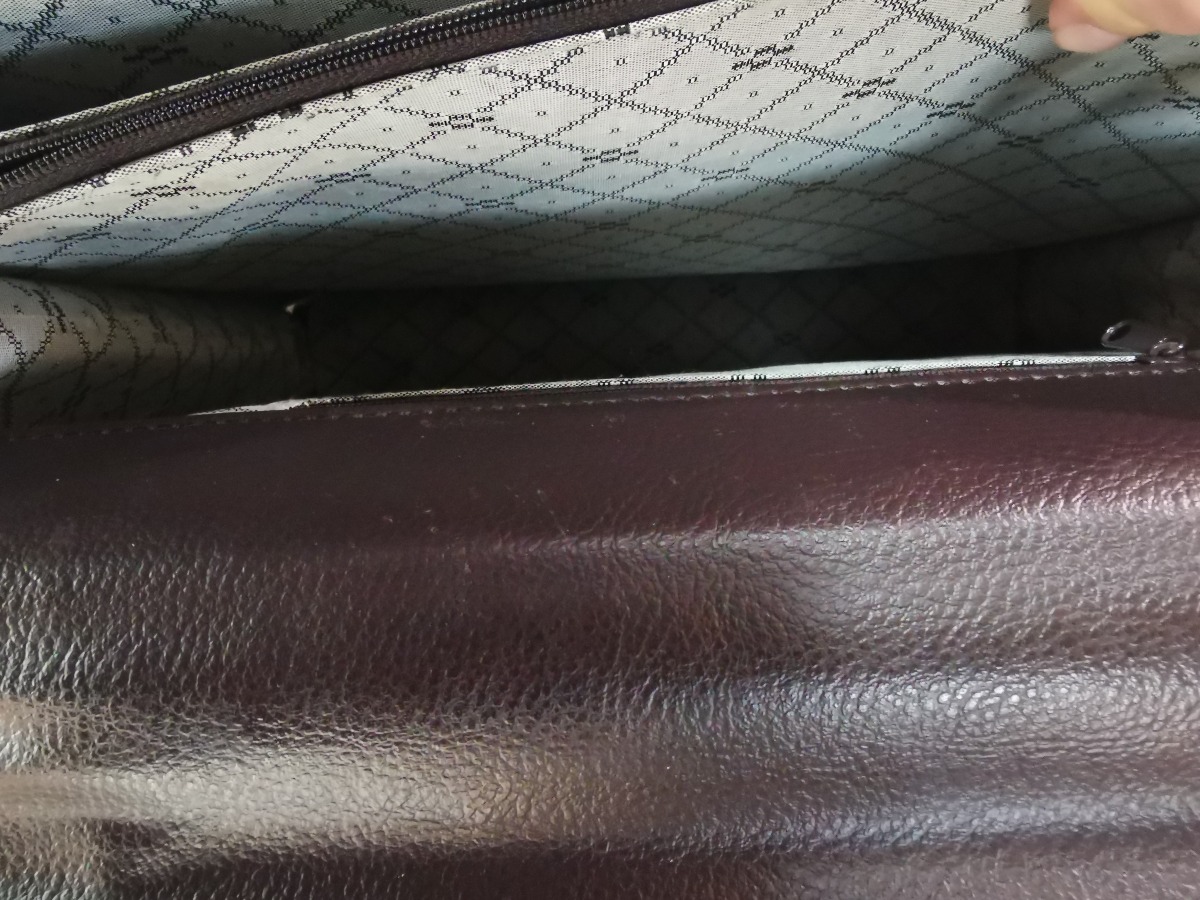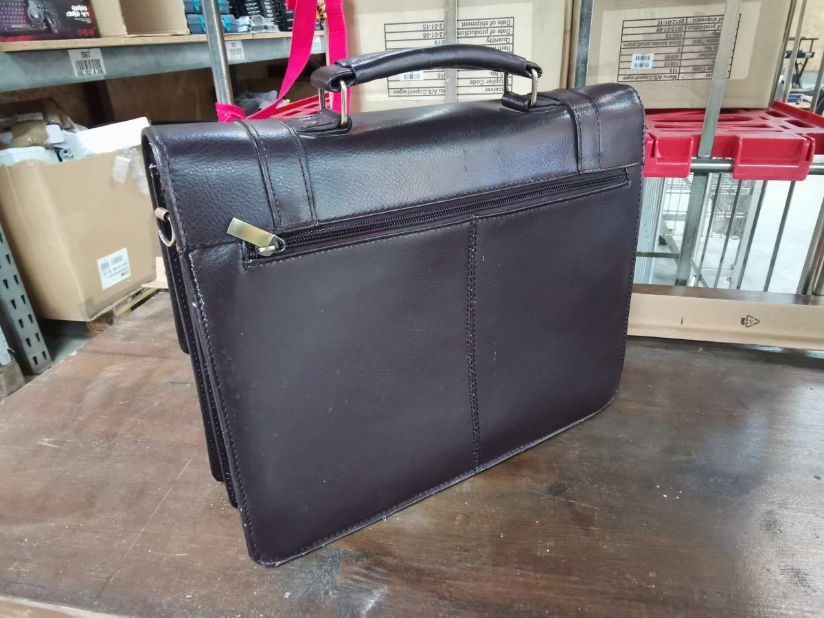 Håndtaske af rødbrunt kunstlæder. Indrettet med mange rum. Str. ca. 20 x 30 cm.