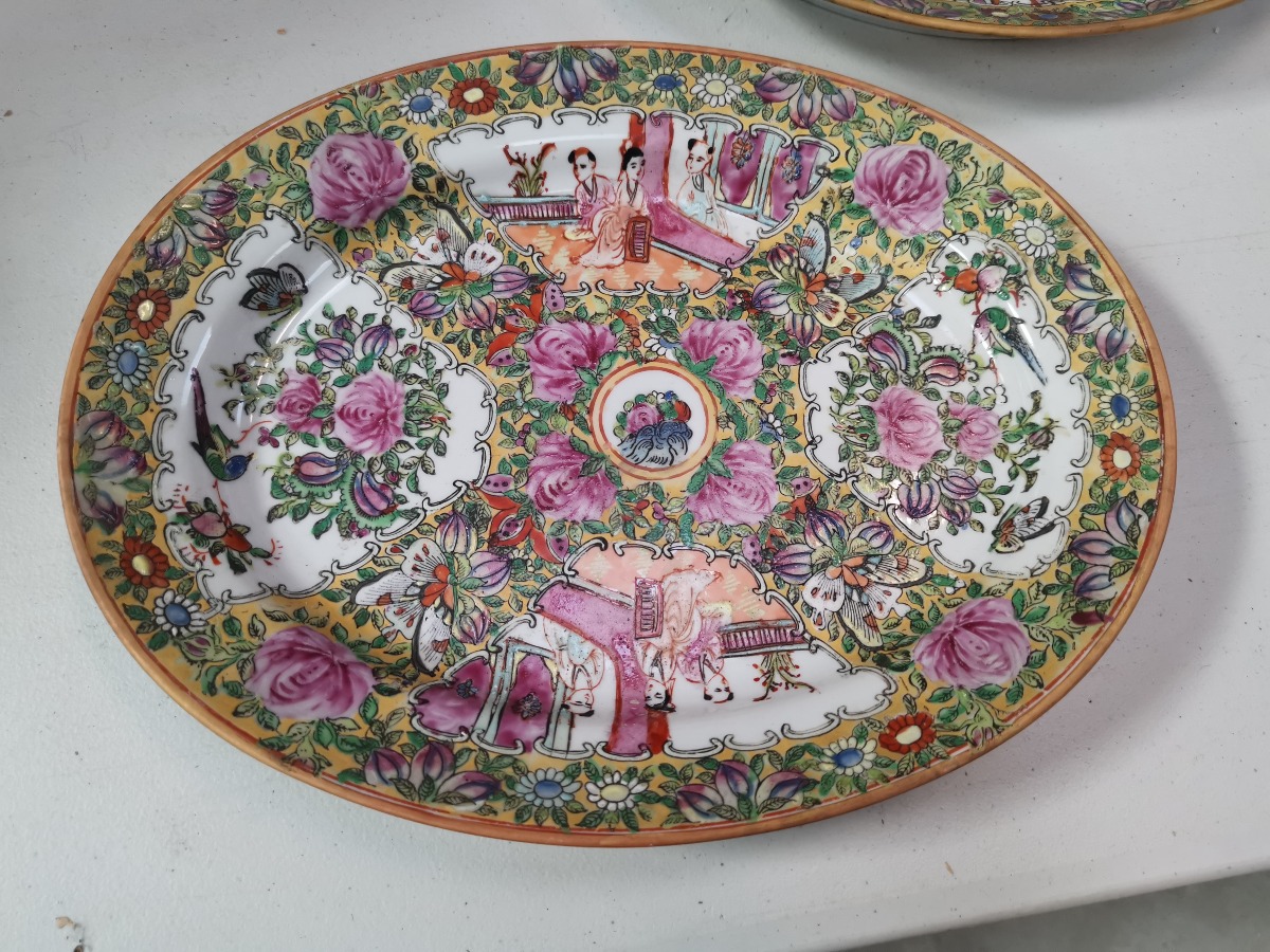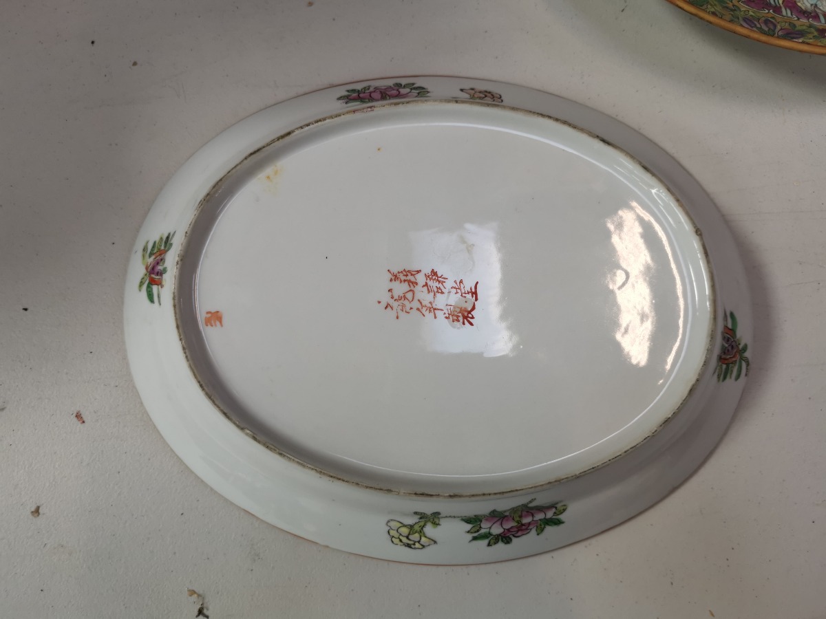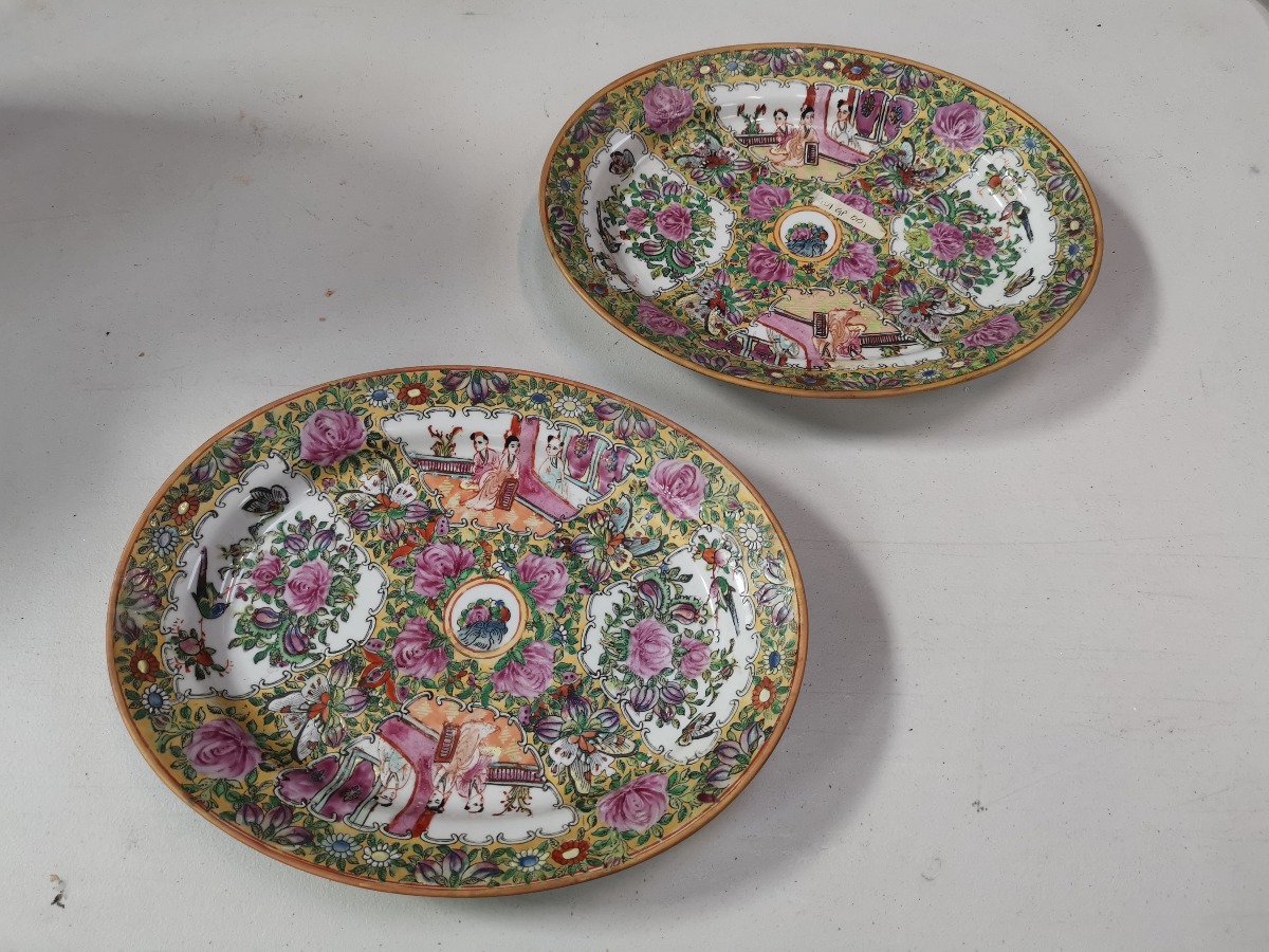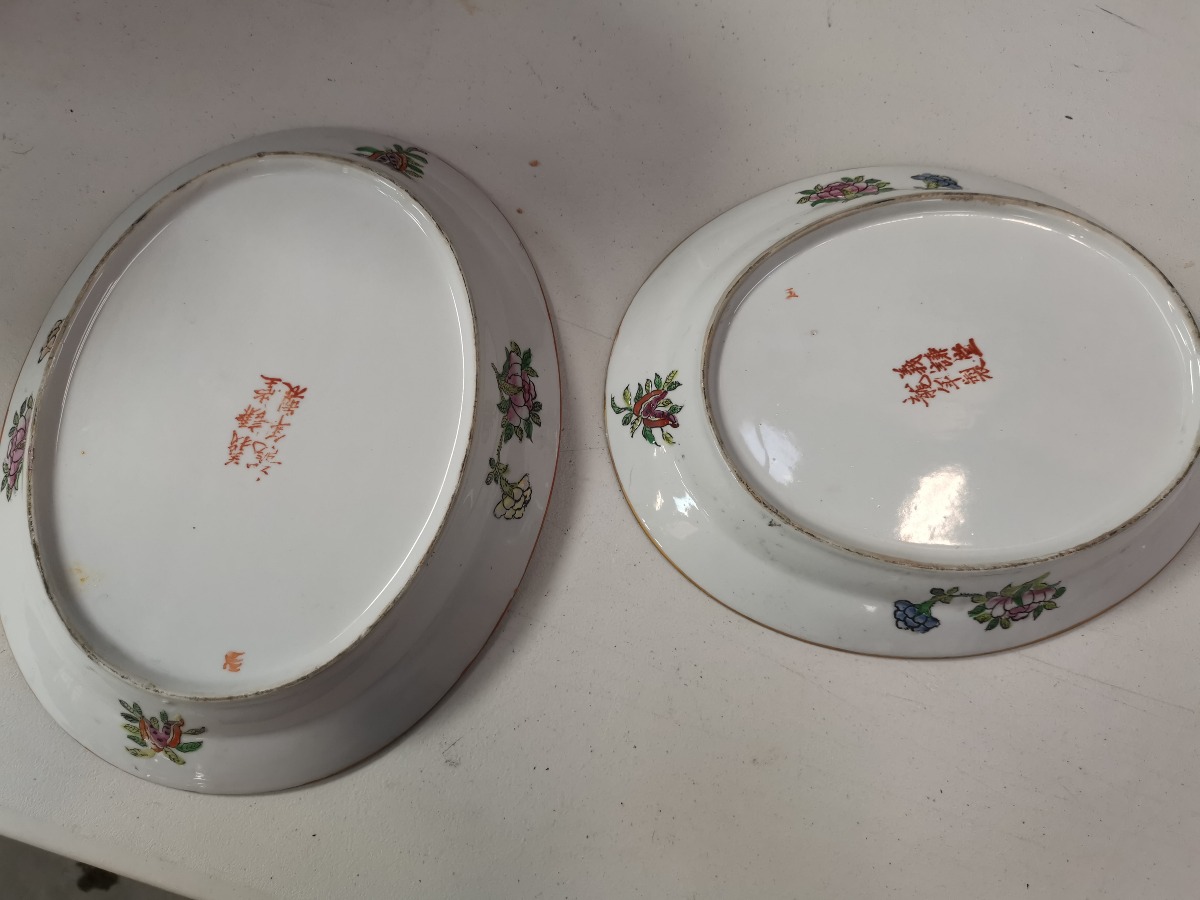 Par kinesiske ovale fade. 29 x 23 cm. Rigt prydet med kinserier og florale motiver.