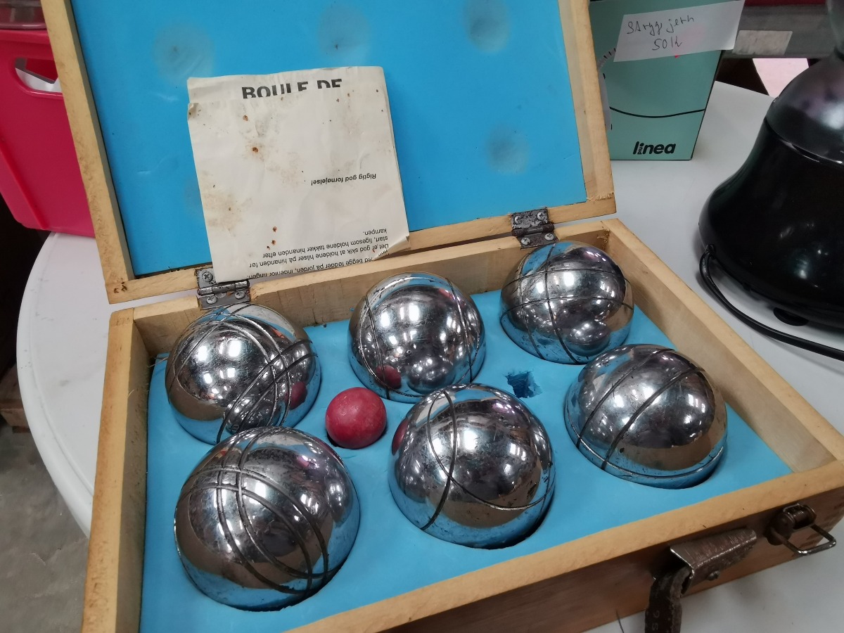 Petanque-sæt i kasse. Afstandssnor mangler.
