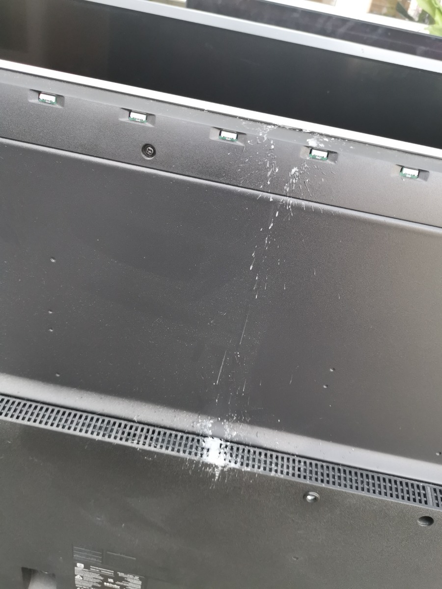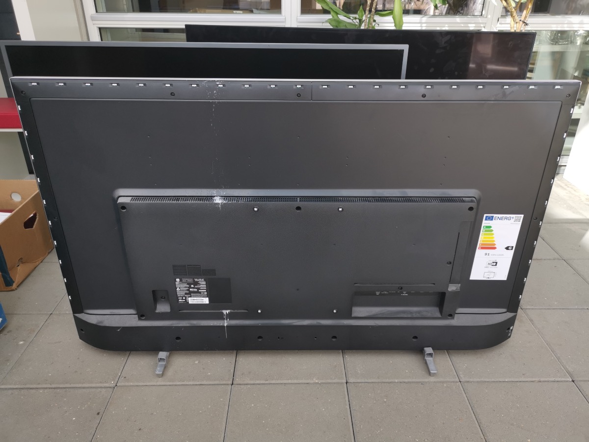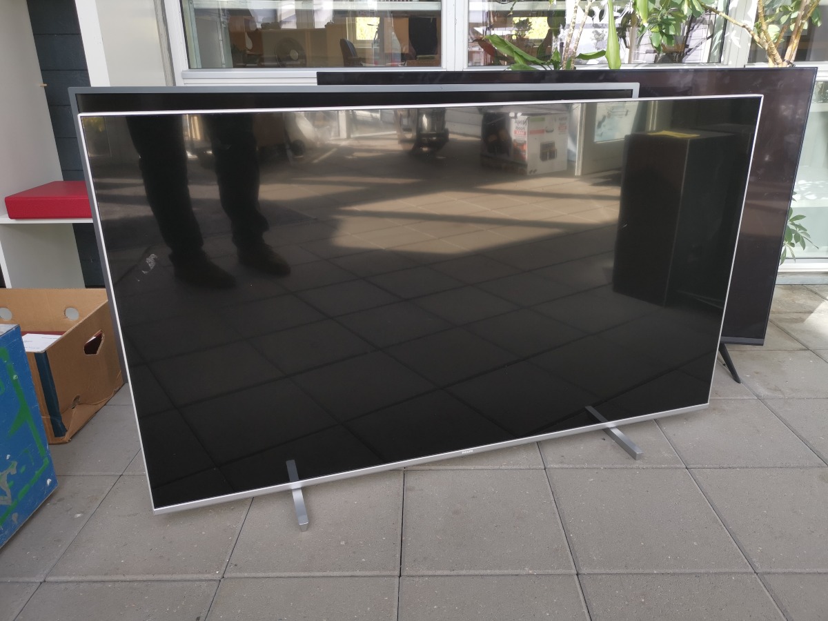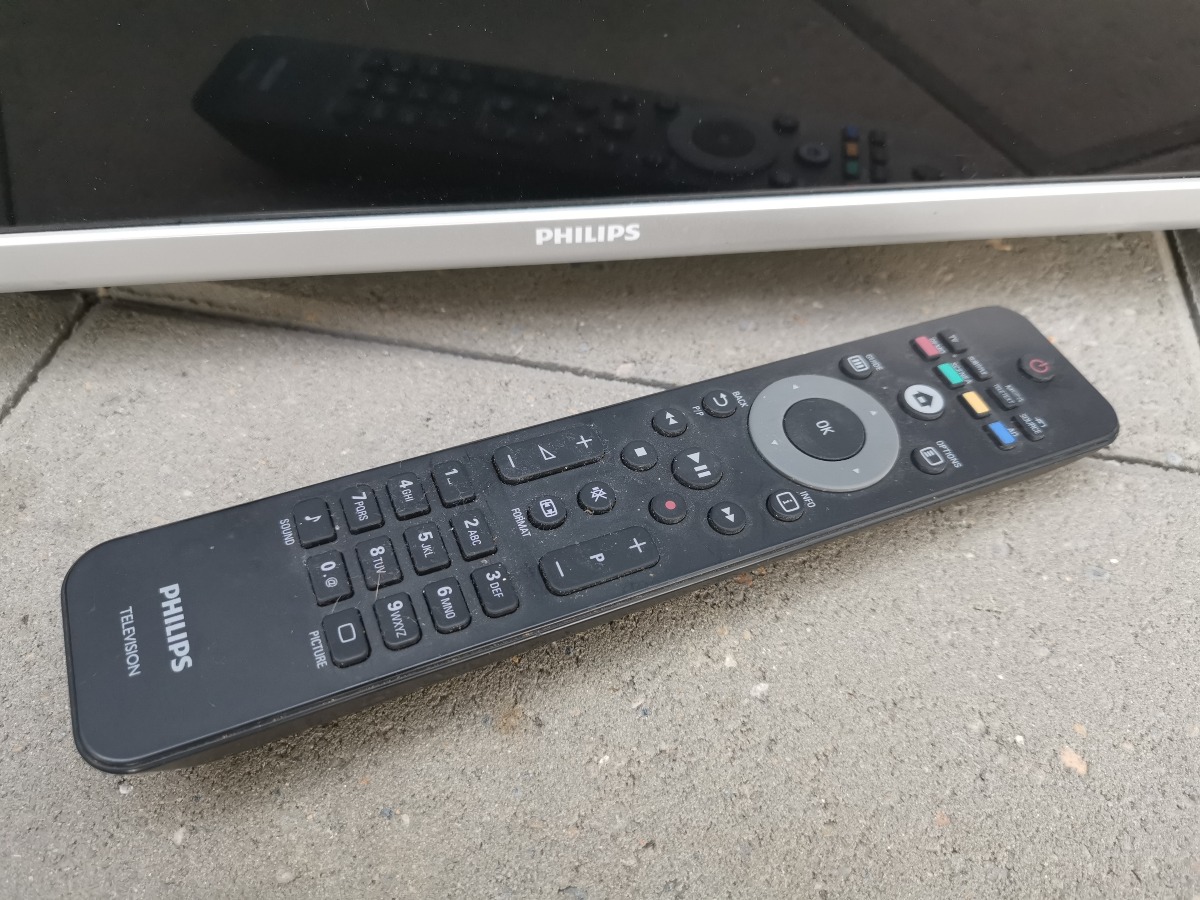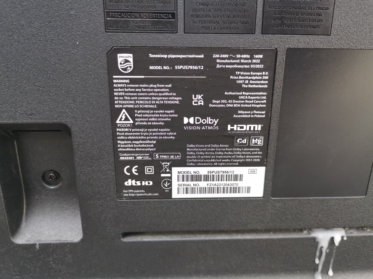 Philips 55" TV model 55PUS7956/12. Fjernbetjening og netledning medfølger. Der er løbet stearin ned på bagsiden af kabinettet.