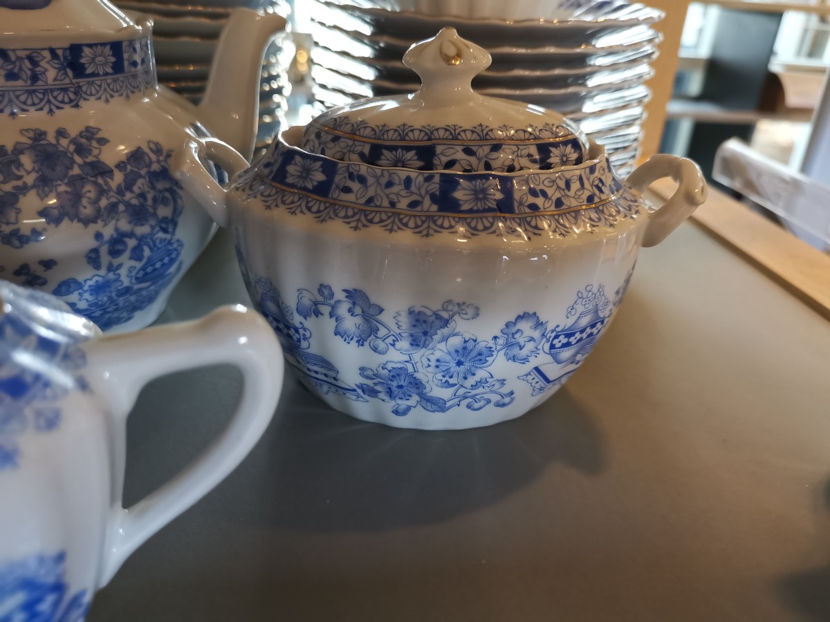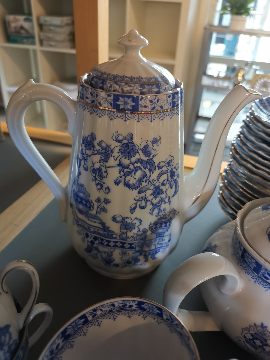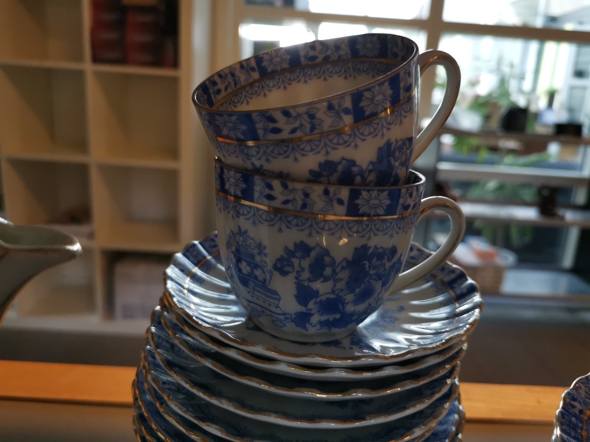 Tysk kaffe-/testel med blå dekoration med kineserier samt guldkant. mindre ubetydelige skader forekommer.
