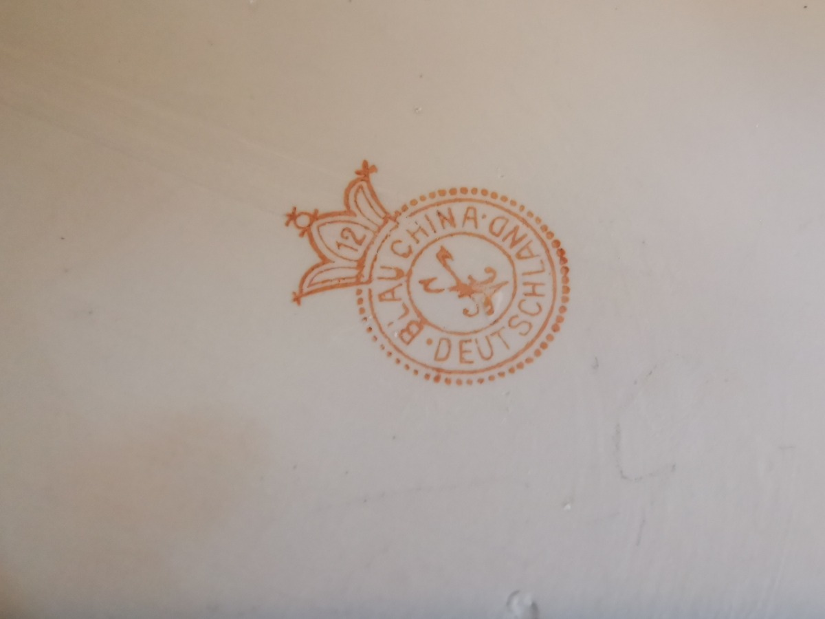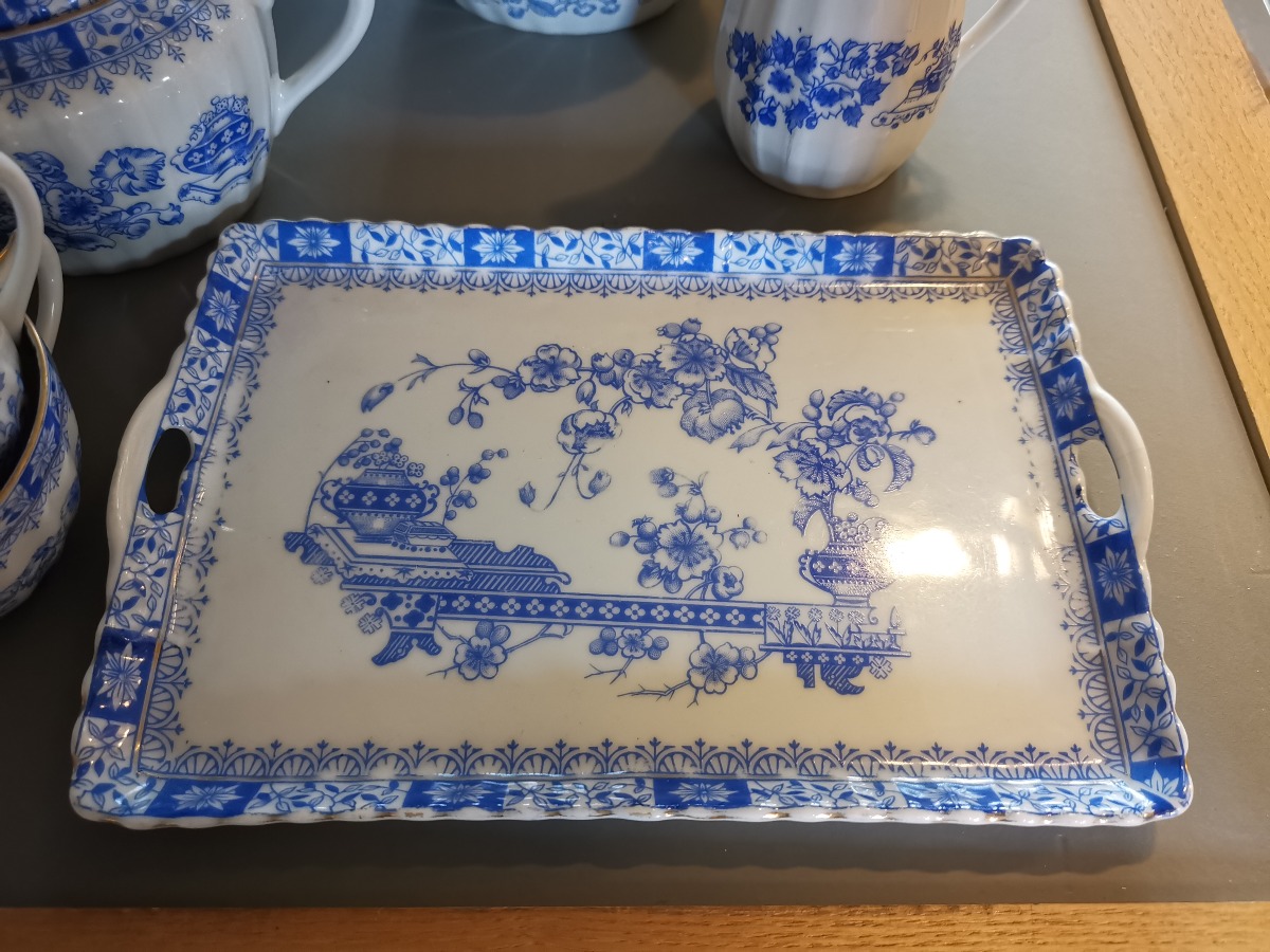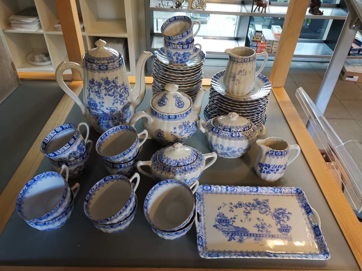 Tysk kaffe-/testel med blå dekoration med kineserier samt guldkant. mindre ubetydelige skader forekommer.