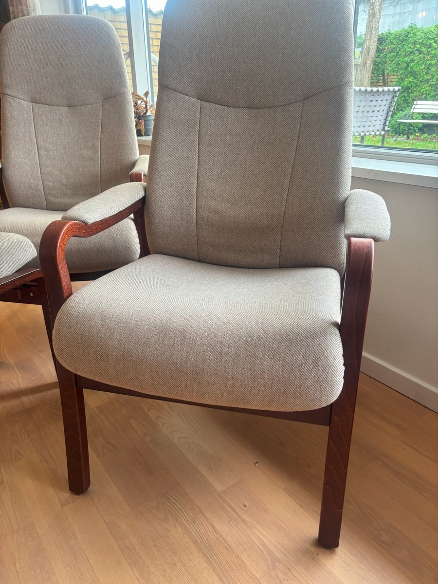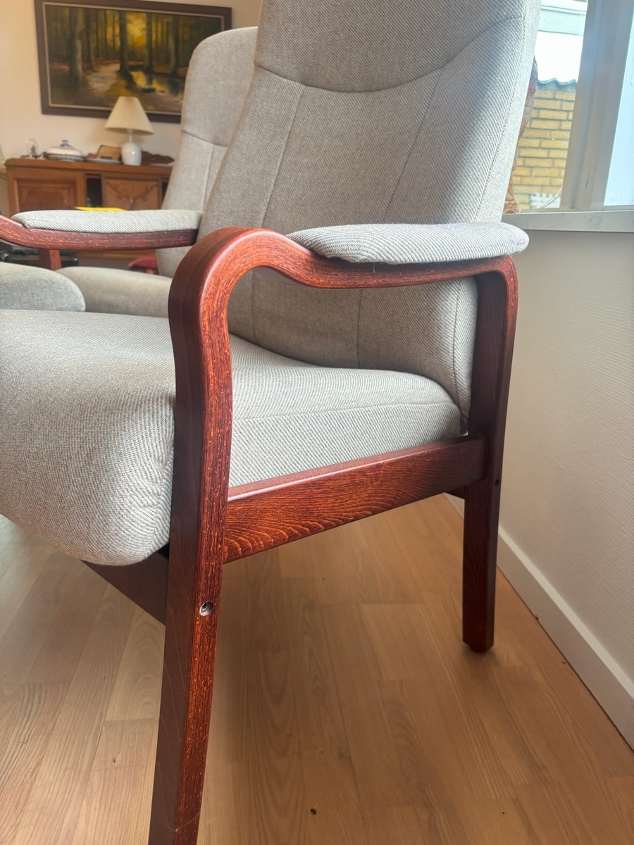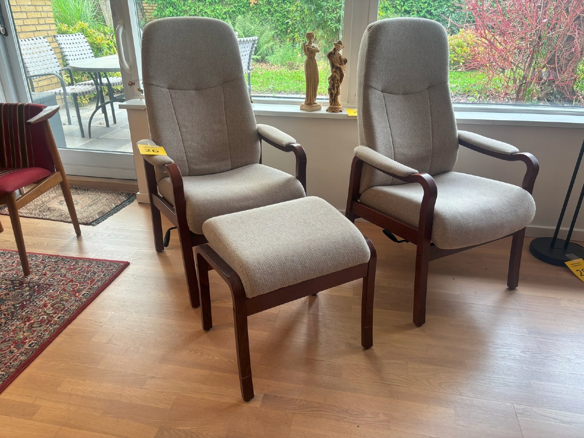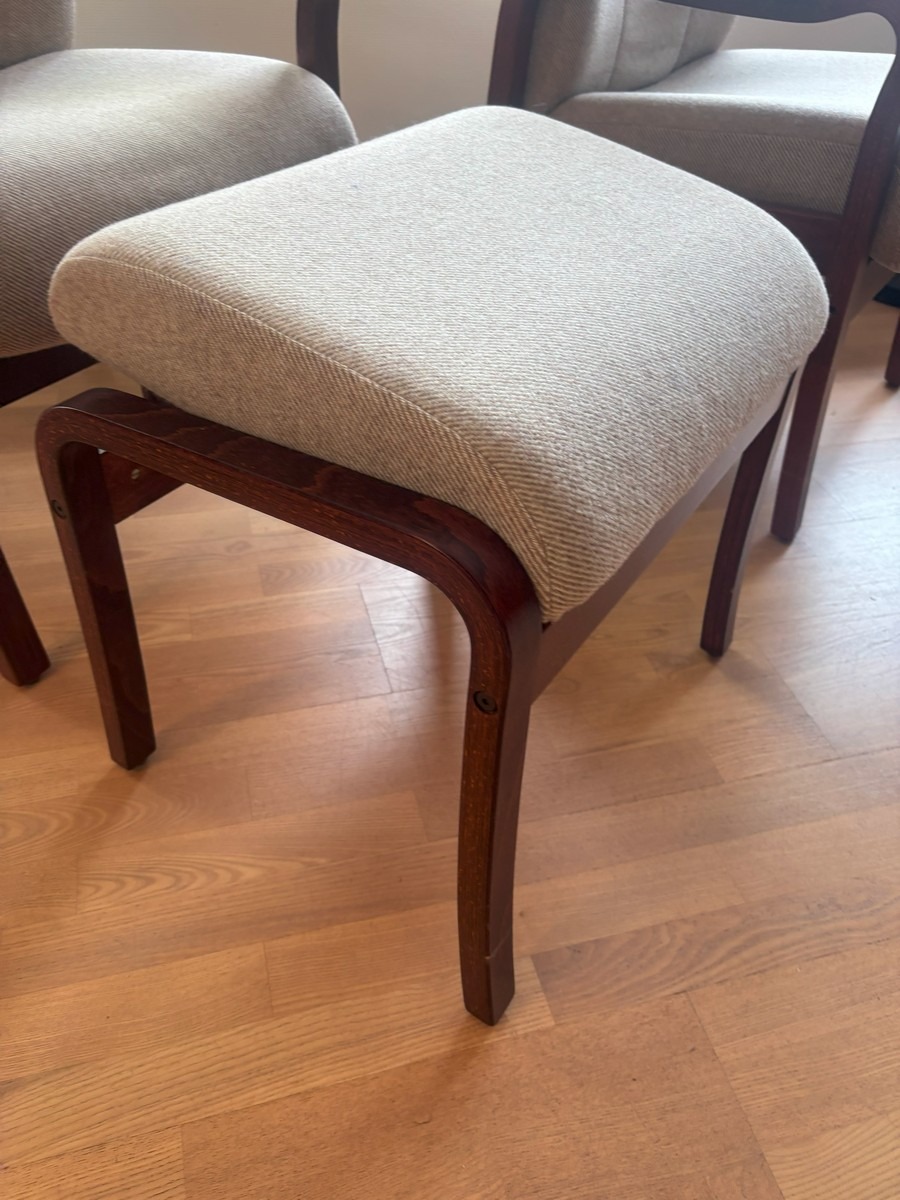 2 otiumstole af mørkbejdset bøg samt 1 skammel. Monteret med beige stribet uld. Freemstår med let smuds.