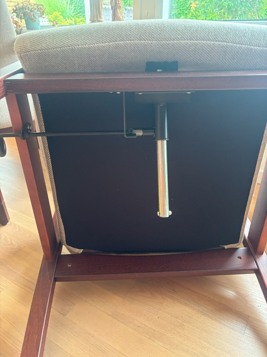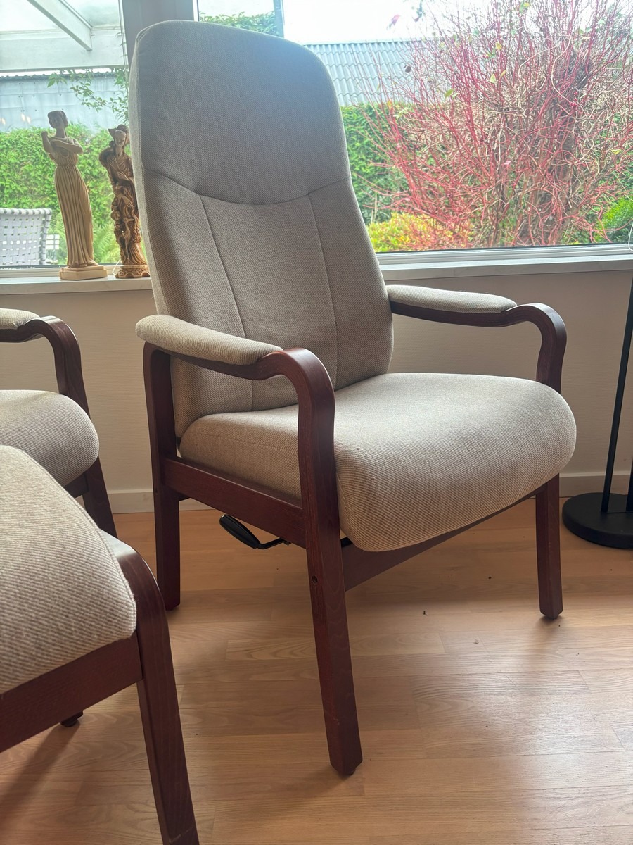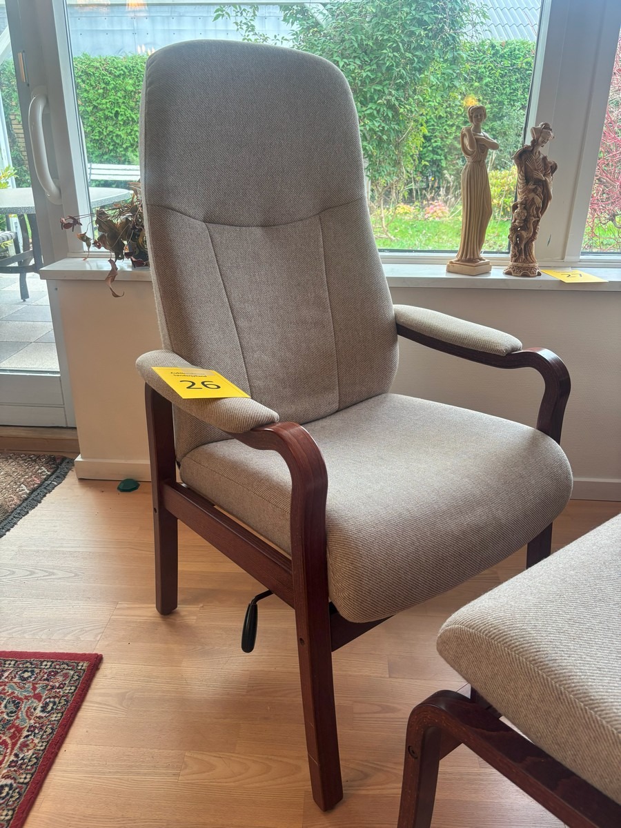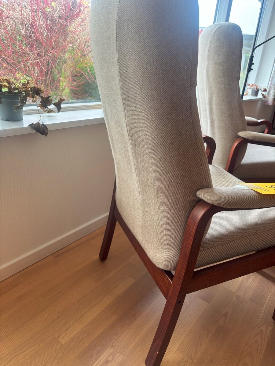 2 otiumstole af mørkbejdset bøg samt 1 skammel. Monteret med beige stribet uld. Freemstår med let smuds.