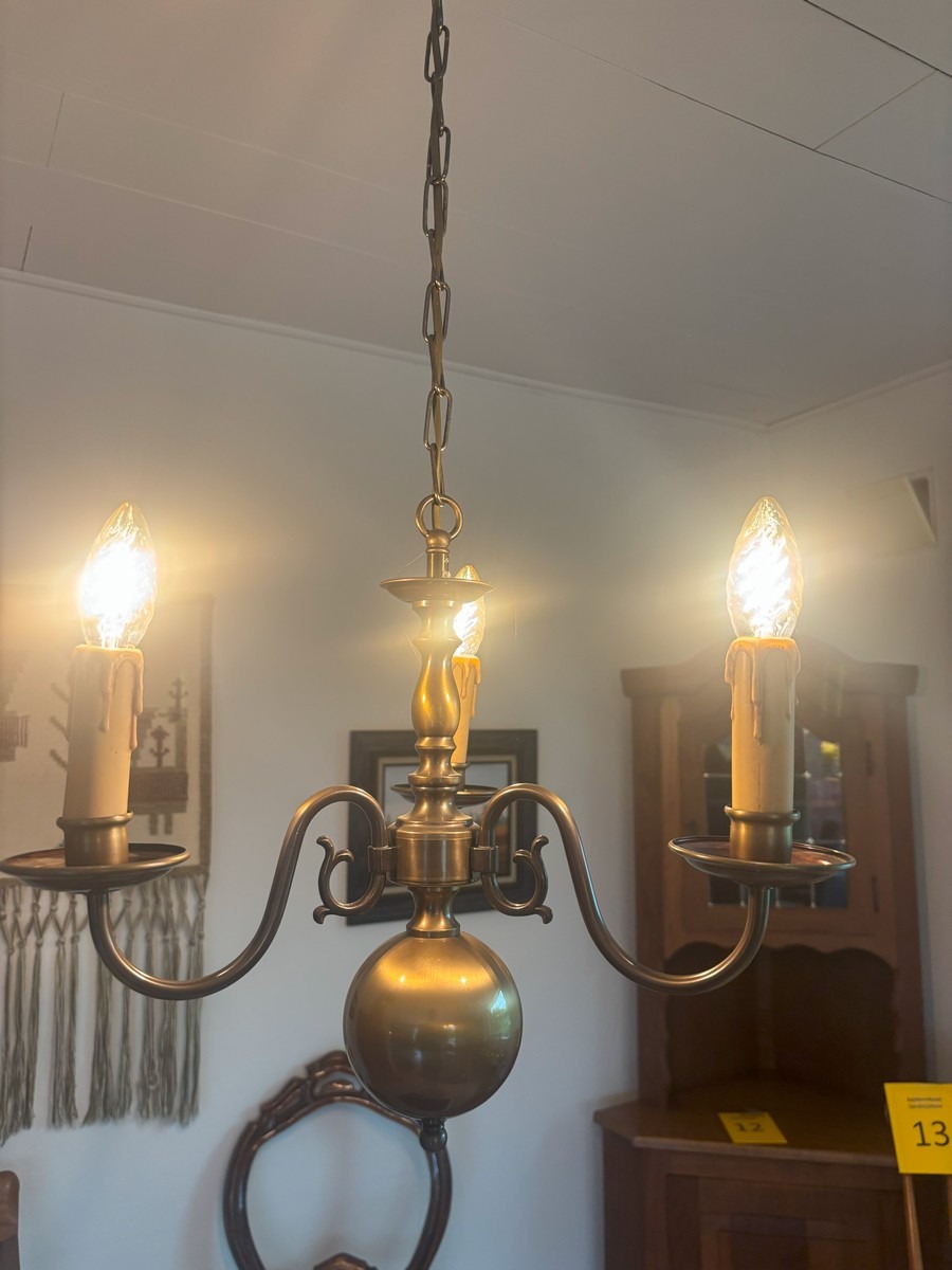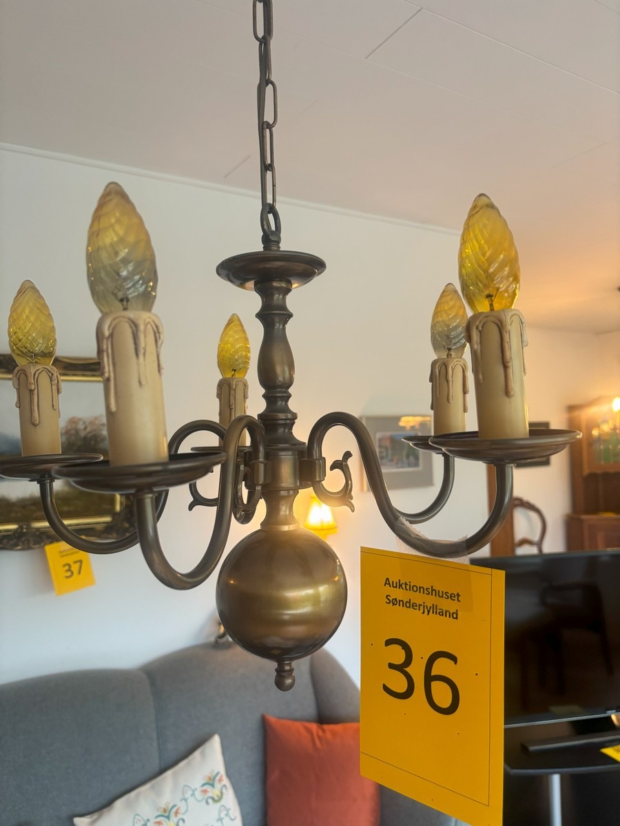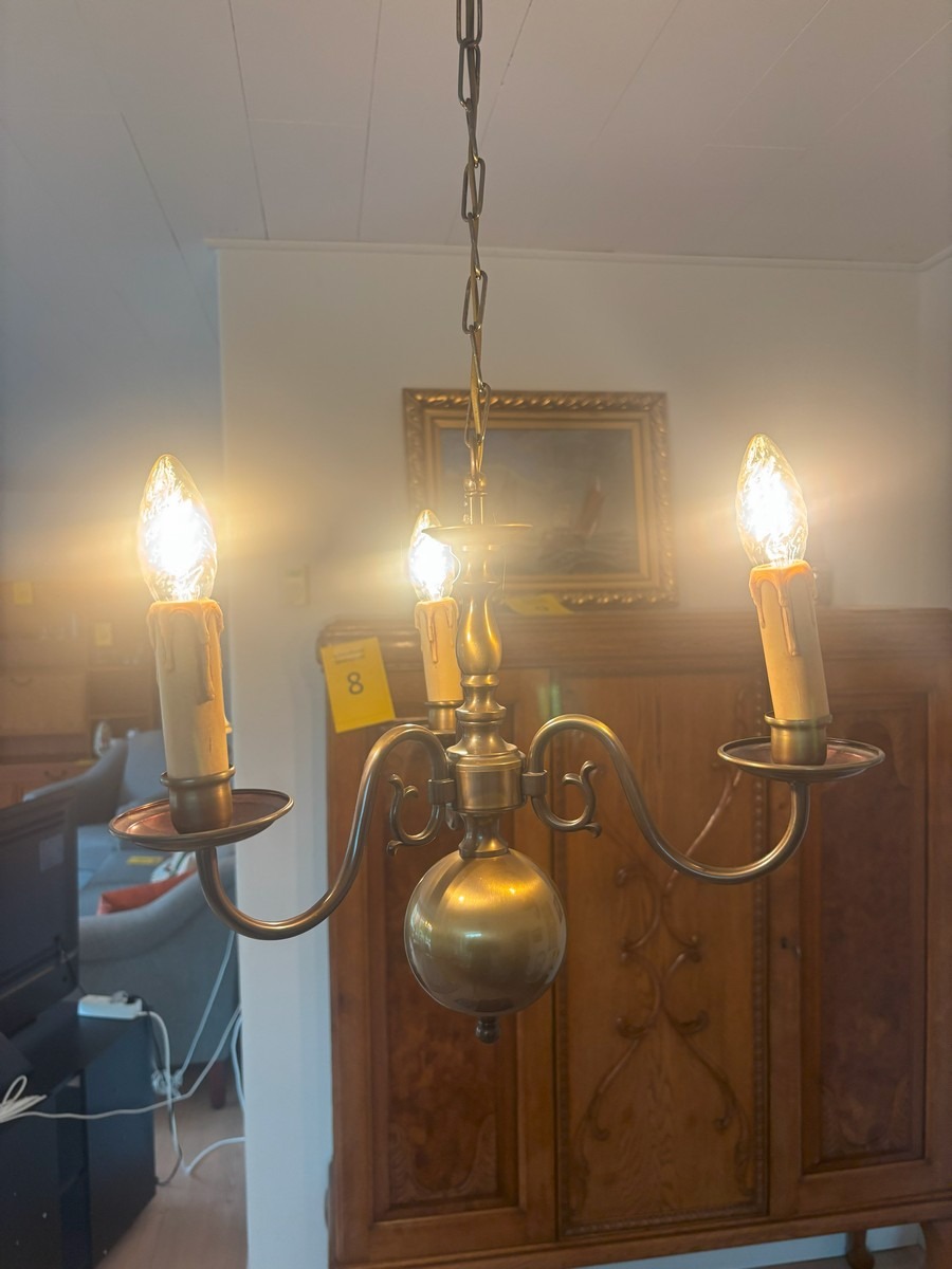 3 barokform loftkroner samt 2 lampetter. Alle del af bruneret messing. Ca. str. for loftkroner uden kæder H. 35, Æ, 40 cm. NB: KUNDEN SKAL SELV AFMONTERE LAMPERNE.