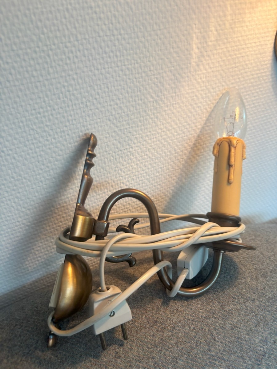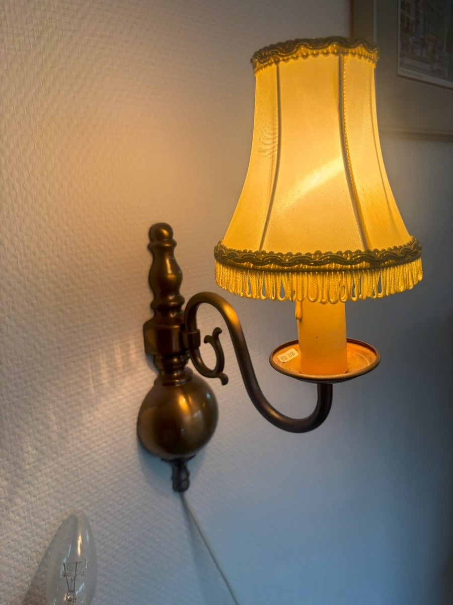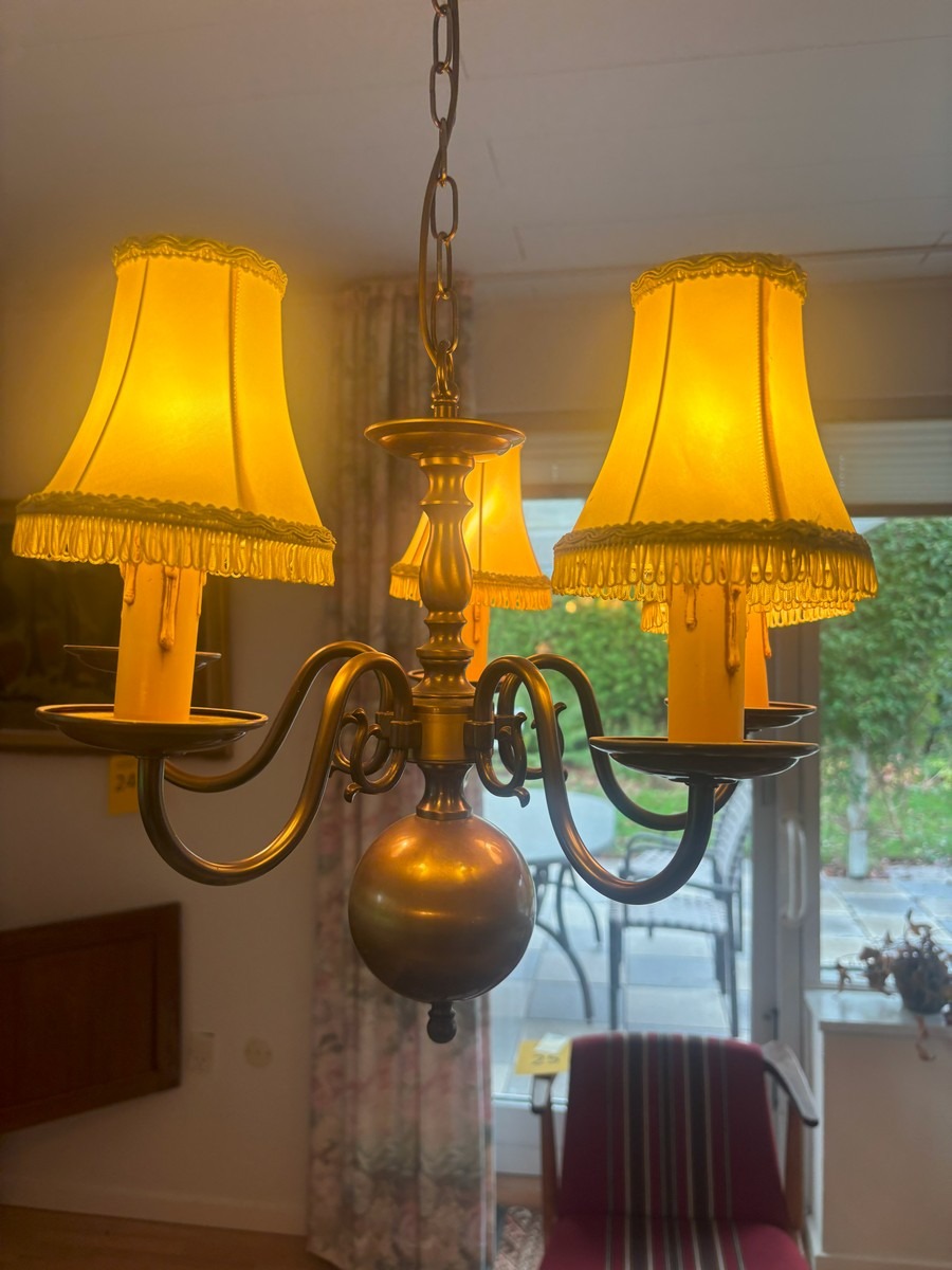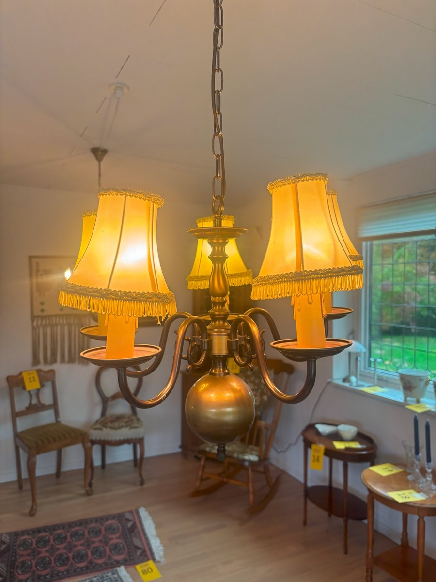 3 barokform loftkroner samt 2 lampetter. Alle del af bruneret messing. Ca. str. for loftkroner uden kæder H. 35, Æ, 40 cm. NB: KUNDEN SKAL SELV AFMONTERE LAMPERNE.