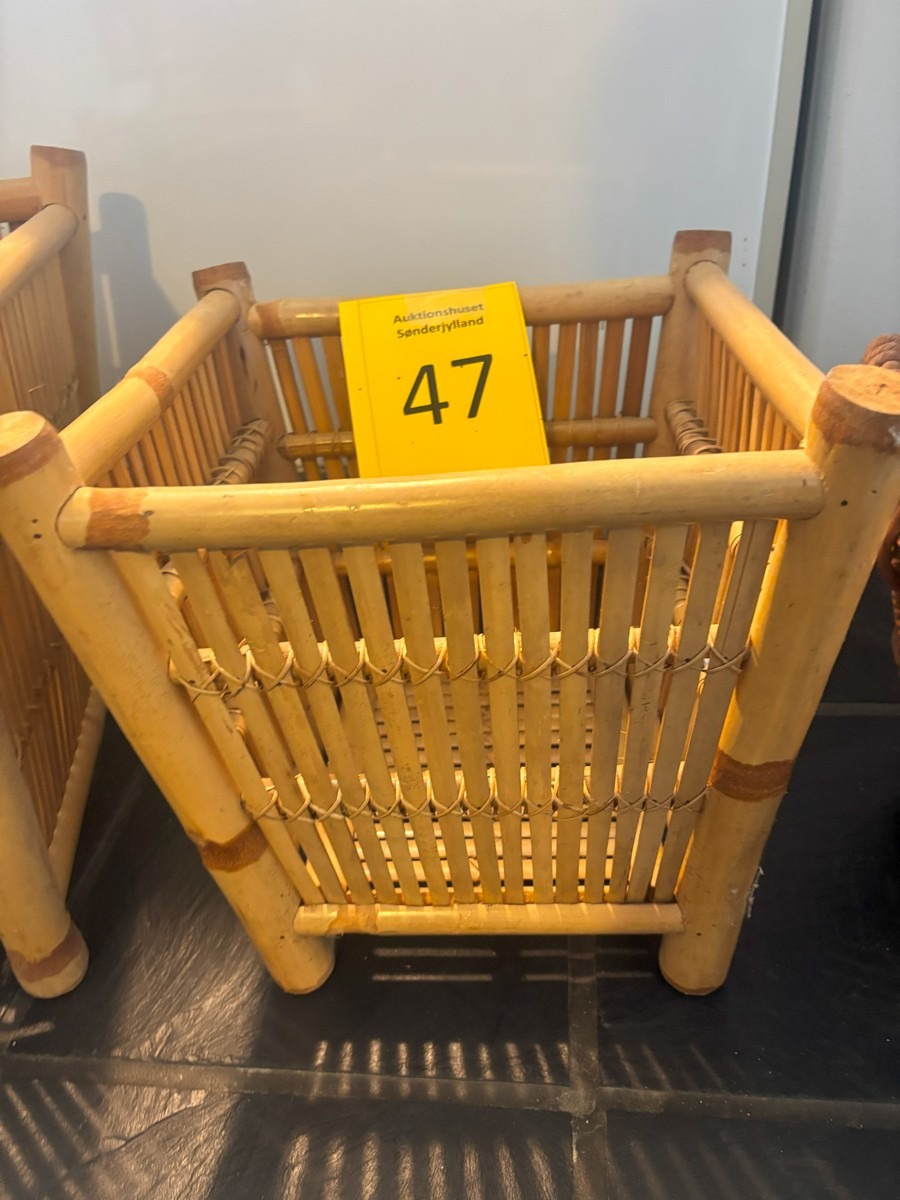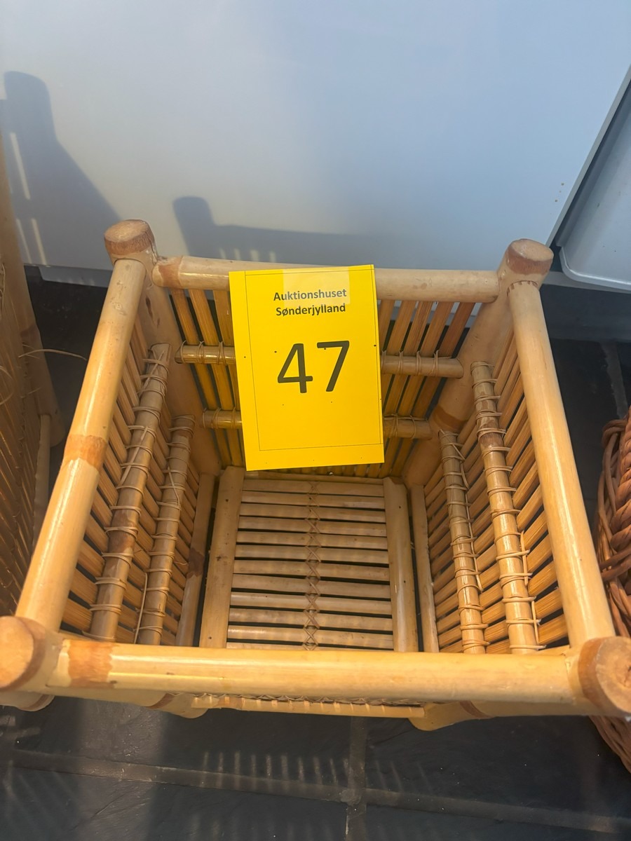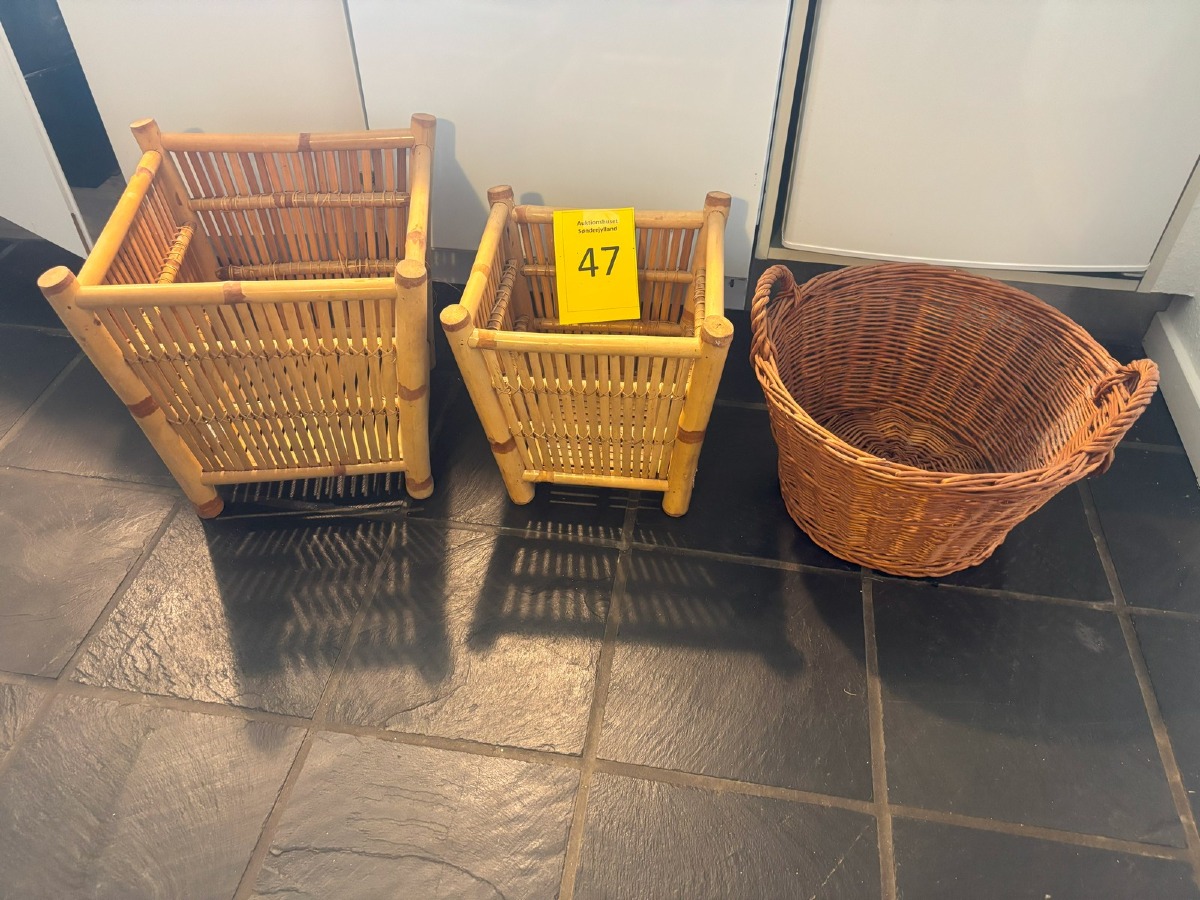 3 kurve. 2 kvadratiske af bambus og rund kurv af rødpil. største til sammenligning. 38 cm.