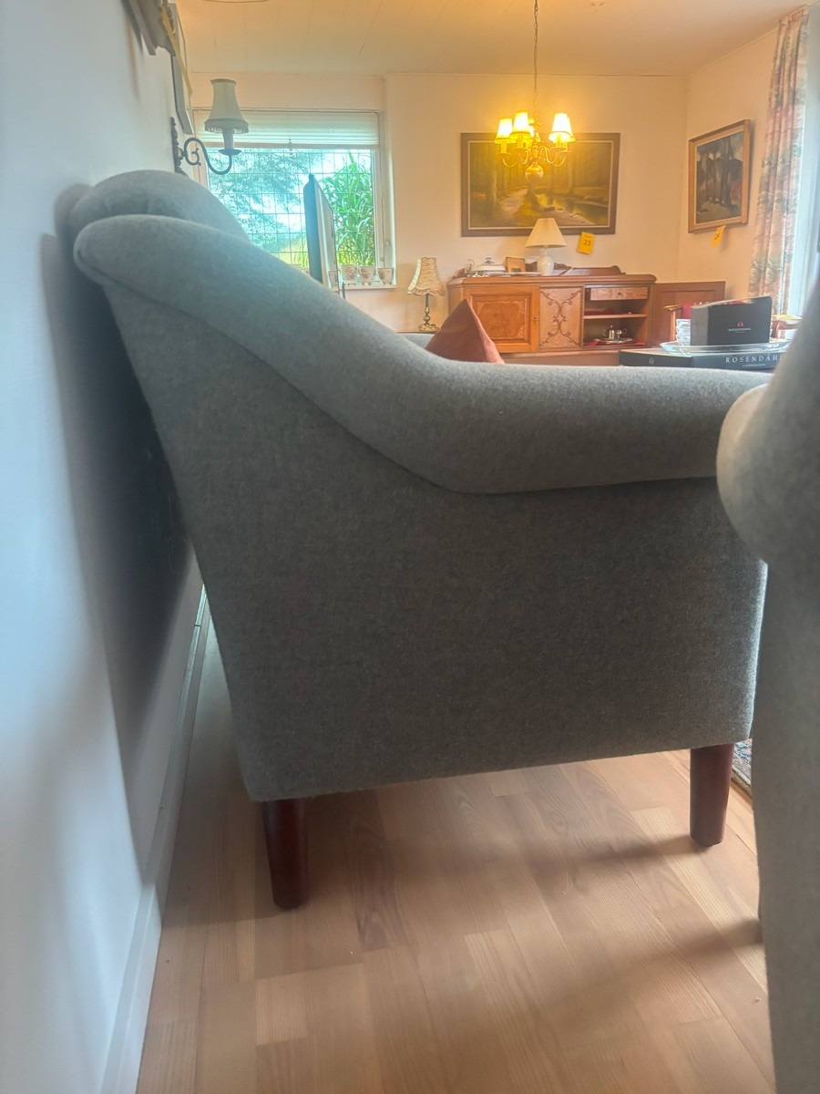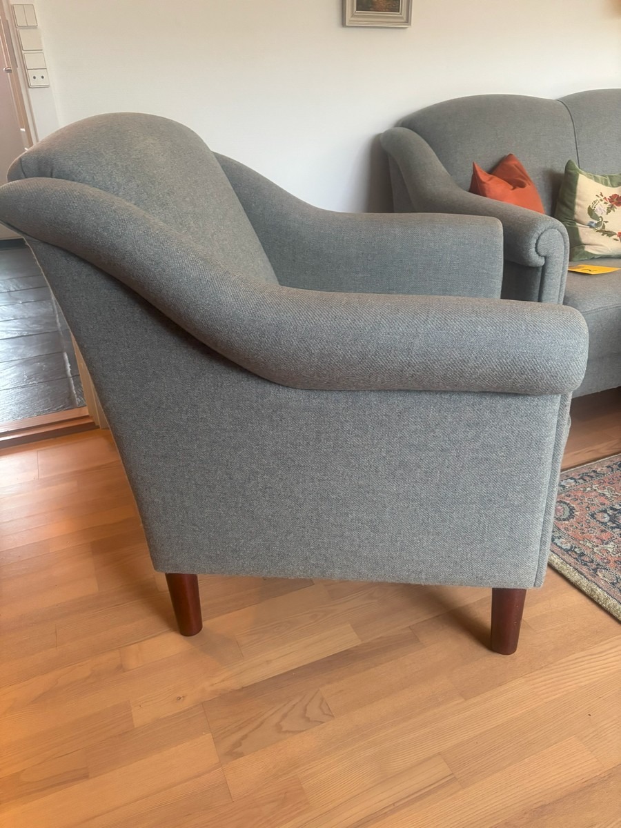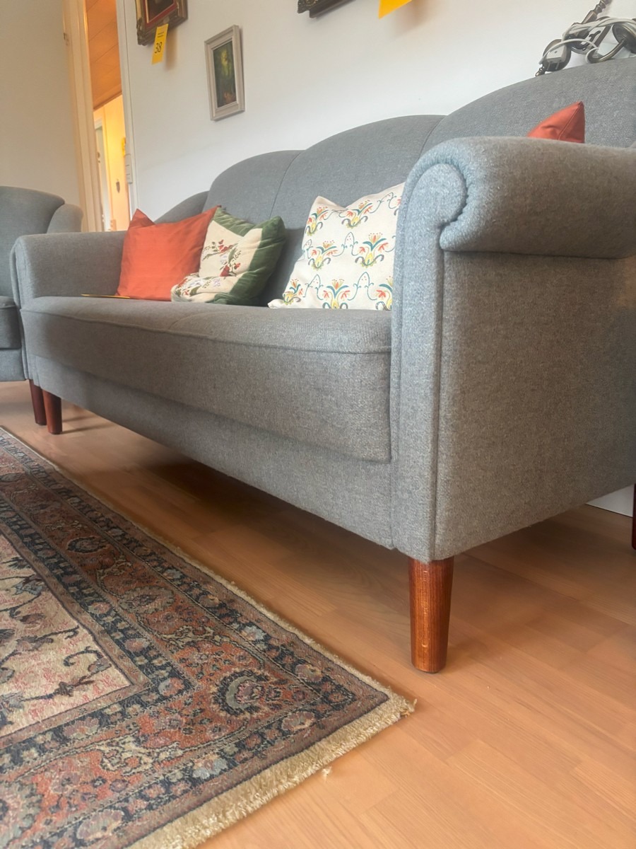 3 personers sofa samt lænestol. Monteret med grånistret uld. mørkbejdsede ben af bøg. H. 90, B. 185, D. 80 cm. Fremstår med lette brugsspor.