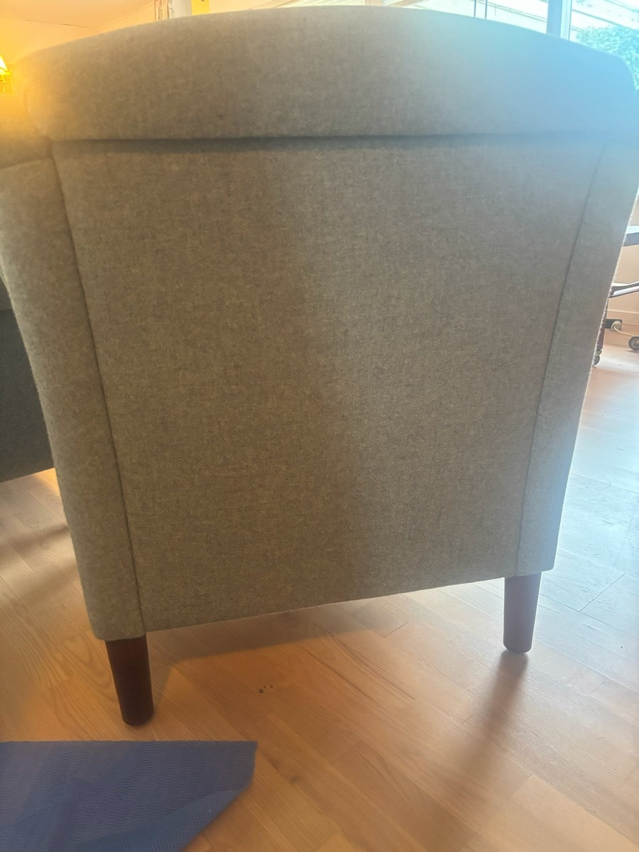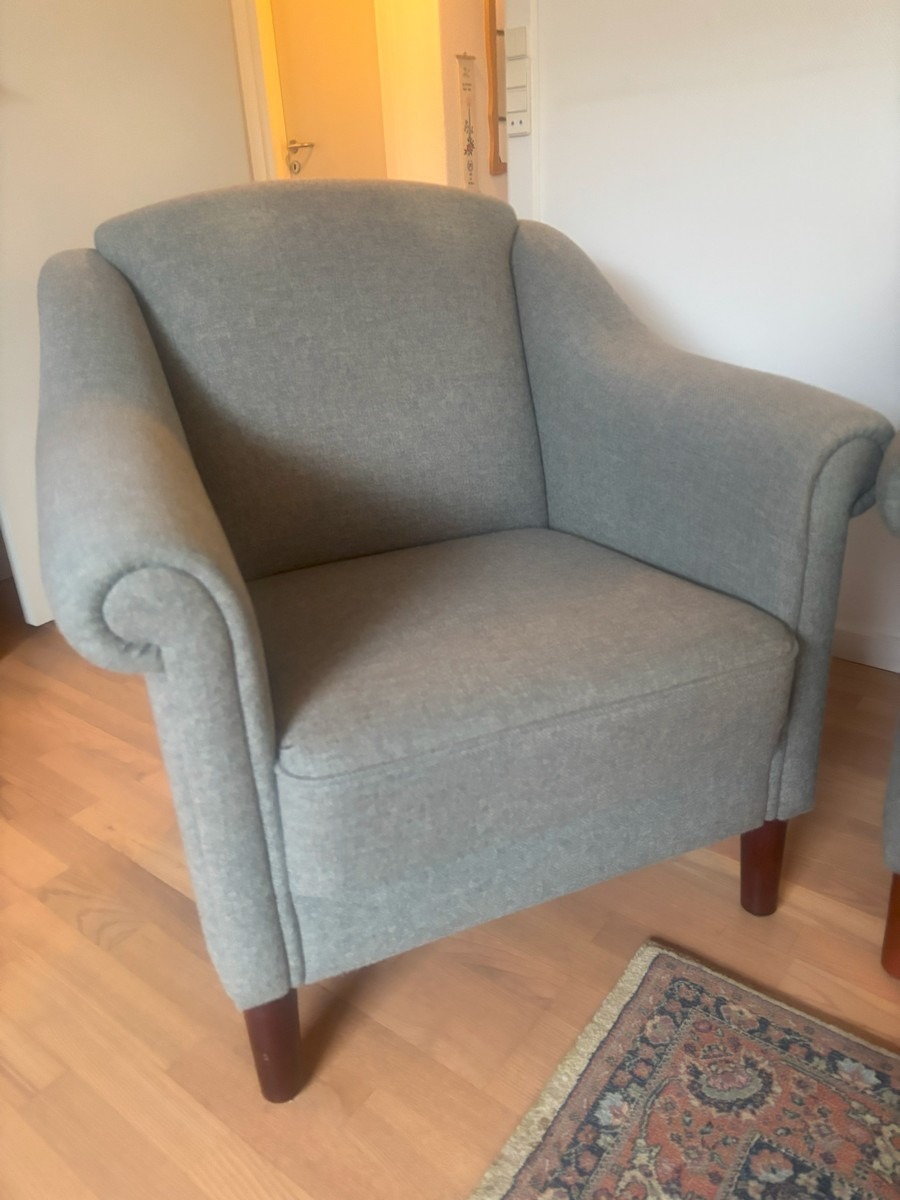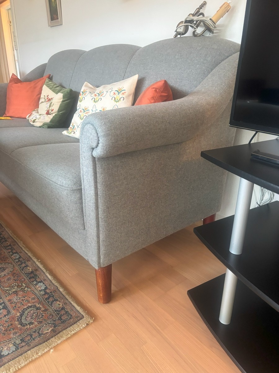 3 personers sofa samt lænestol. Monteret med grånistret uld. mørkbejdsede ben af bøg. H. 90, B. 185, D. 80 cm. Fremstår med lette brugsspor.