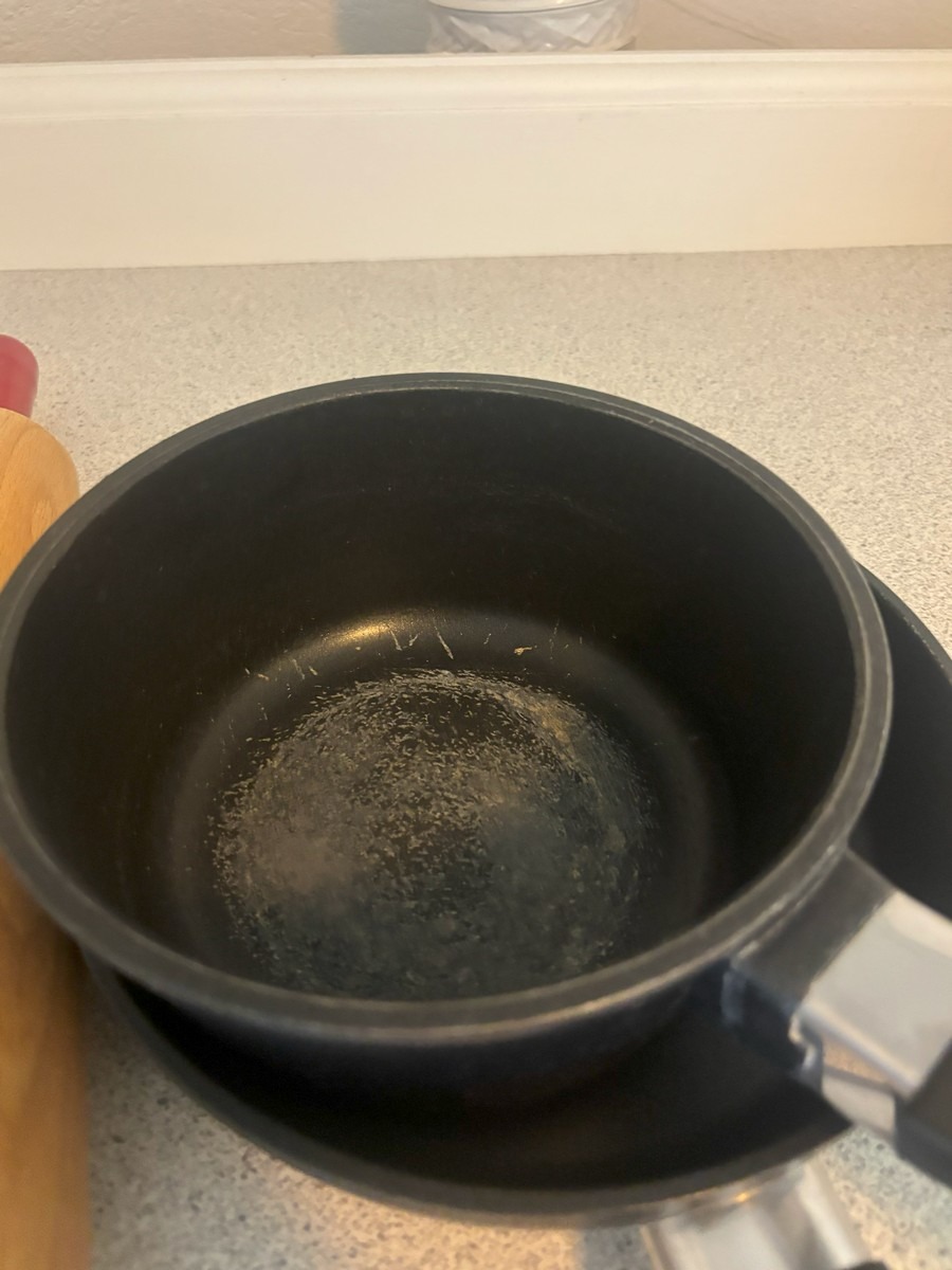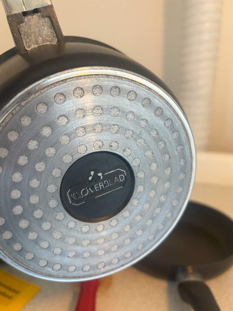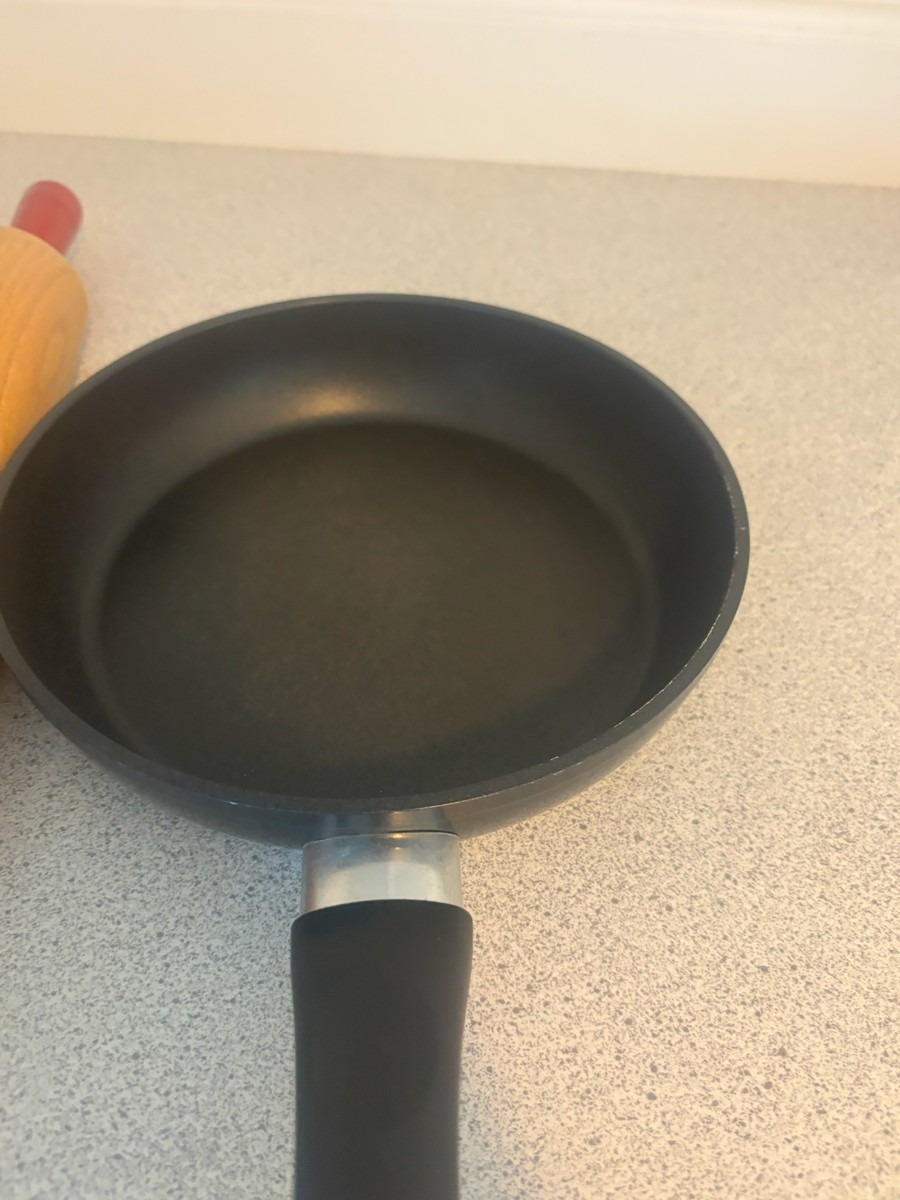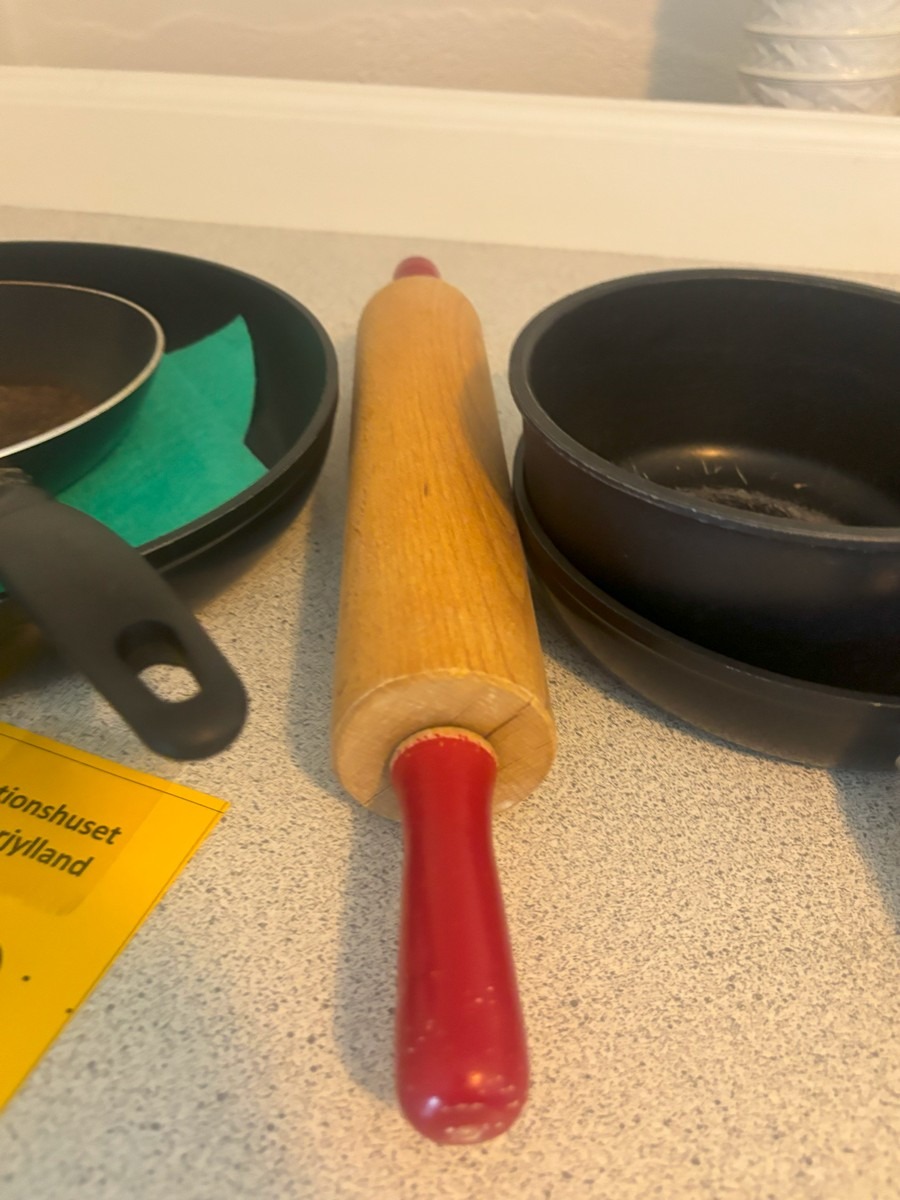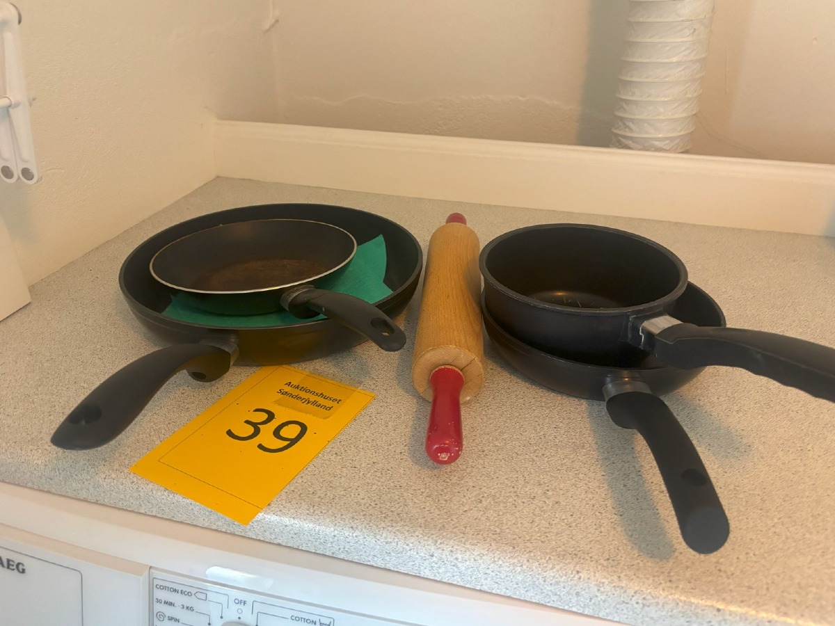 4 dele kogegrej. 3 pander, Ø. for største. 29 cm. Samt ældre kagerulle.