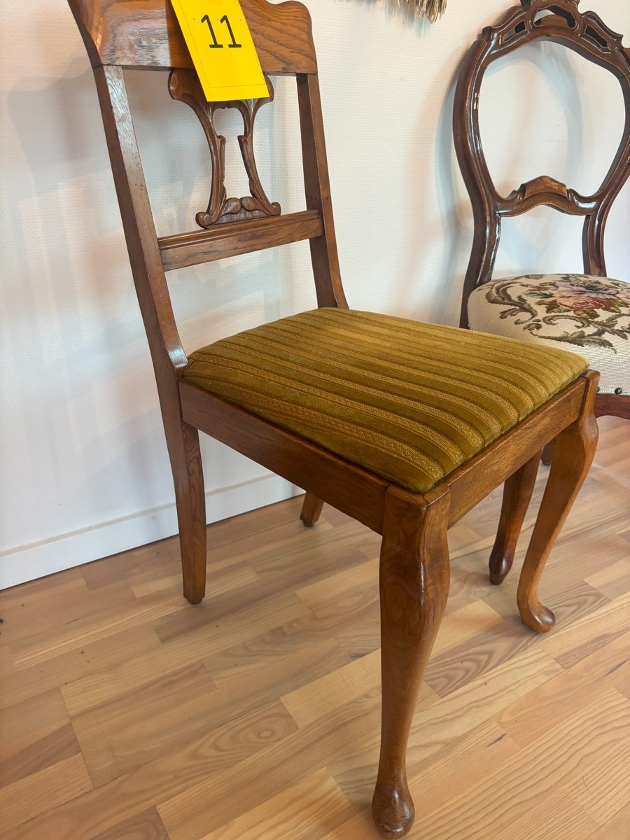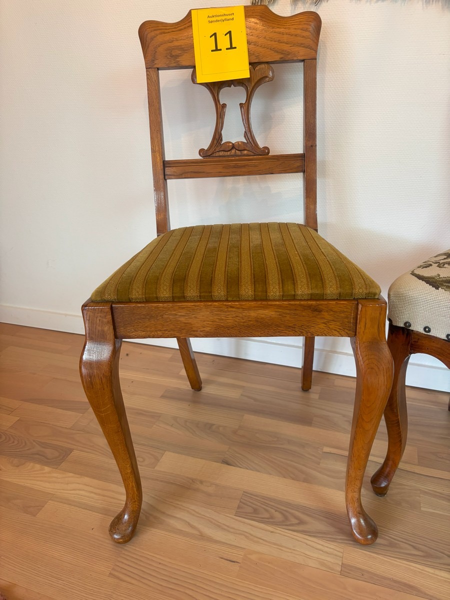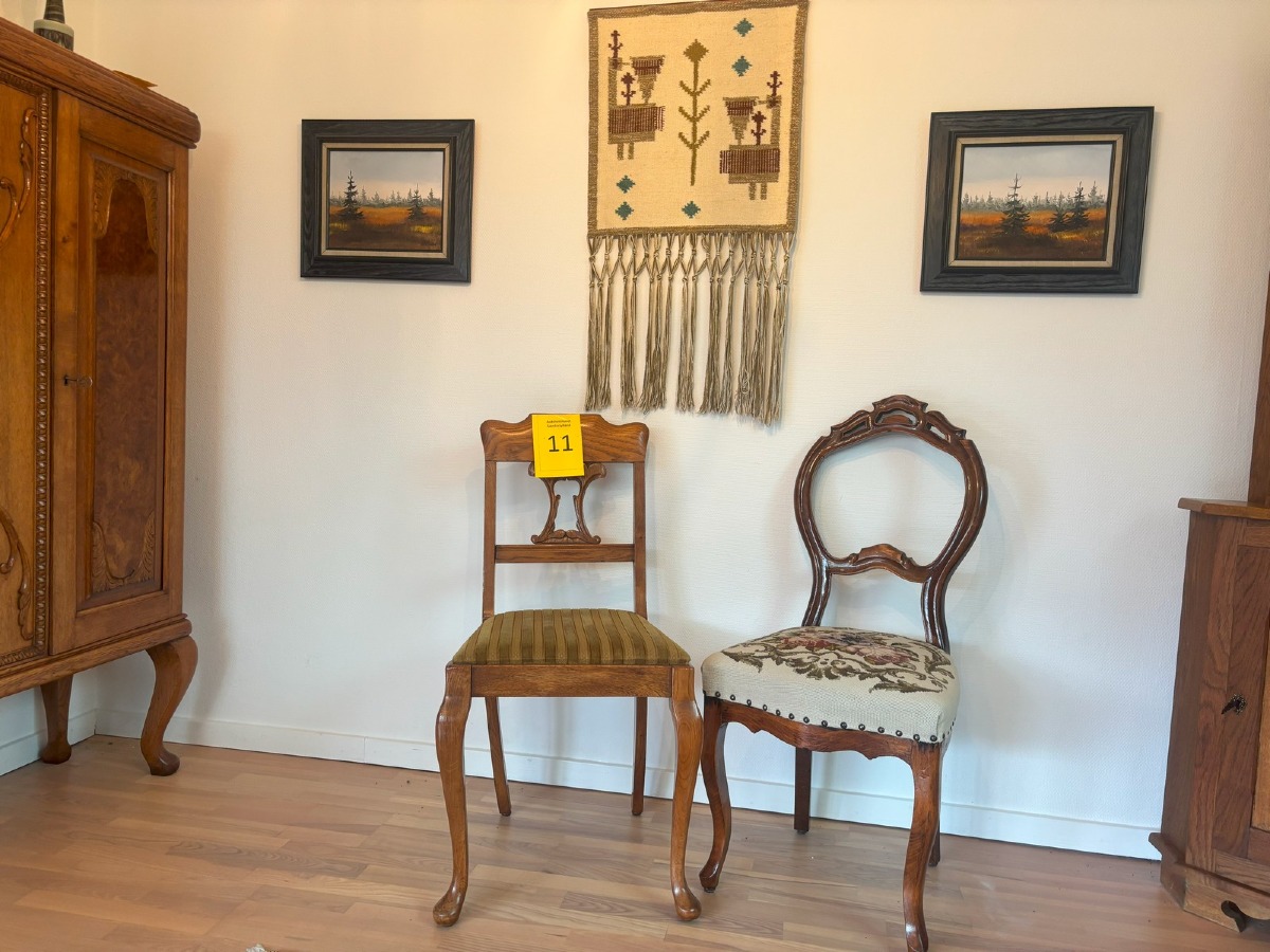 Blandet lot med to spisebordsstole. Hhv. eg og mahogni. bo billeder med skovmotiv samt mindre vægtæppe.
