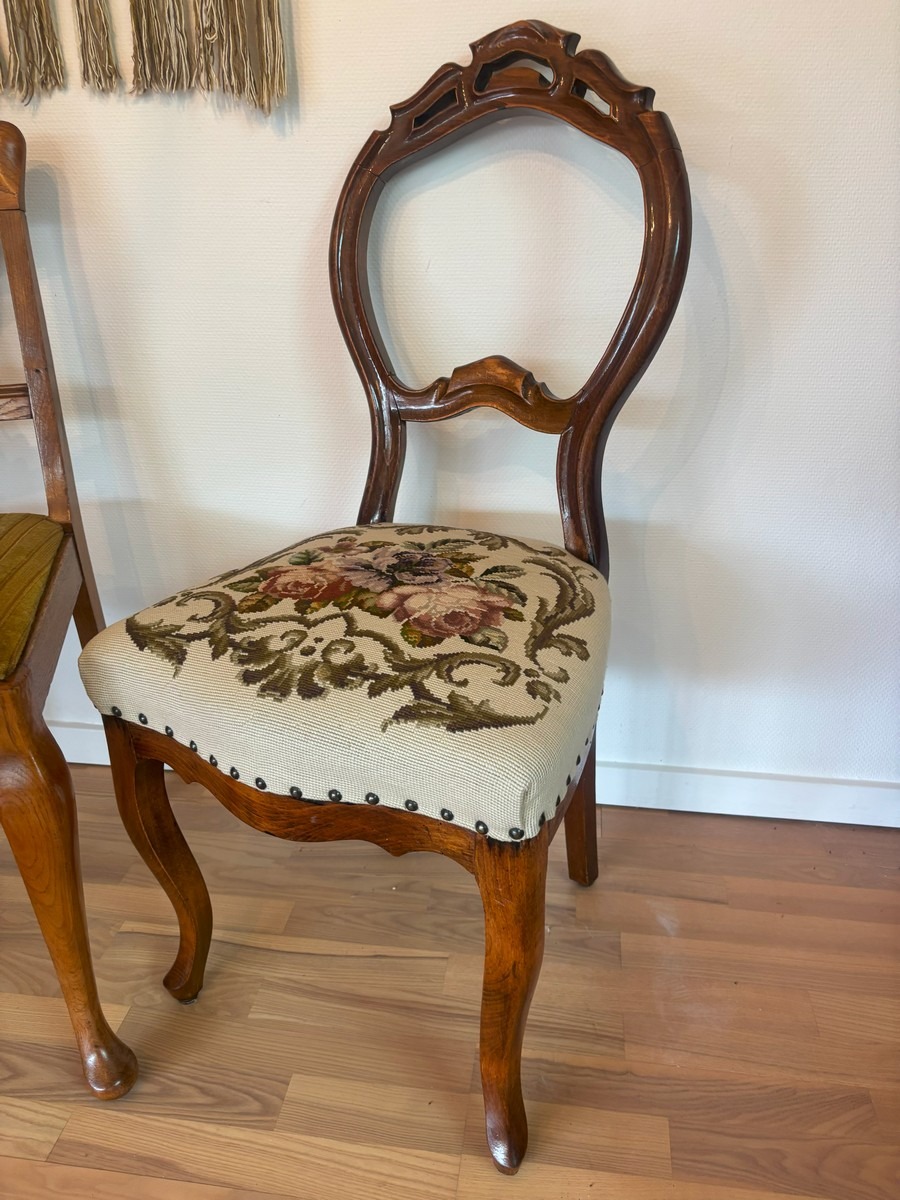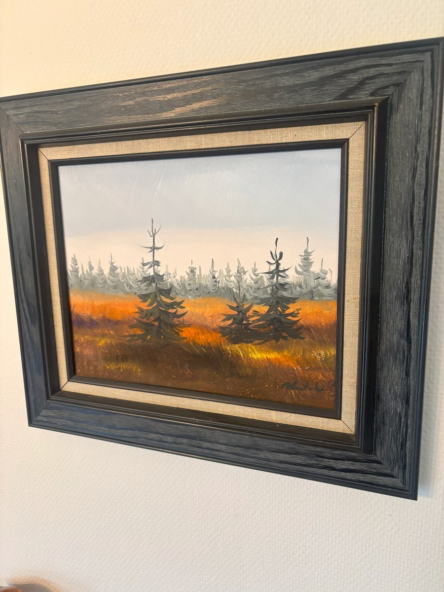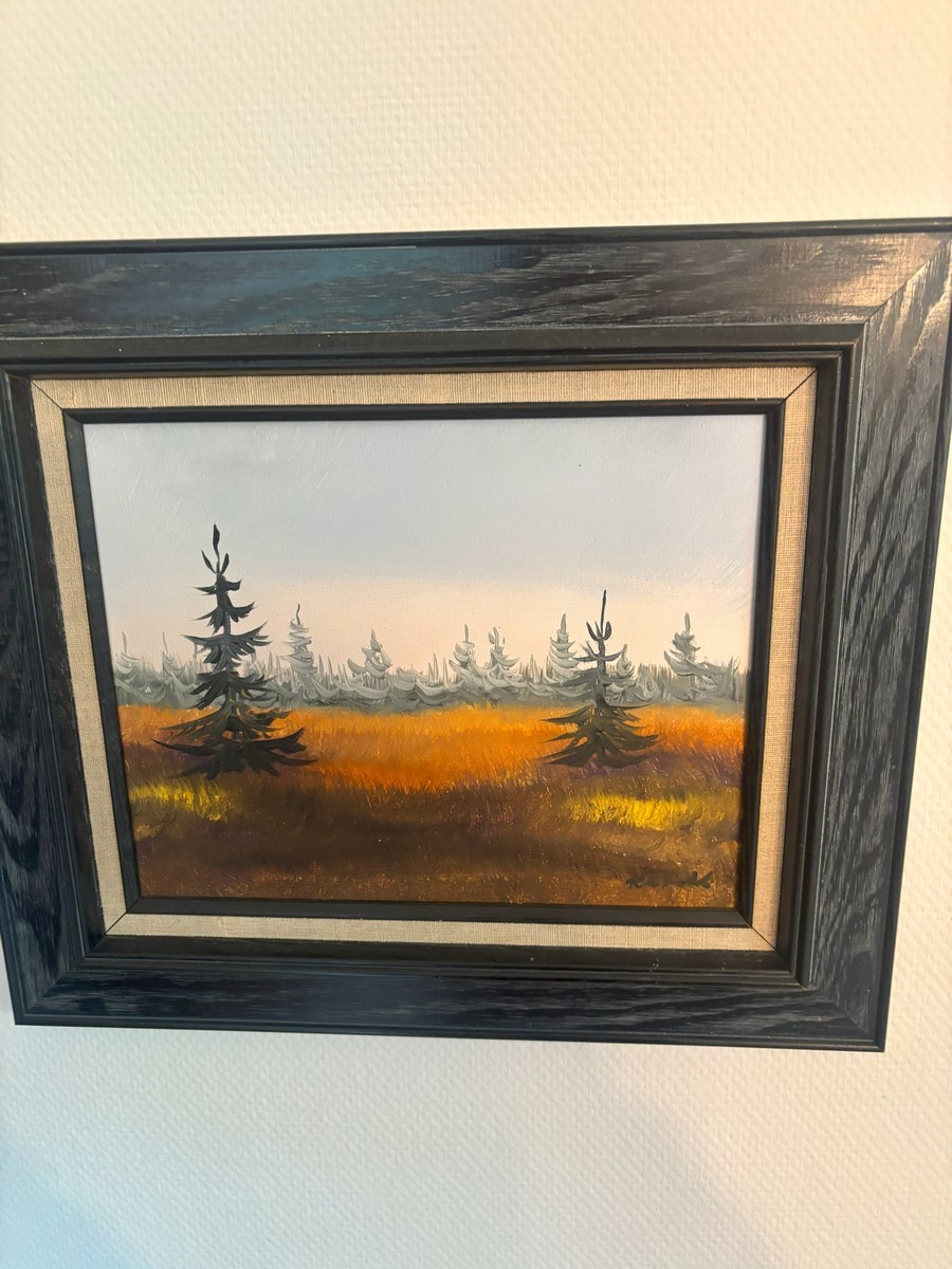 Blandet lot med to spisebordsstole. Hhv. eg og mahogni. bo billeder med skovmotiv samt mindre vægtæppe.