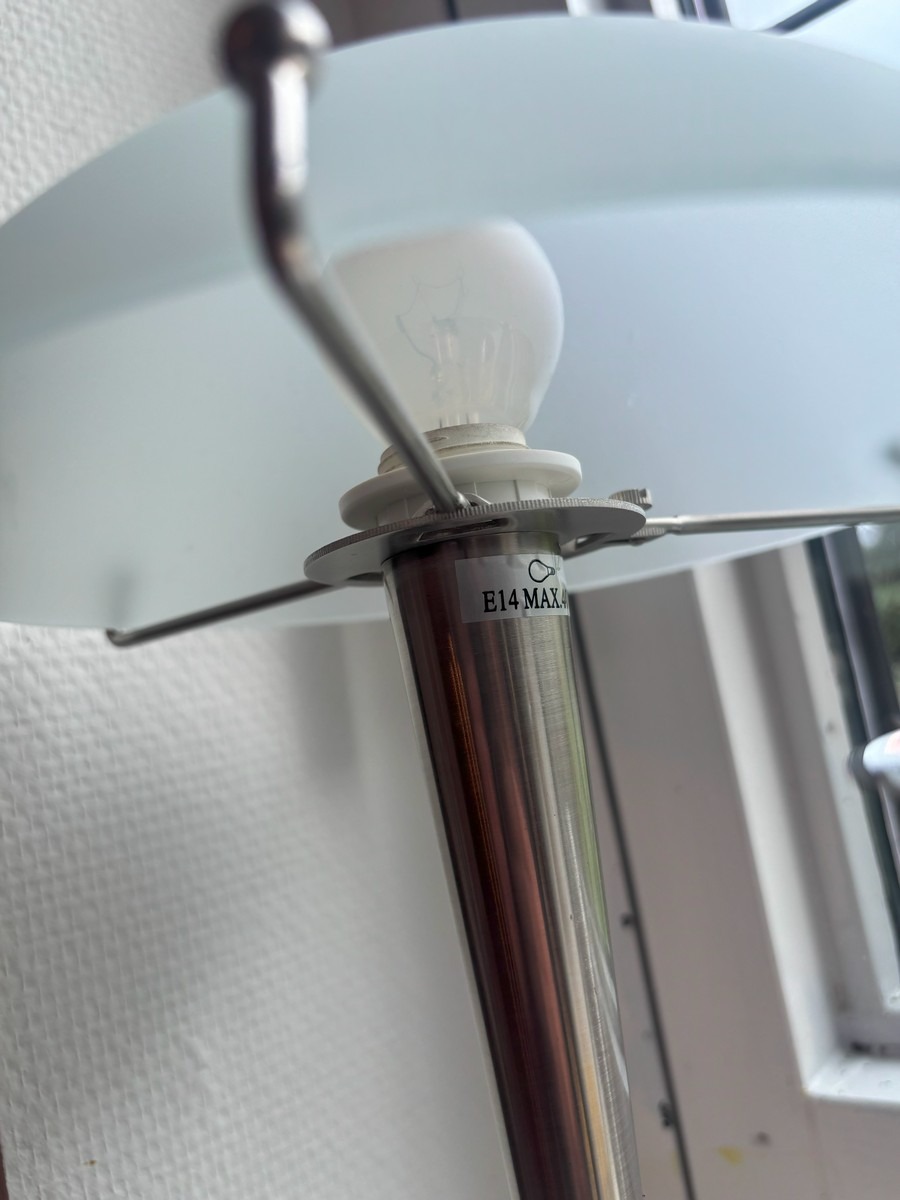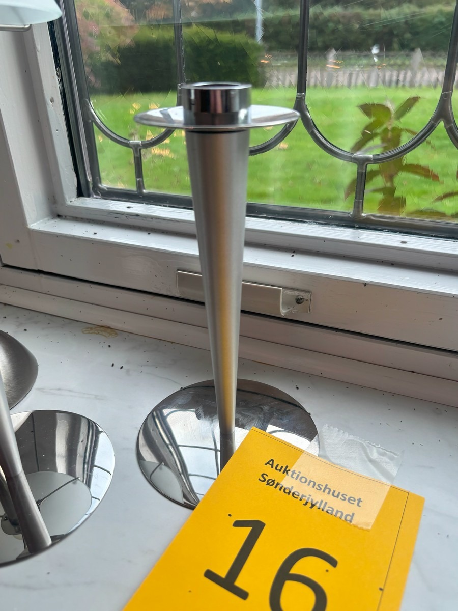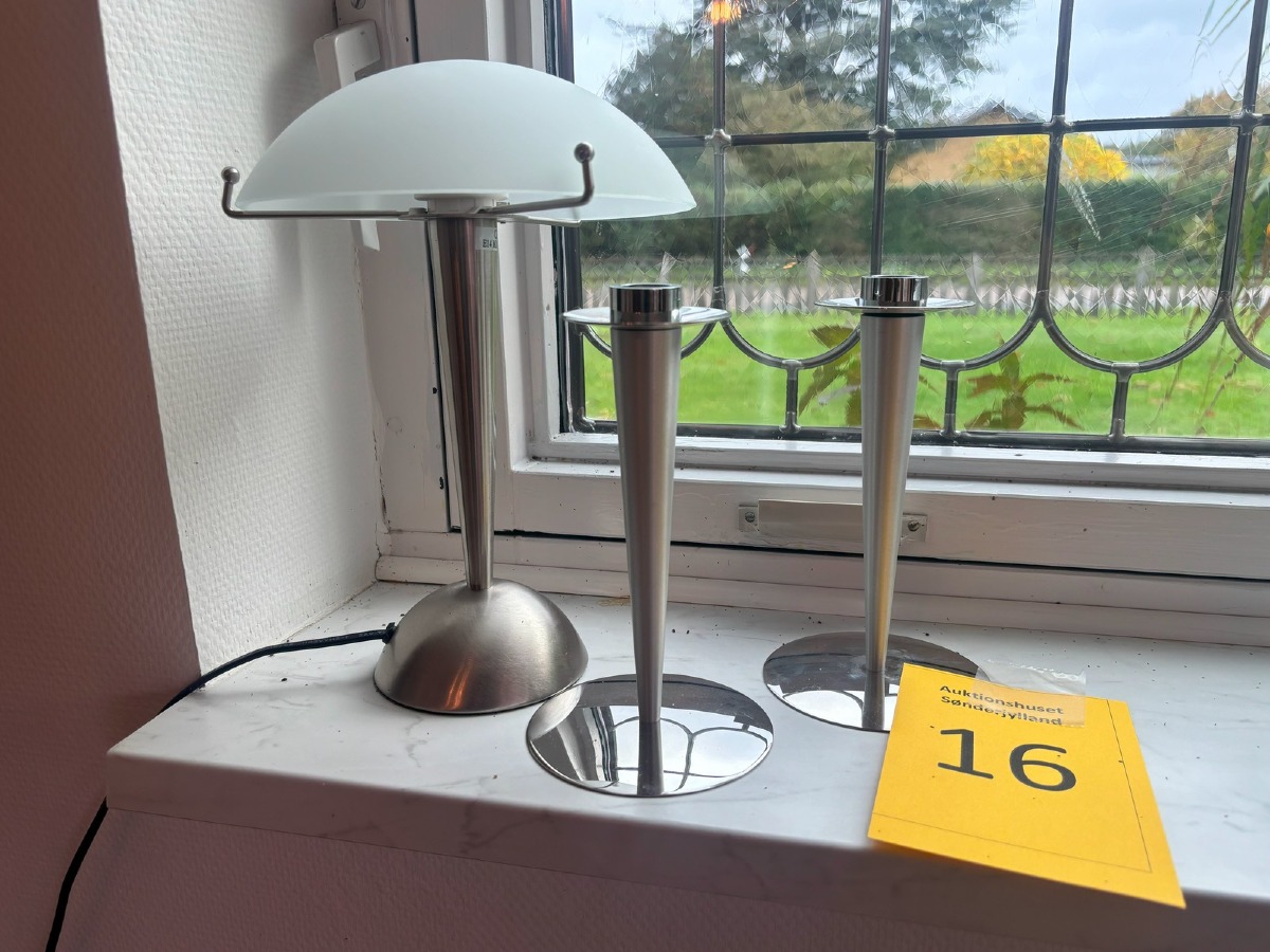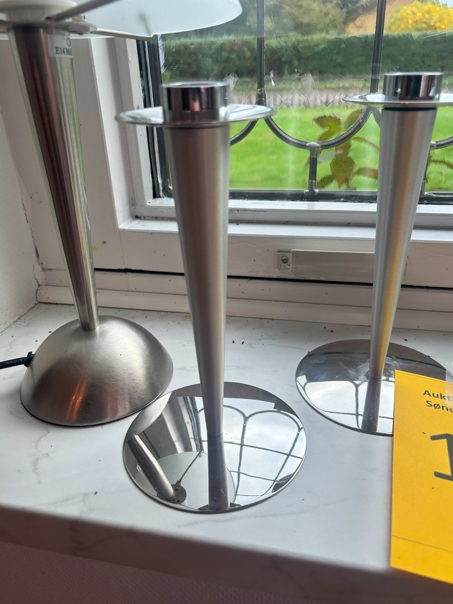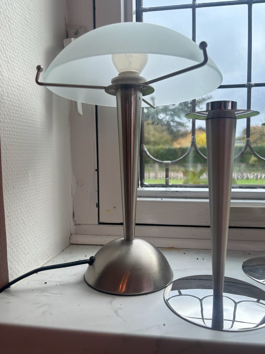 Bordlampe samt par stager. Alle del i børstet og poleret stål. Bordlampe med touch-funktion.