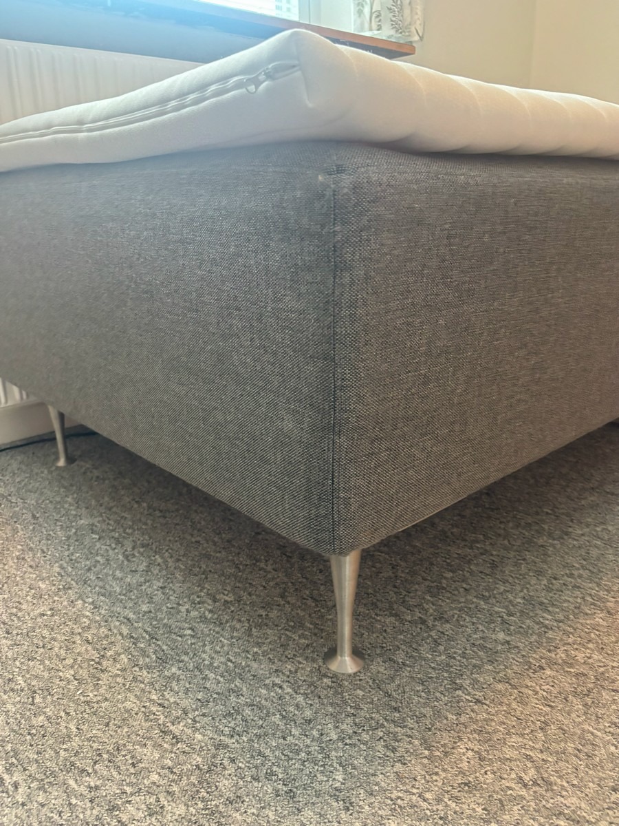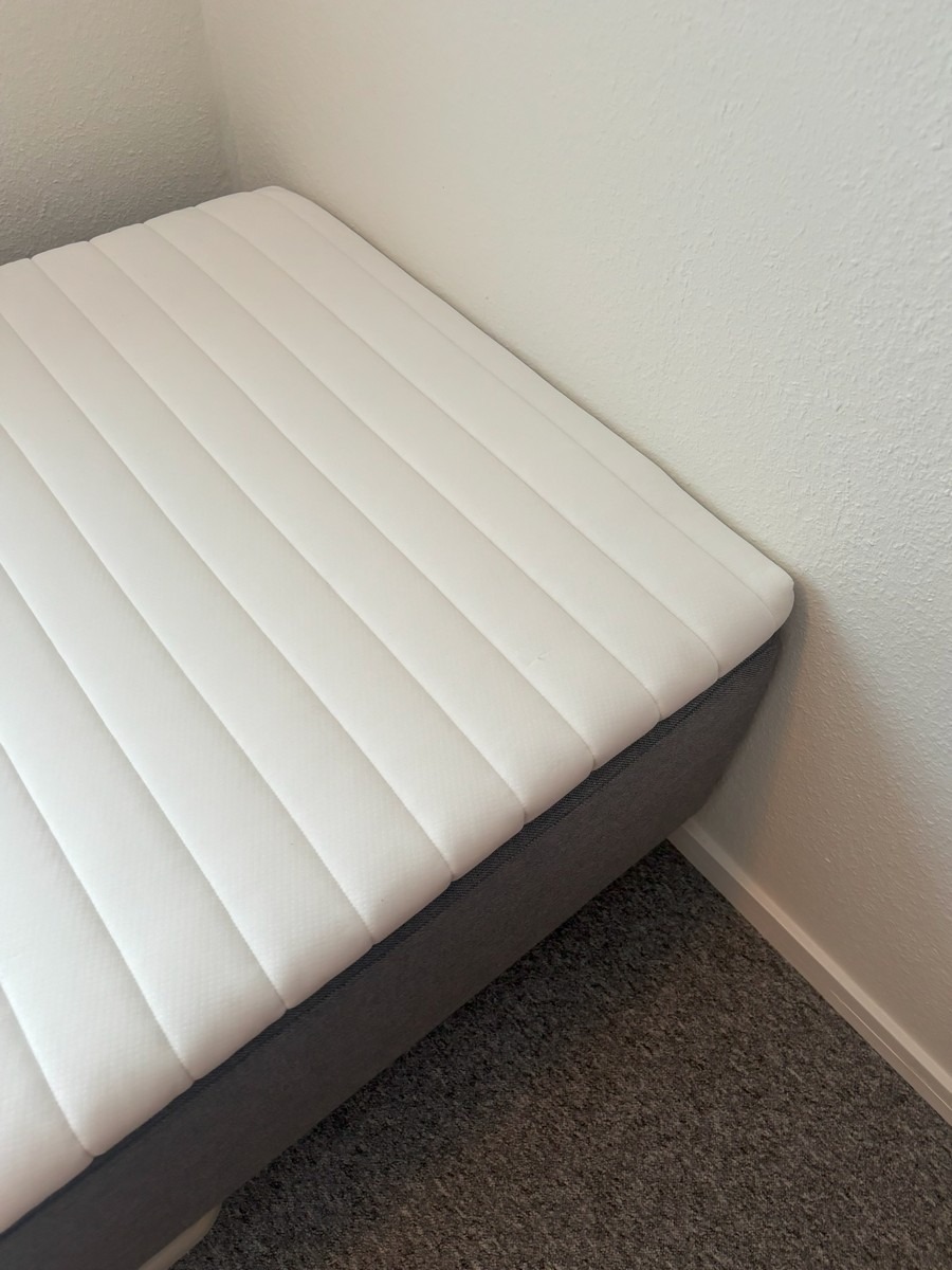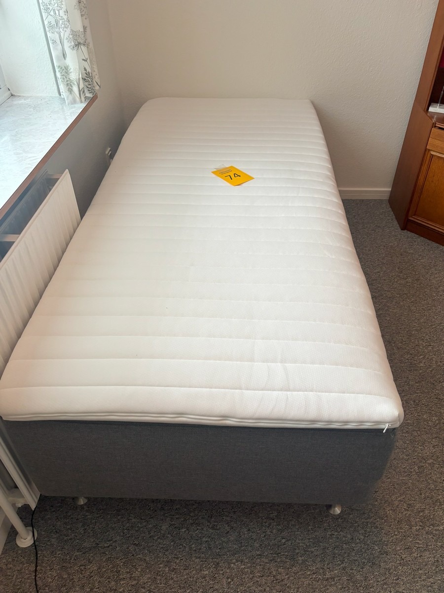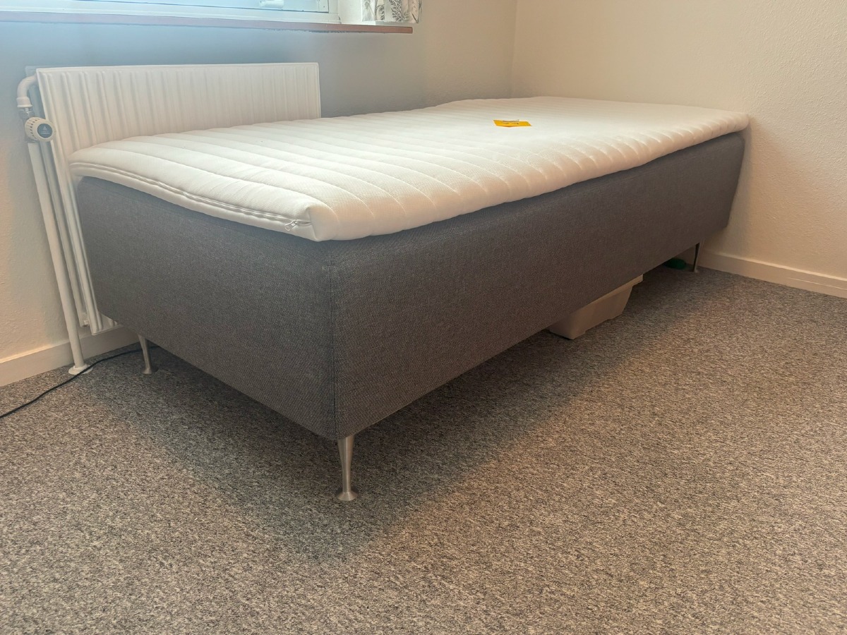 Boxmadras med topmadras. 200 x 90 cm. Begge dele fremstår pæne.