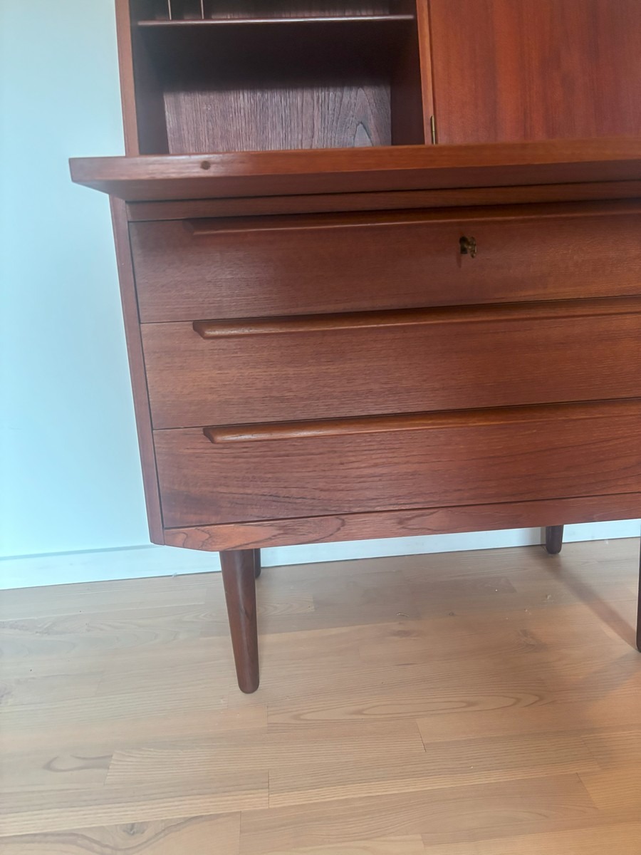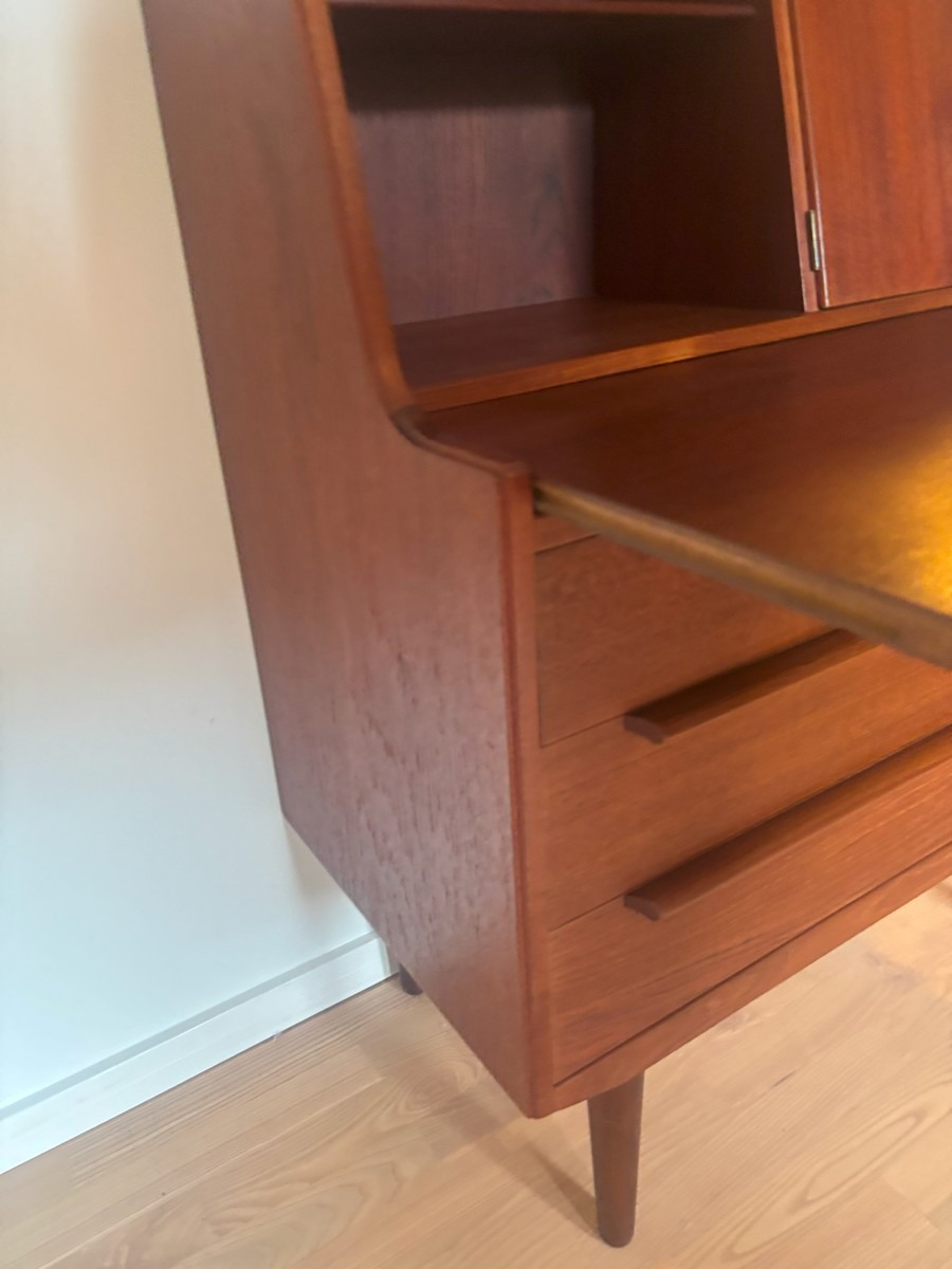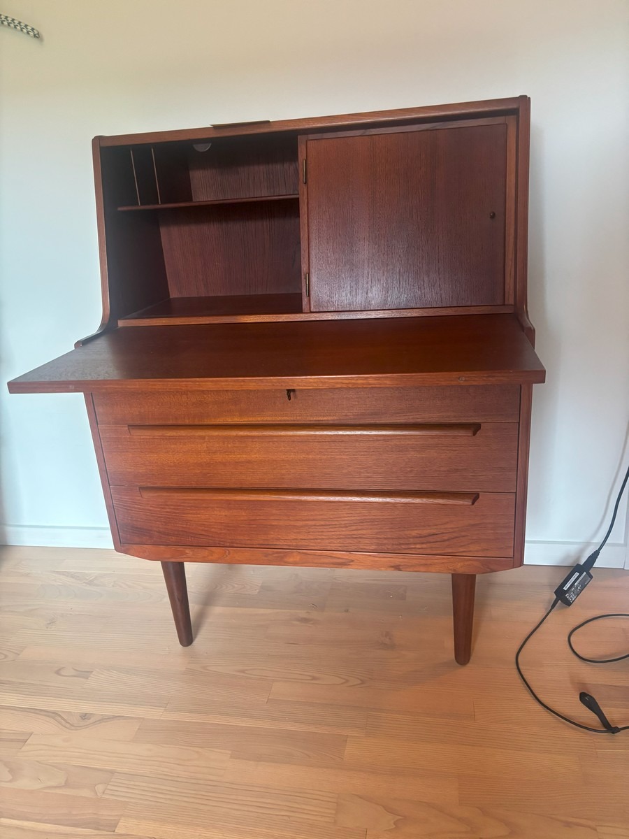 Dansk møbelproducent. Chatol af teak. Øverst vendbar låge med spejl på ene side. Skriveplade med udtræk samt 3 skuffer. H. 110, B.  83, D. 44/68 cm.