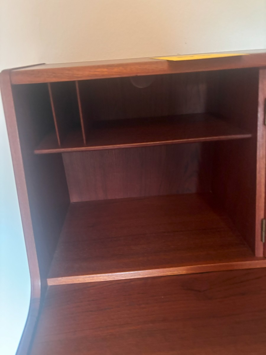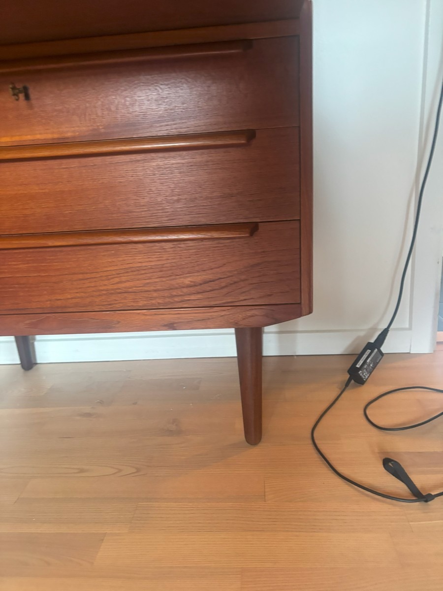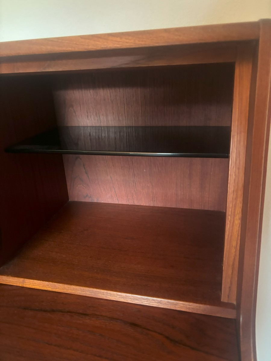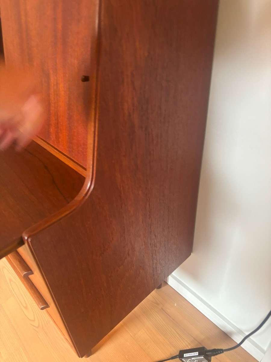 Dansk møbelproducent. Chatol af teak. Øverst vendbar låge med spejl på ene side. Skriveplade med udtræk samt 3 skuffer. H. 110, B.  83, D. 44/68 cm.