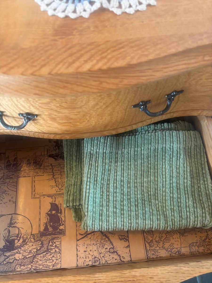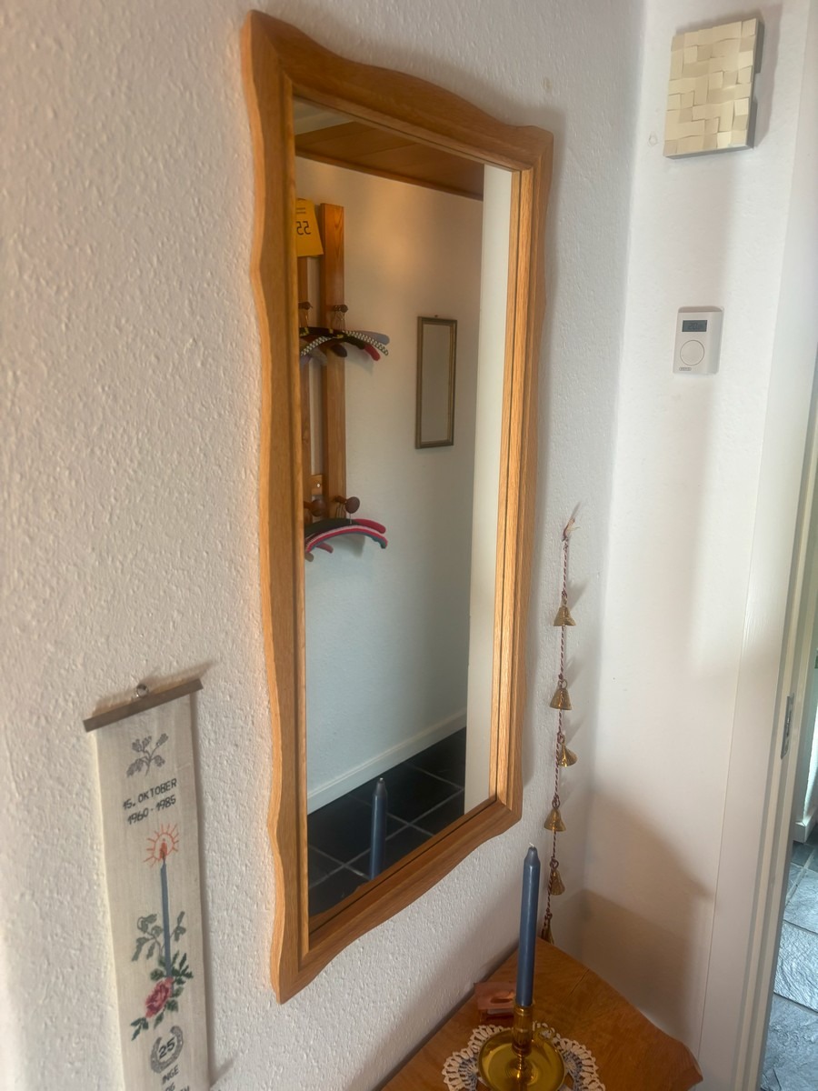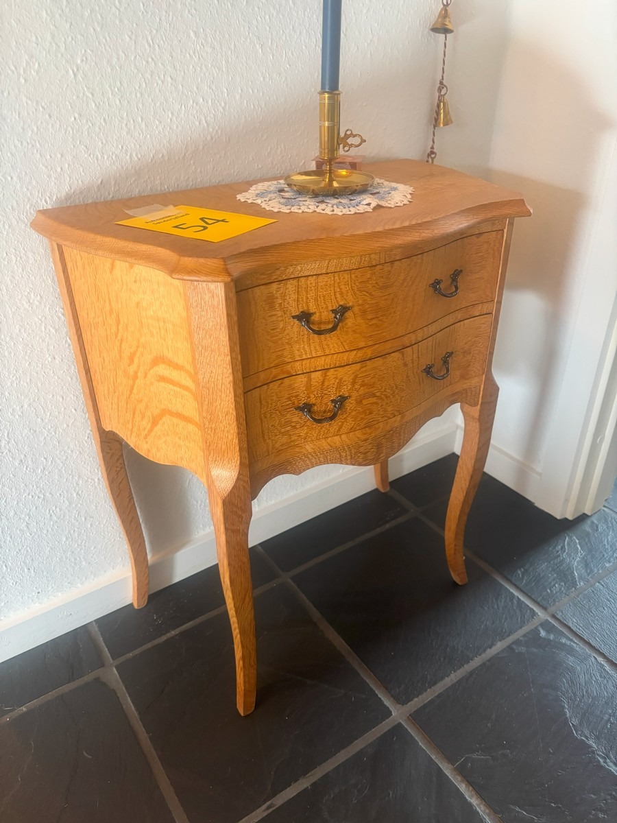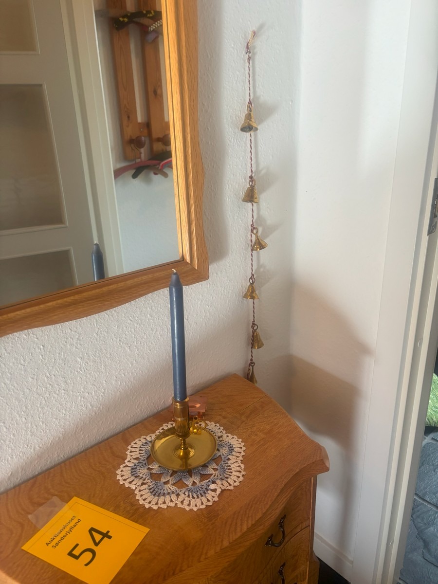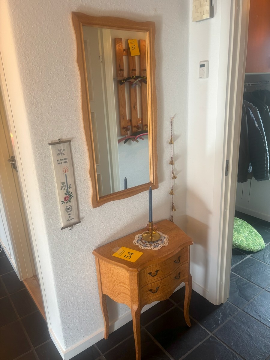 Entremøbel af syret eg, bestående af spejl og lille kommode med to skuffer. Klokkestreng, messingklokker og ting på og i kommode medfølger. Spejl 94 x 48 cm. Kommode: H. 65, B. 60. D. 33 cm.