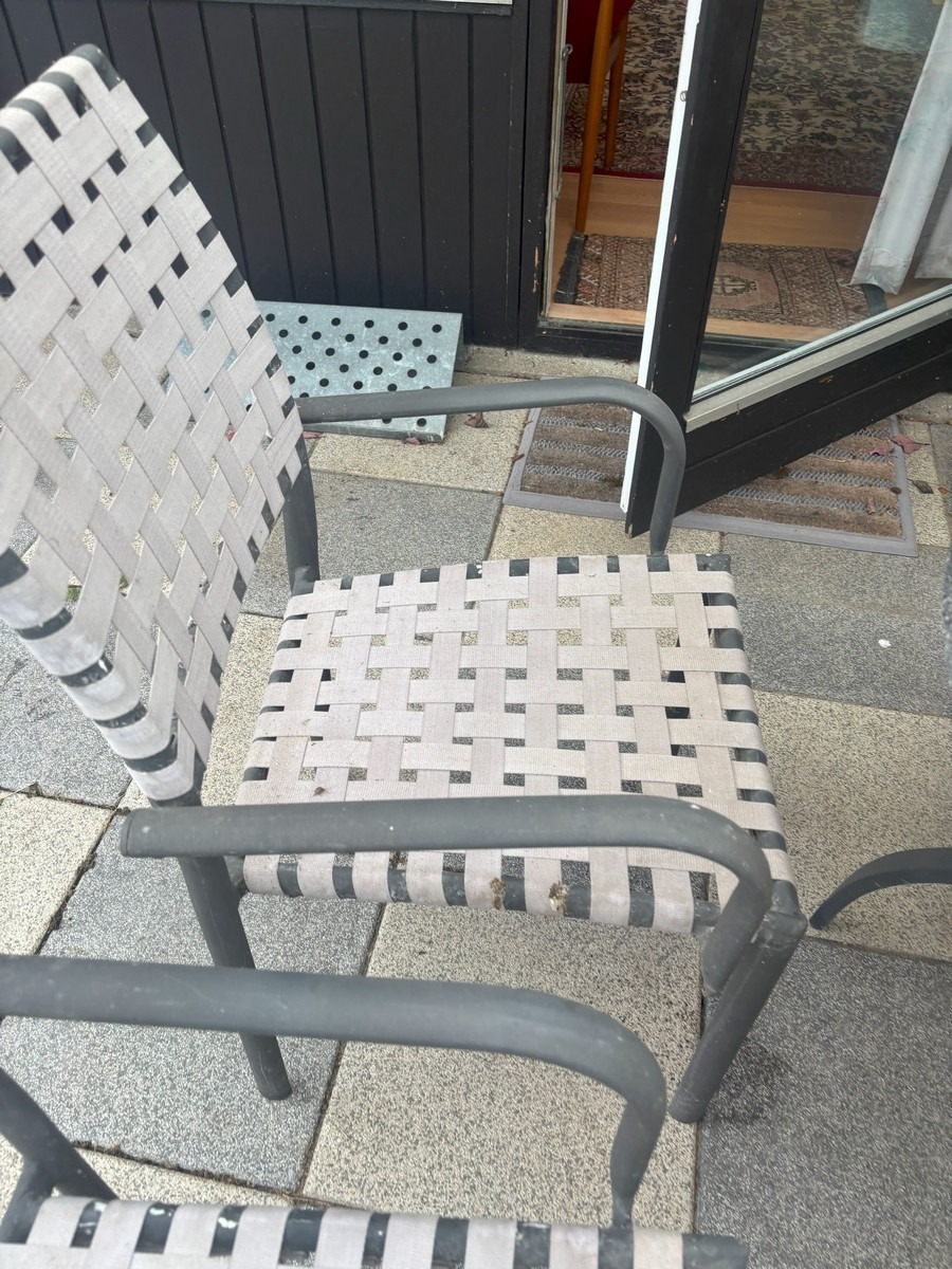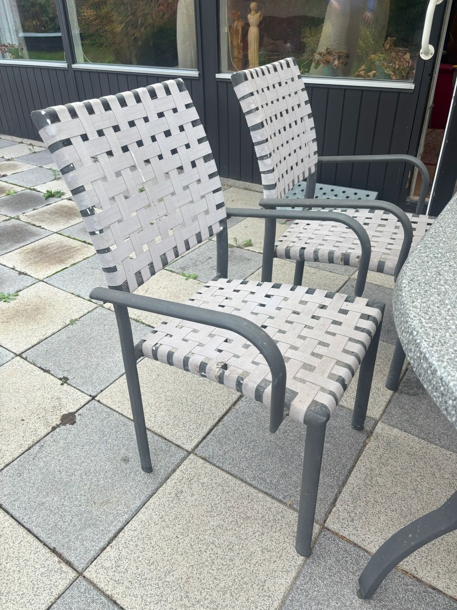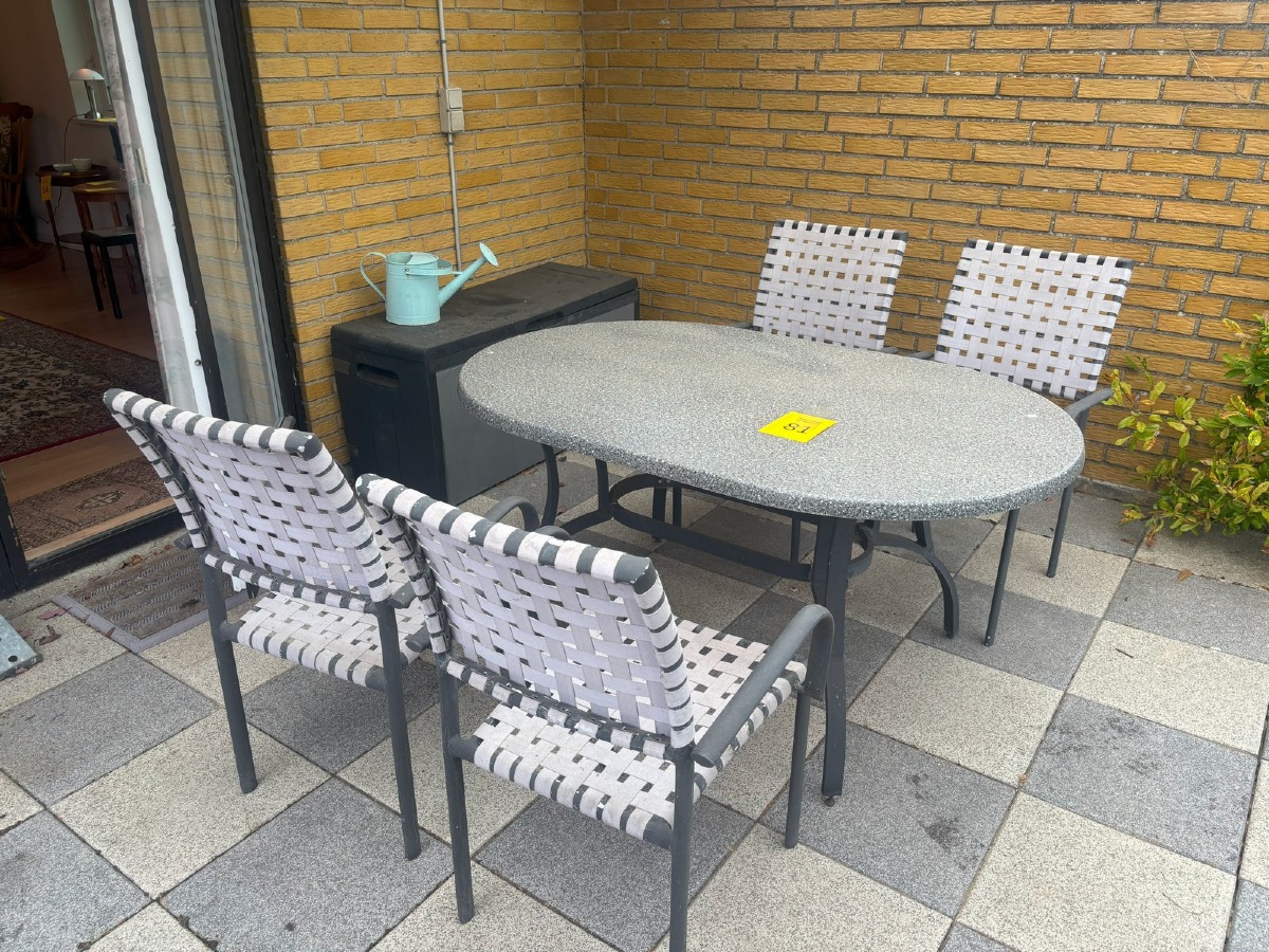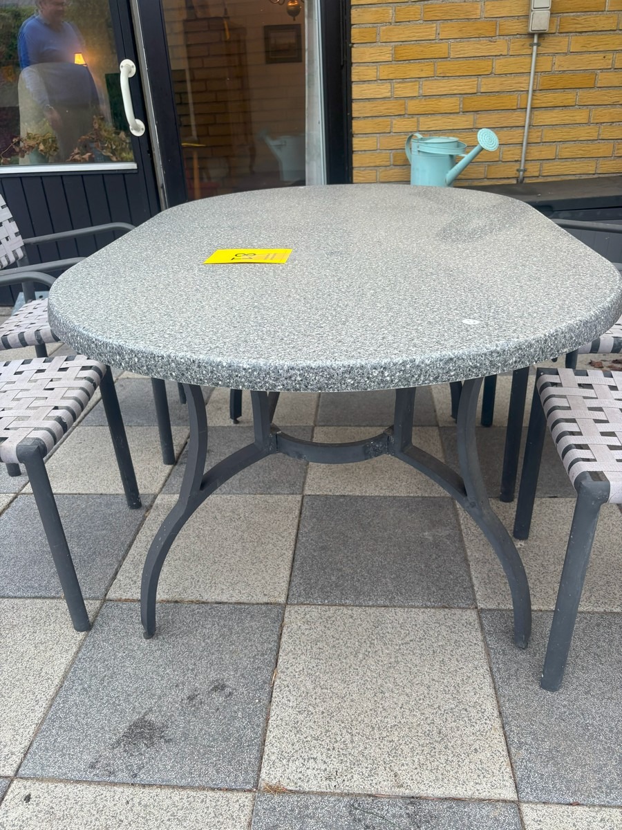 Havemøbler: Bord med 4 stole samt hyndeboks med indhold. Fremstår med spor efter vejr og vind. Bord: H. 72, B. 93, D. 140 cm.