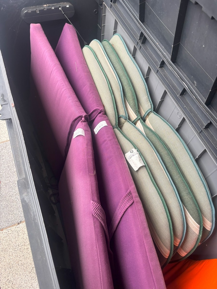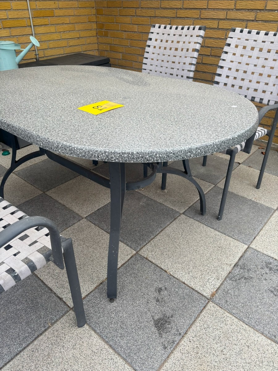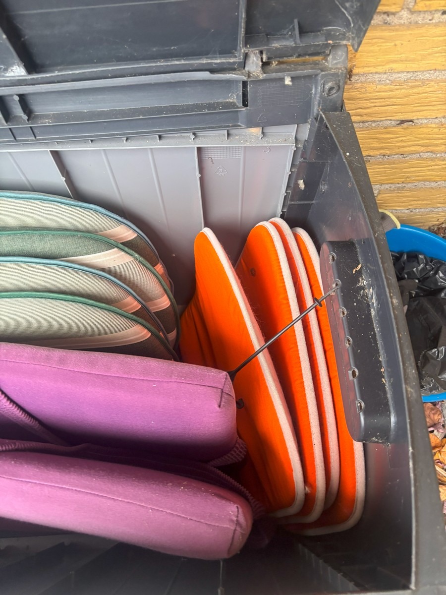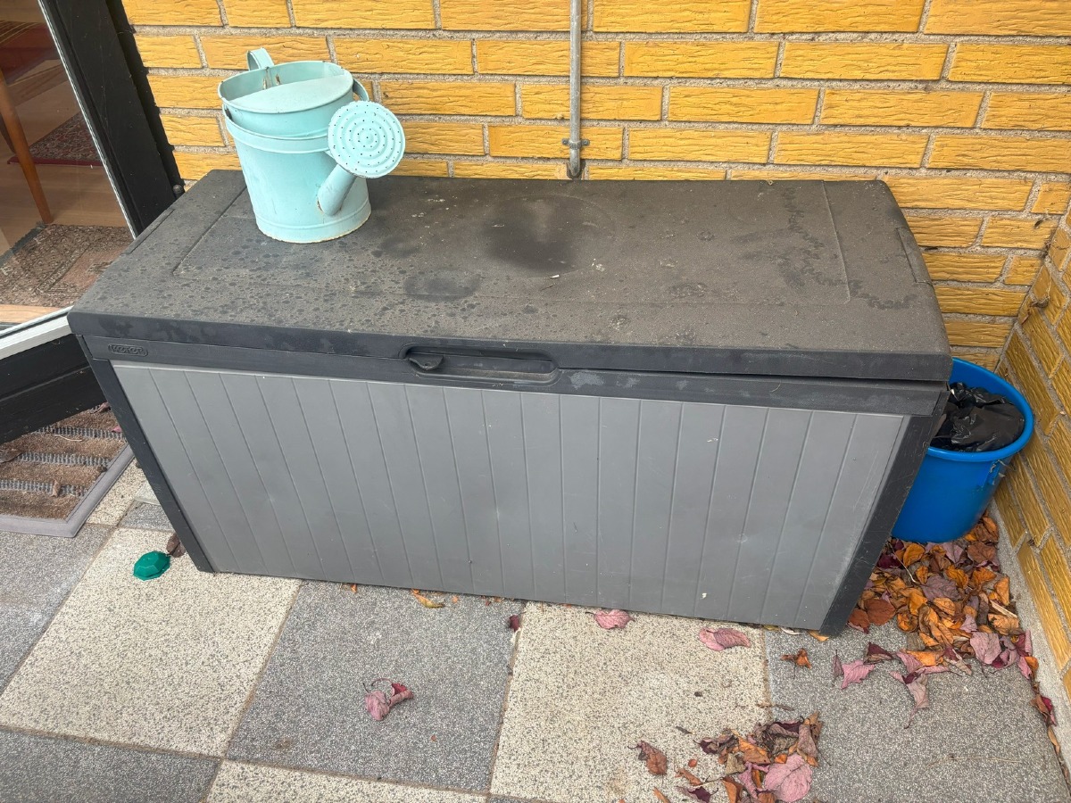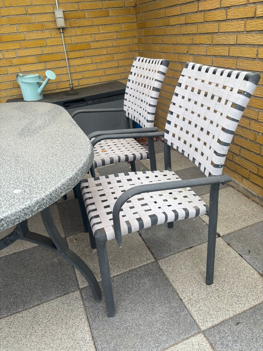 Havemøbler: Bord med 4 stole samt hyndeboks med indhold. Fremstår med spor efter vejr og vind. Bord: H. 72, B. 93, D. 140 cm.
