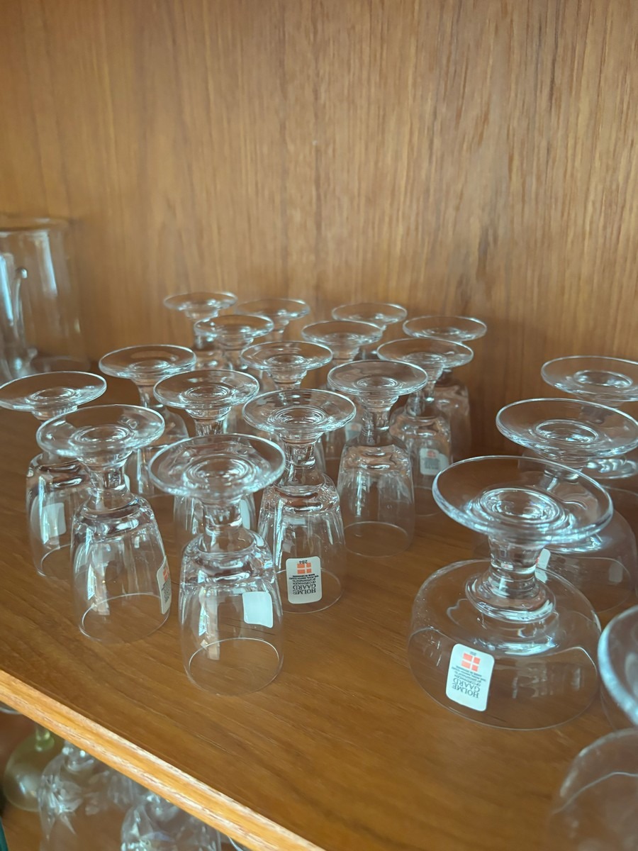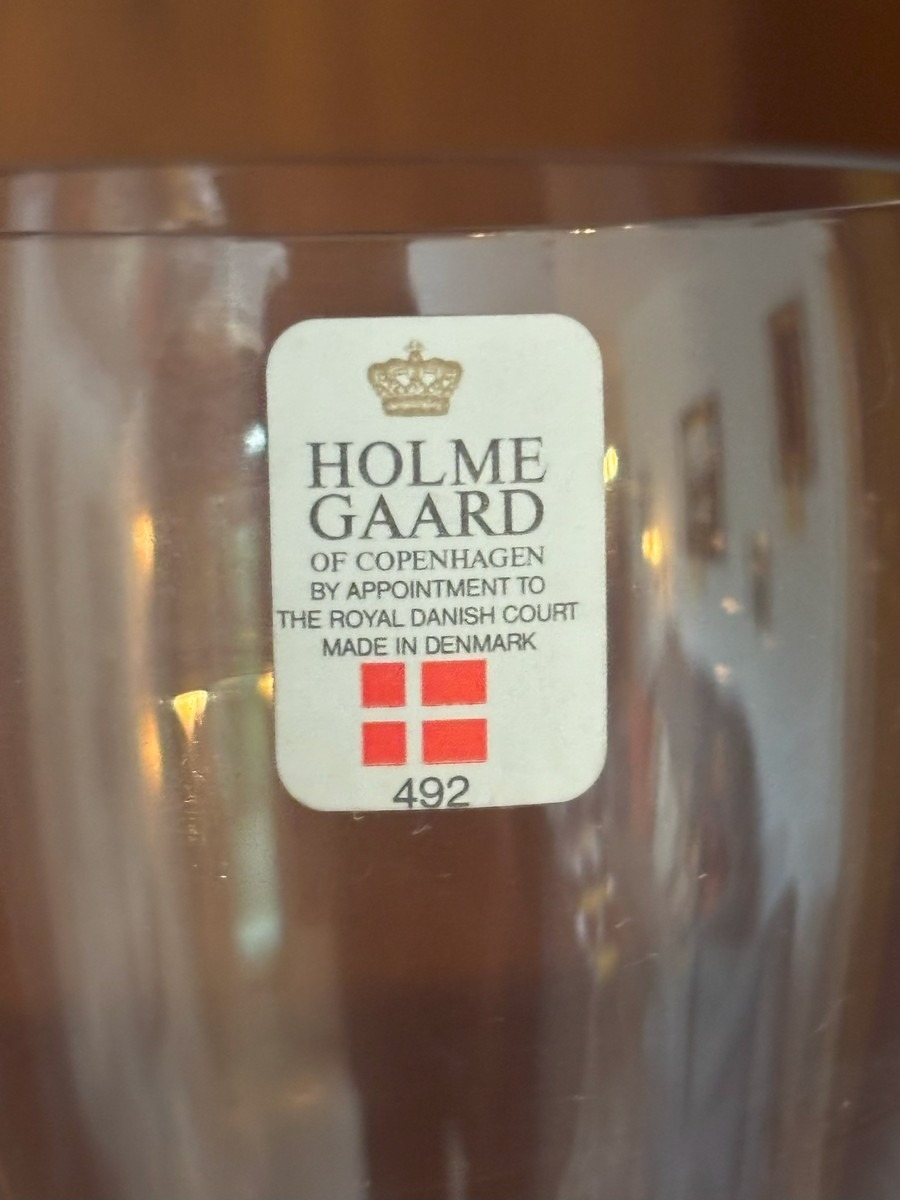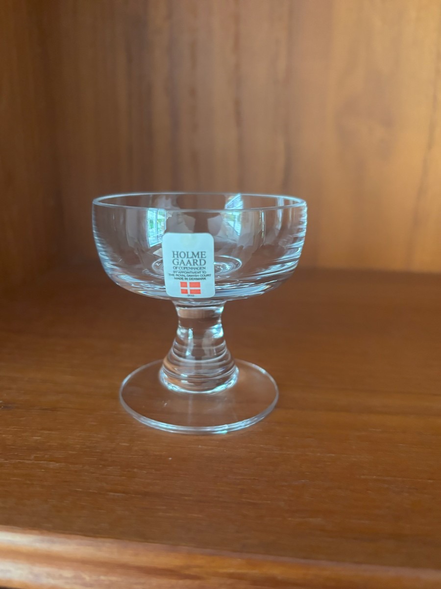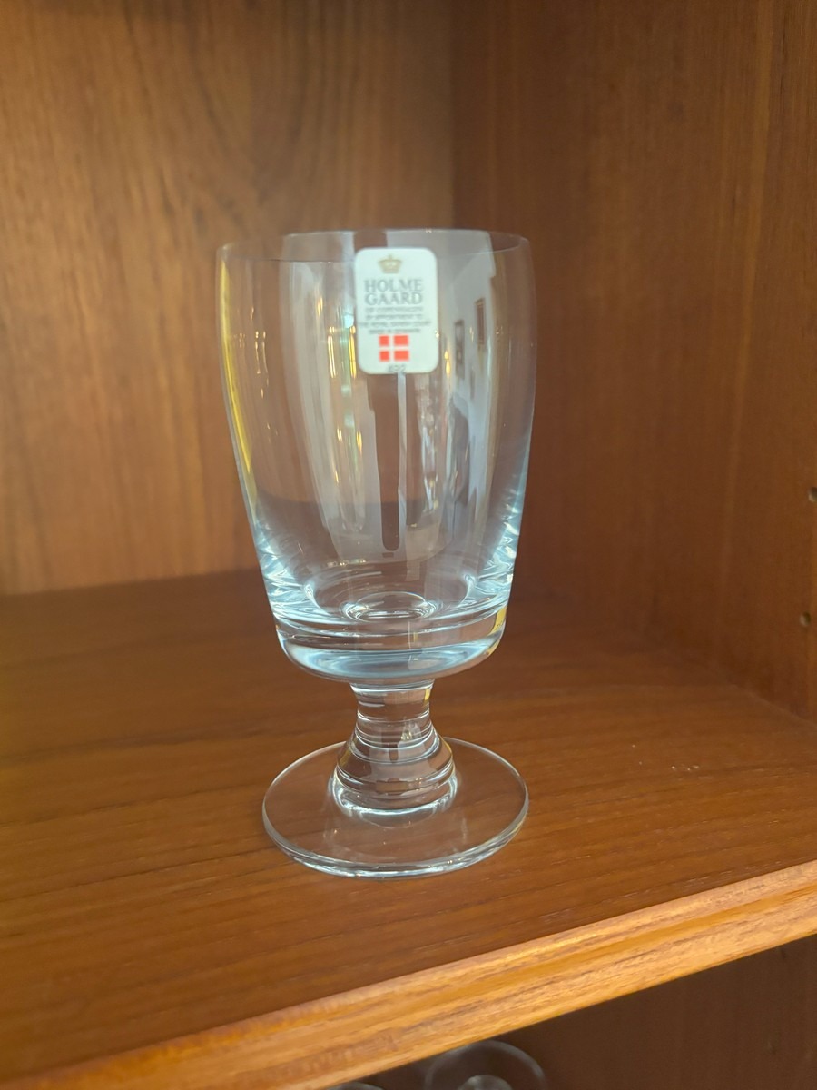 Holmegaard Almue glas. Bl. a. ældres sjusglas med logo. I alt ca. 70 glas samt andet bartilbehør.