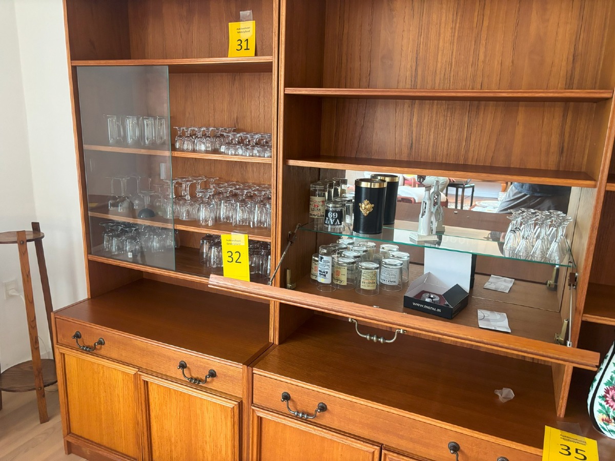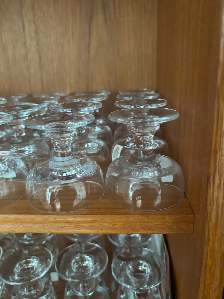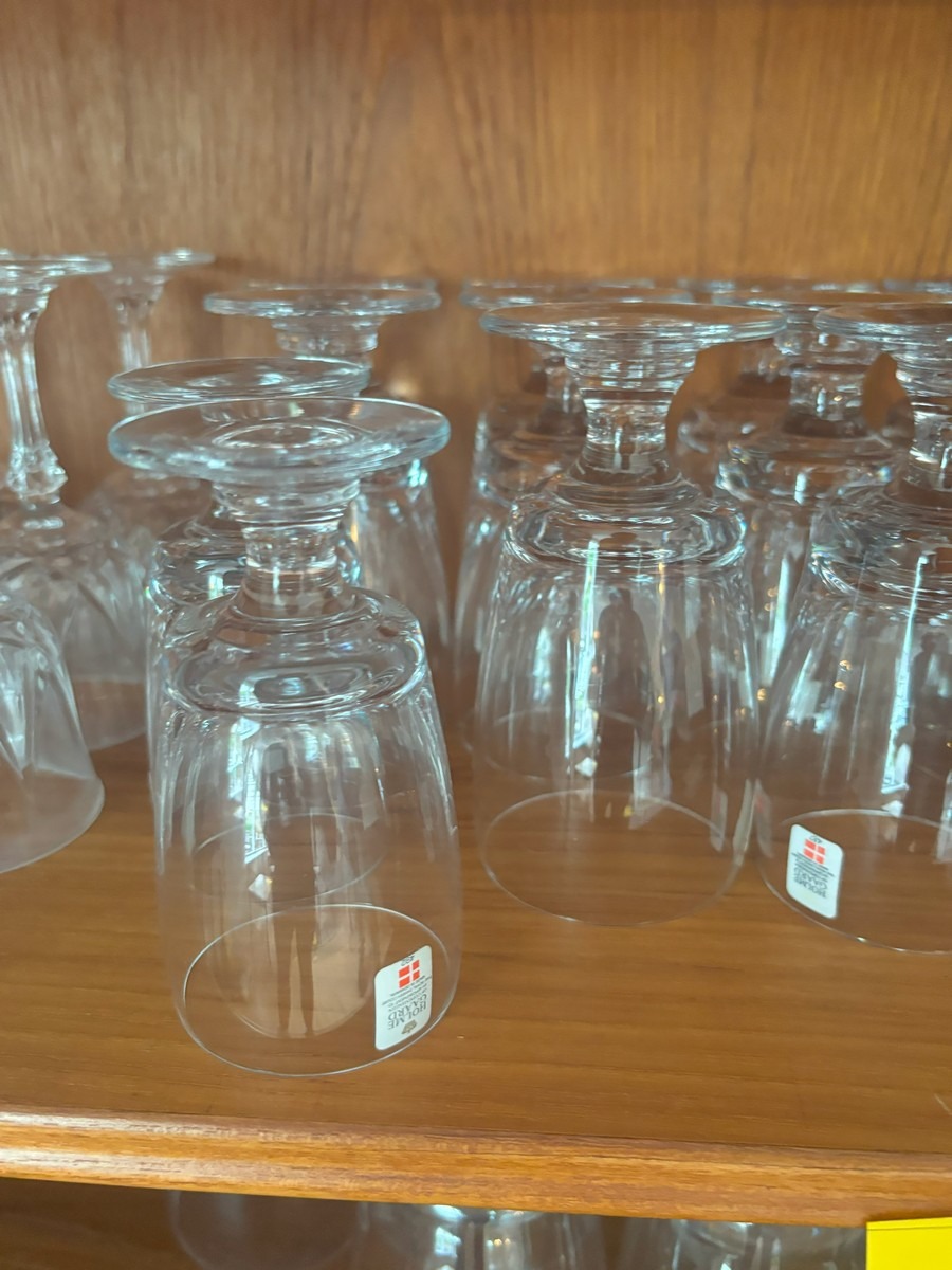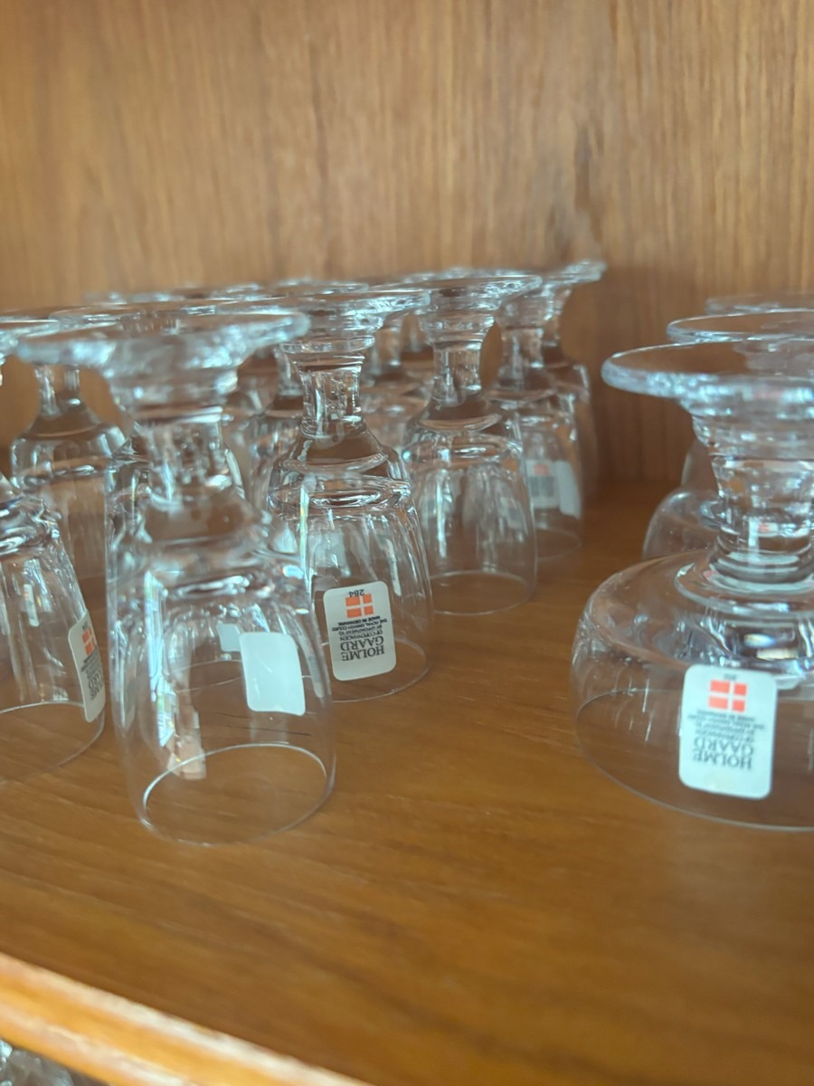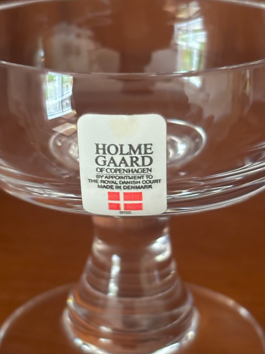 Holmegaard Almue glas. Bl. a. ældres sjusglas med logo. I alt ca. 70 glas samt andet bartilbehør.