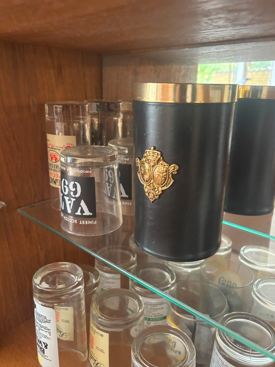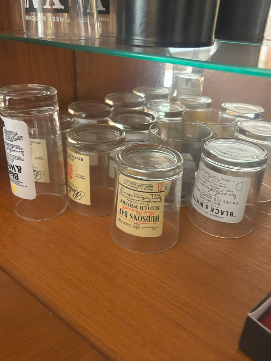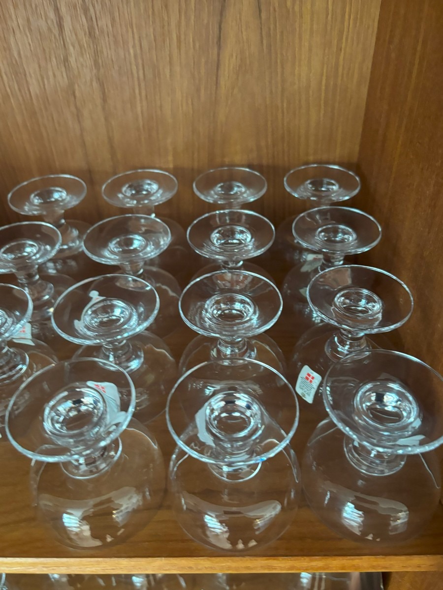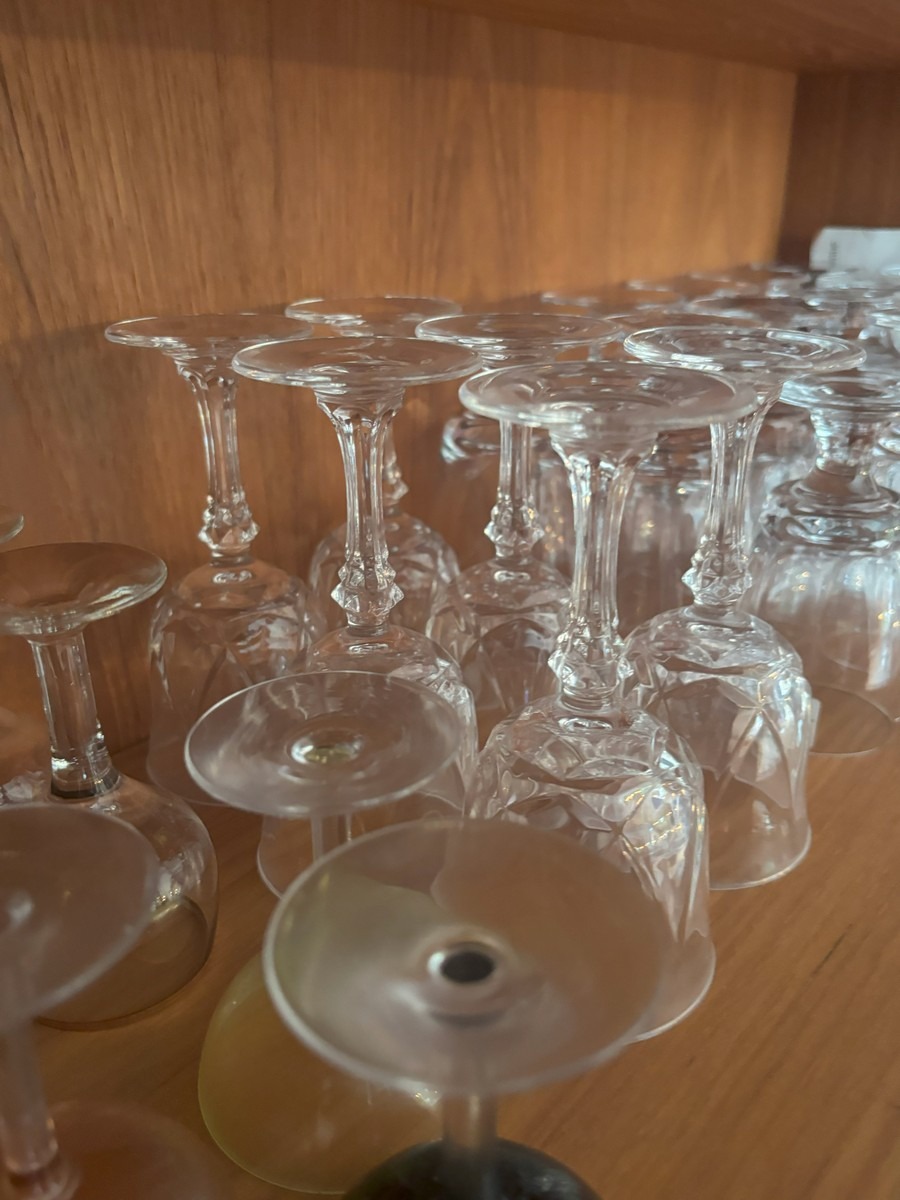 Holmegaard Almue glas. Bl. a. ældres sjusglas med logo. I alt ca. 70 glas samt andet bartilbehør.