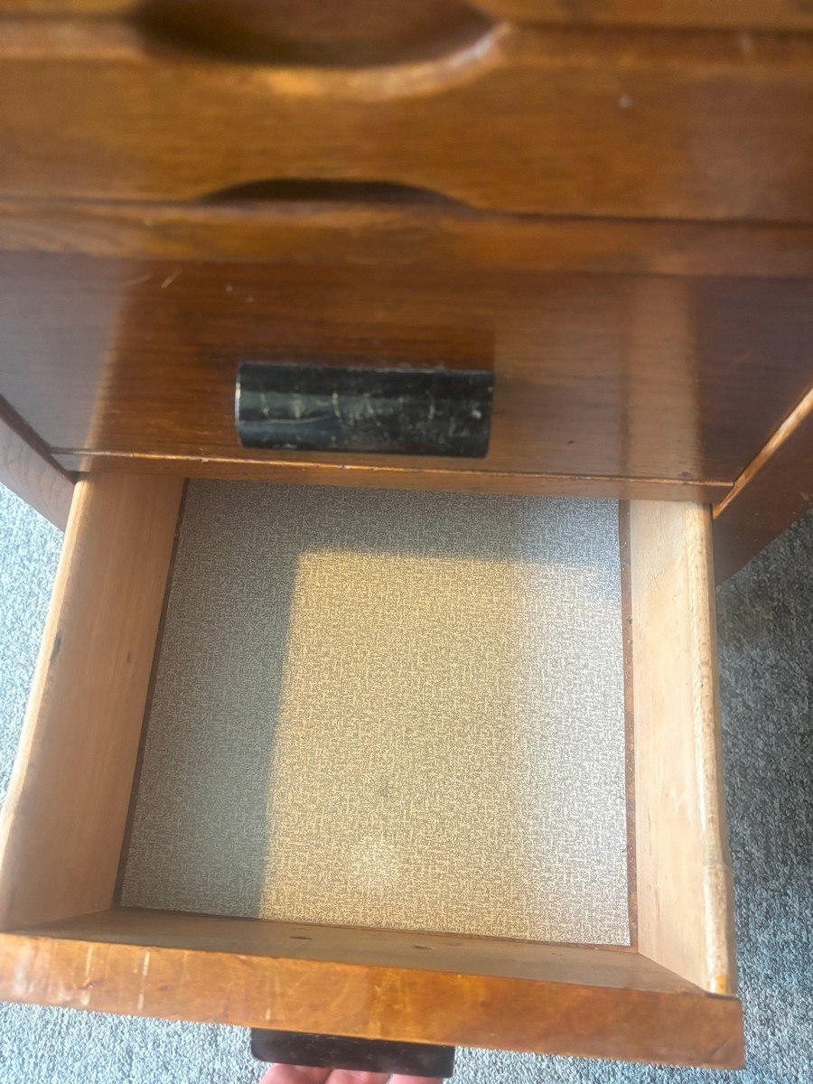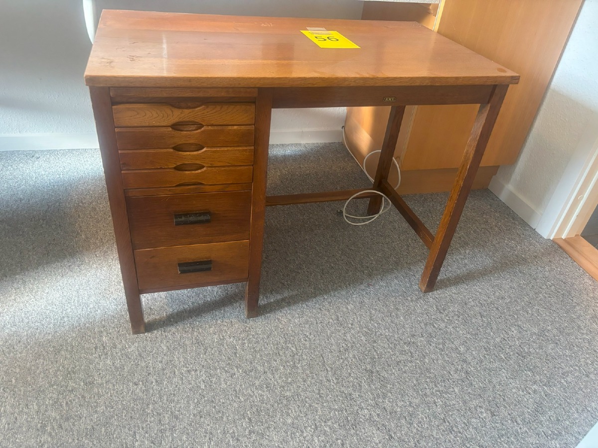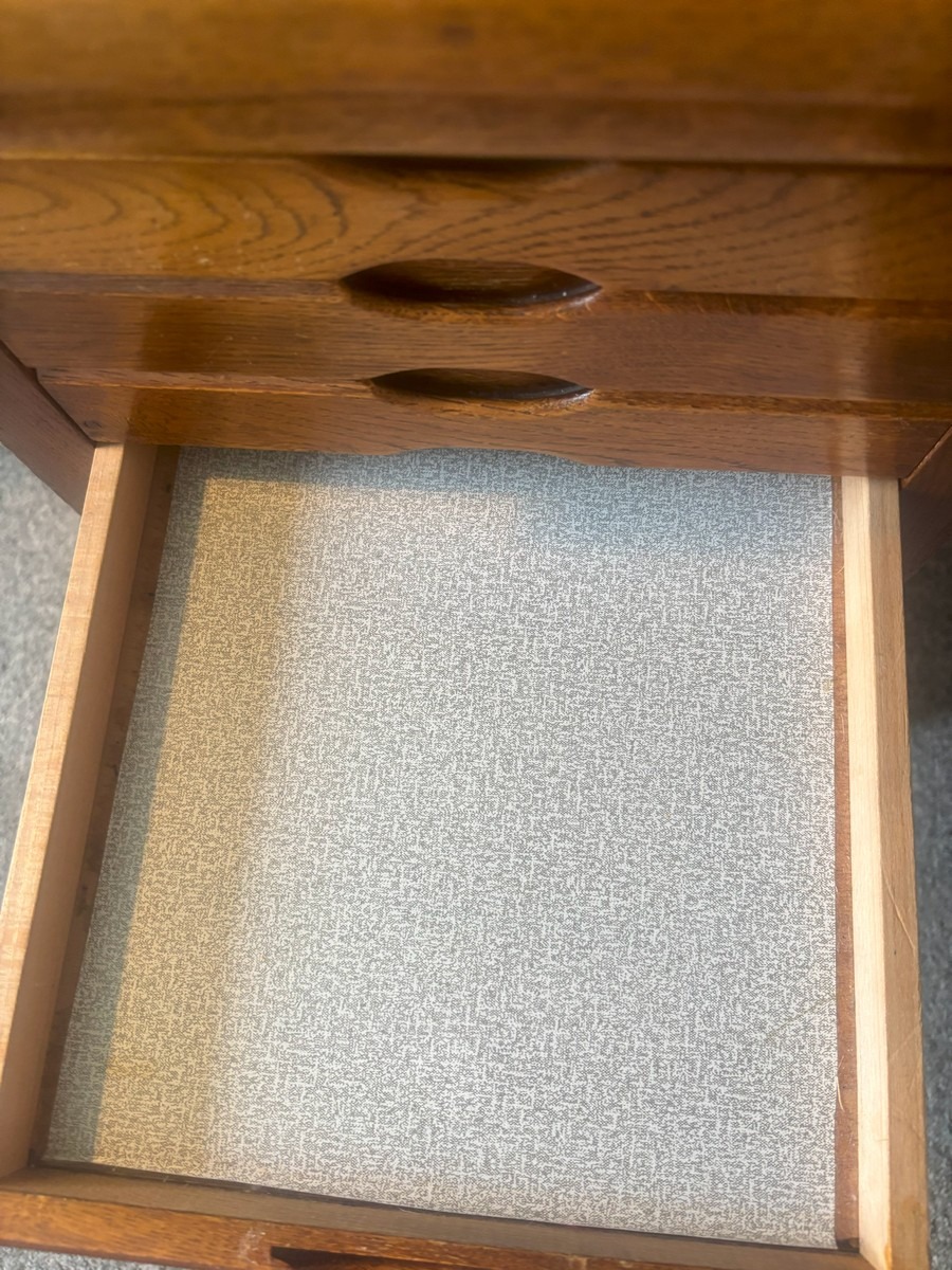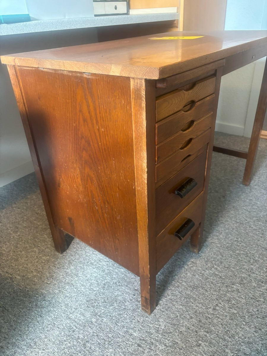 Lille skrivebord af eg. med 6 skuffer i front samt udtræksplade. H. 68, B. 89, D. 47 cm.