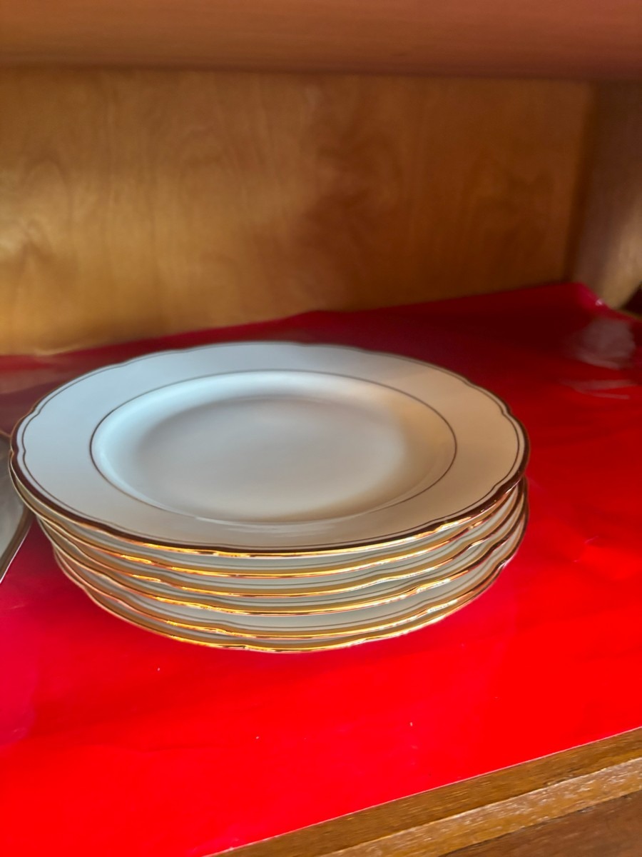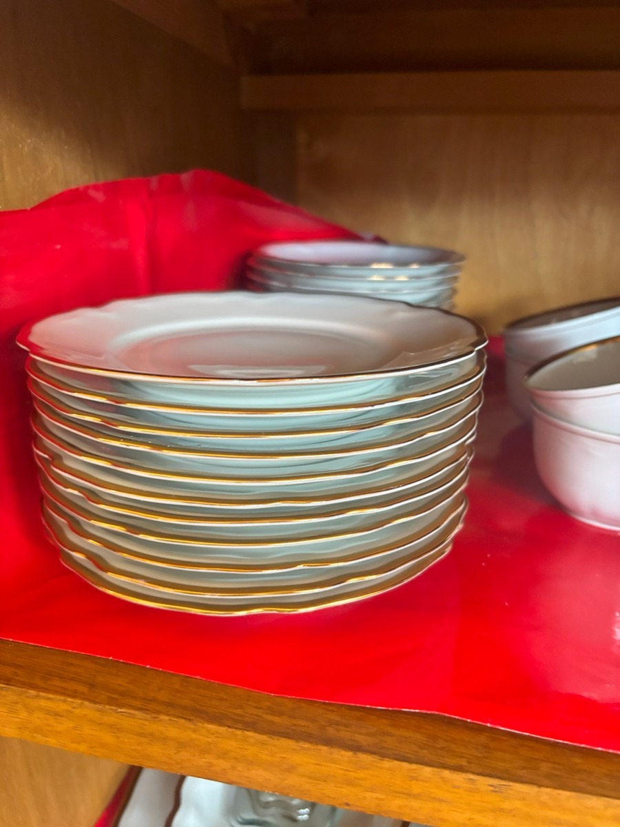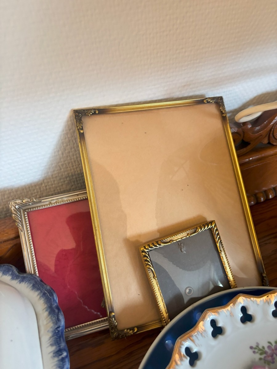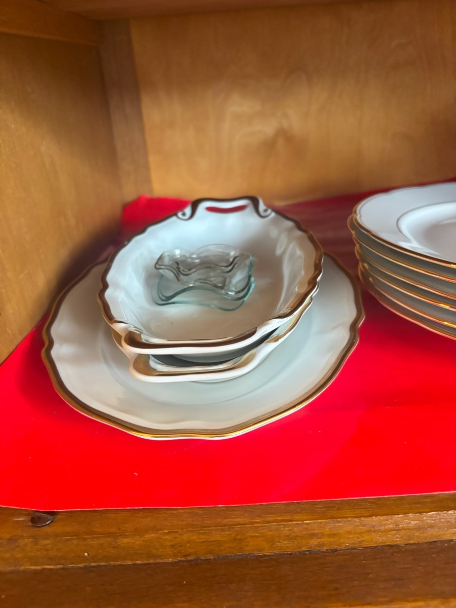 Lot med blandet indbo. Olie på lærred. Diverse steldele med guldkant, forskellige fade samt mindre nips og bordlampe af hvid porcelæn.